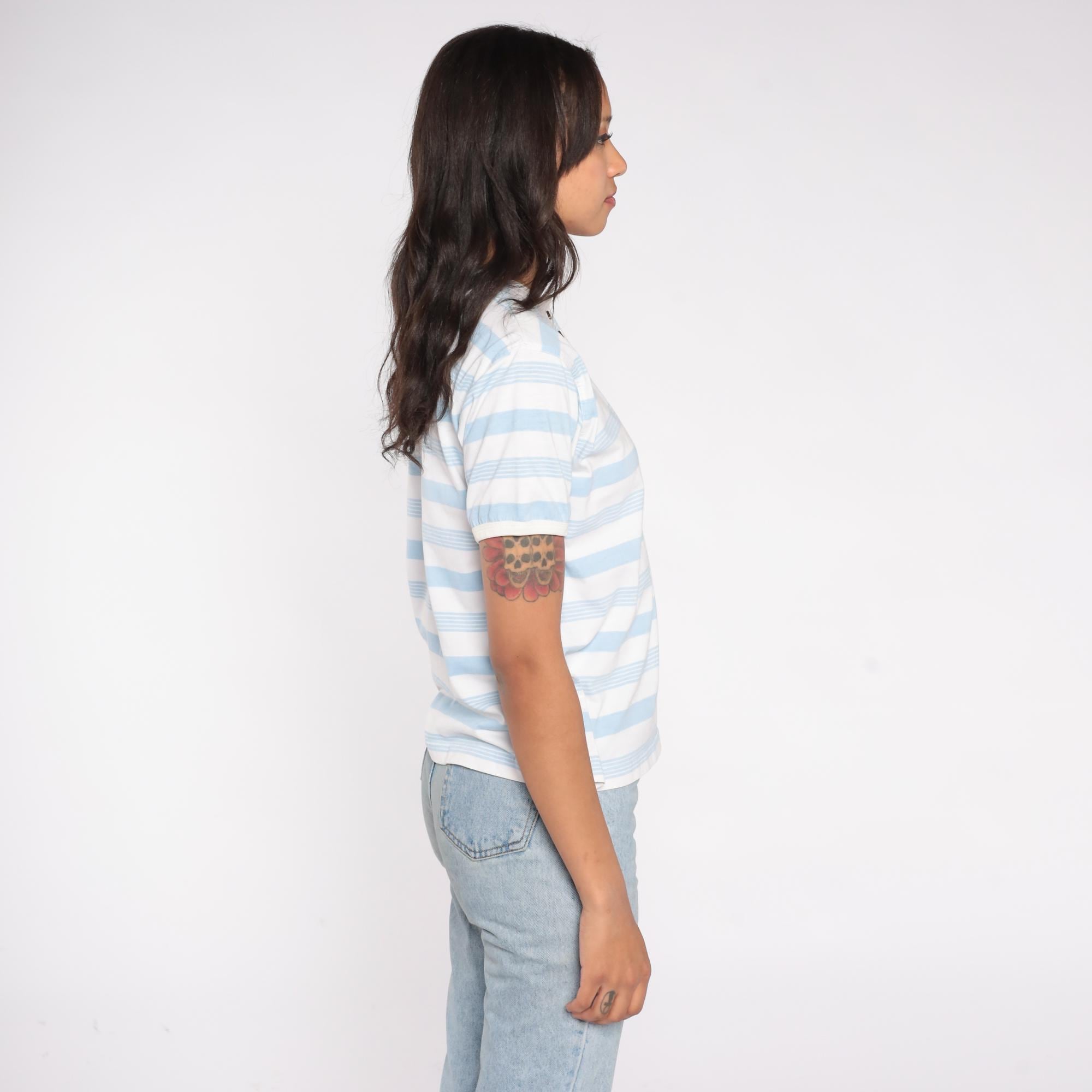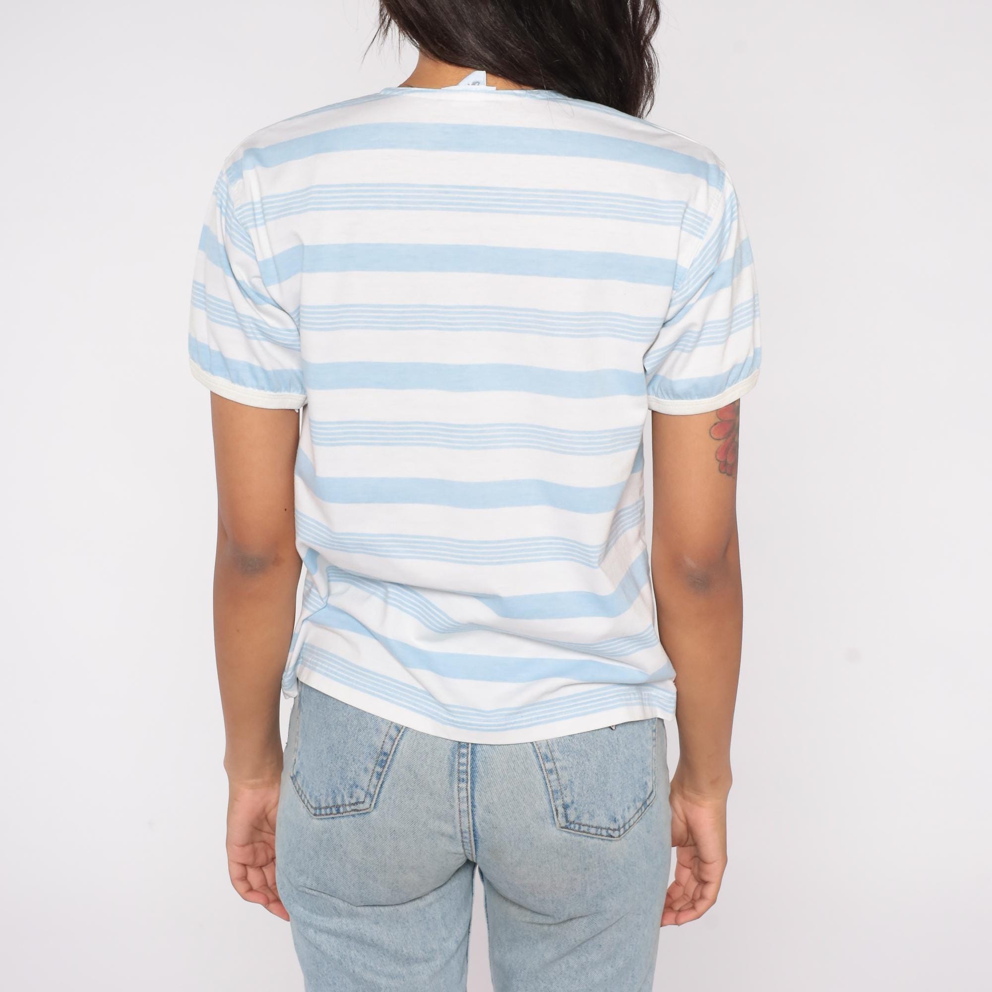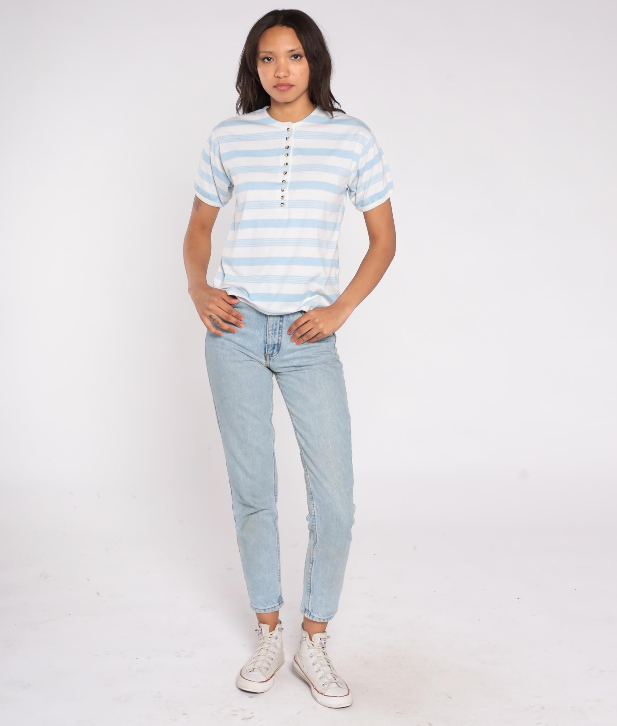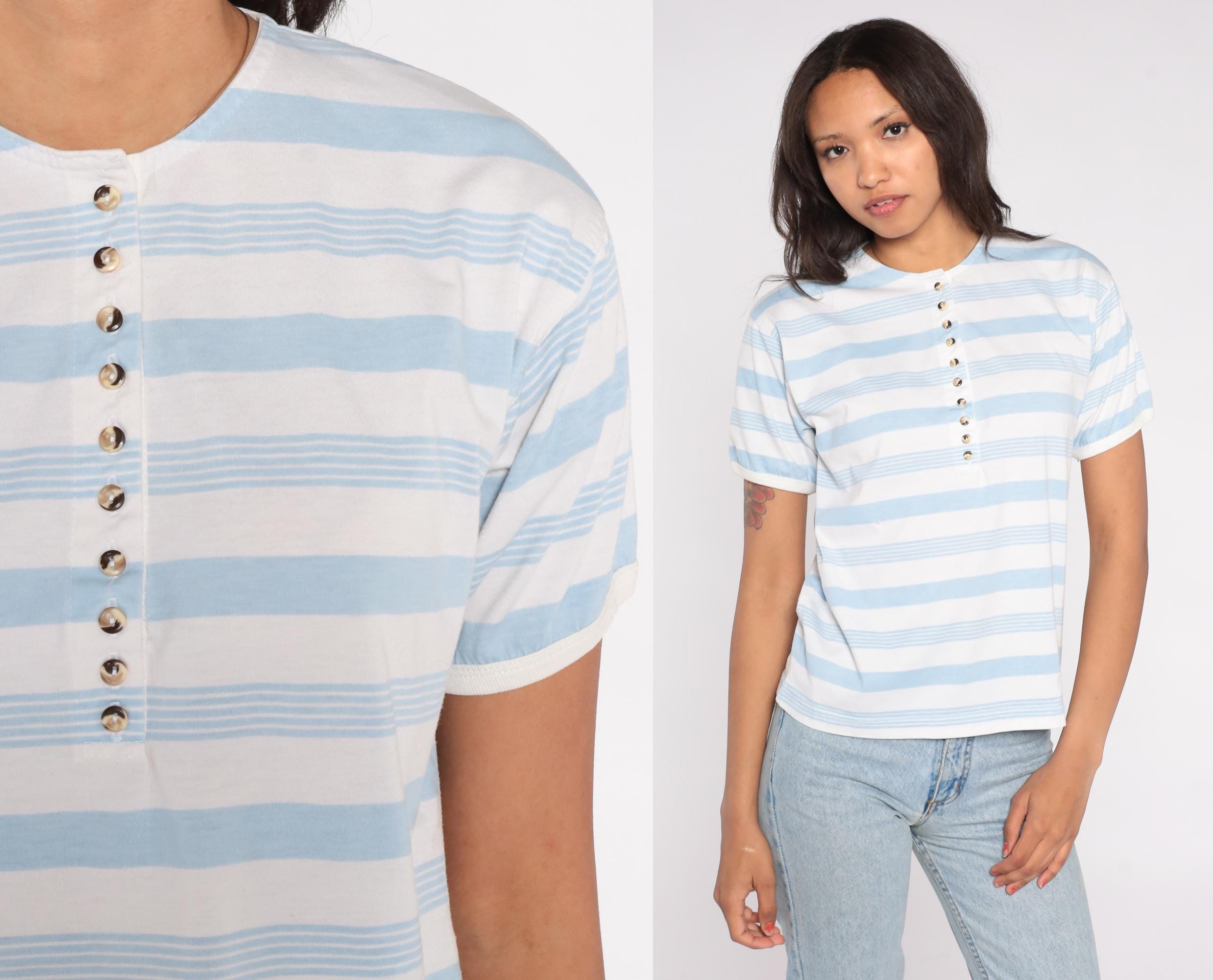 90s blue and white striped henley top from Contemporary Casuals. Features horizontal stripe pattern in pastel baby blue and white with vertical multi-stripe detail. Button front placket with 10 buttons. Short sleeves with classic crewneck.