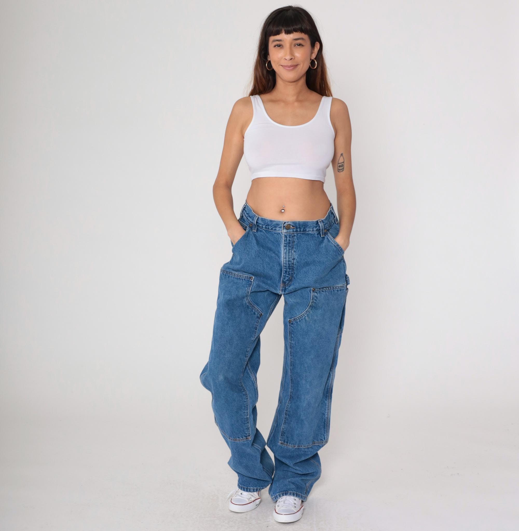 Vintage 90s jeans by Carhartt in blue denim with a double front knee and a hammer loop. Relaxed straight leg.