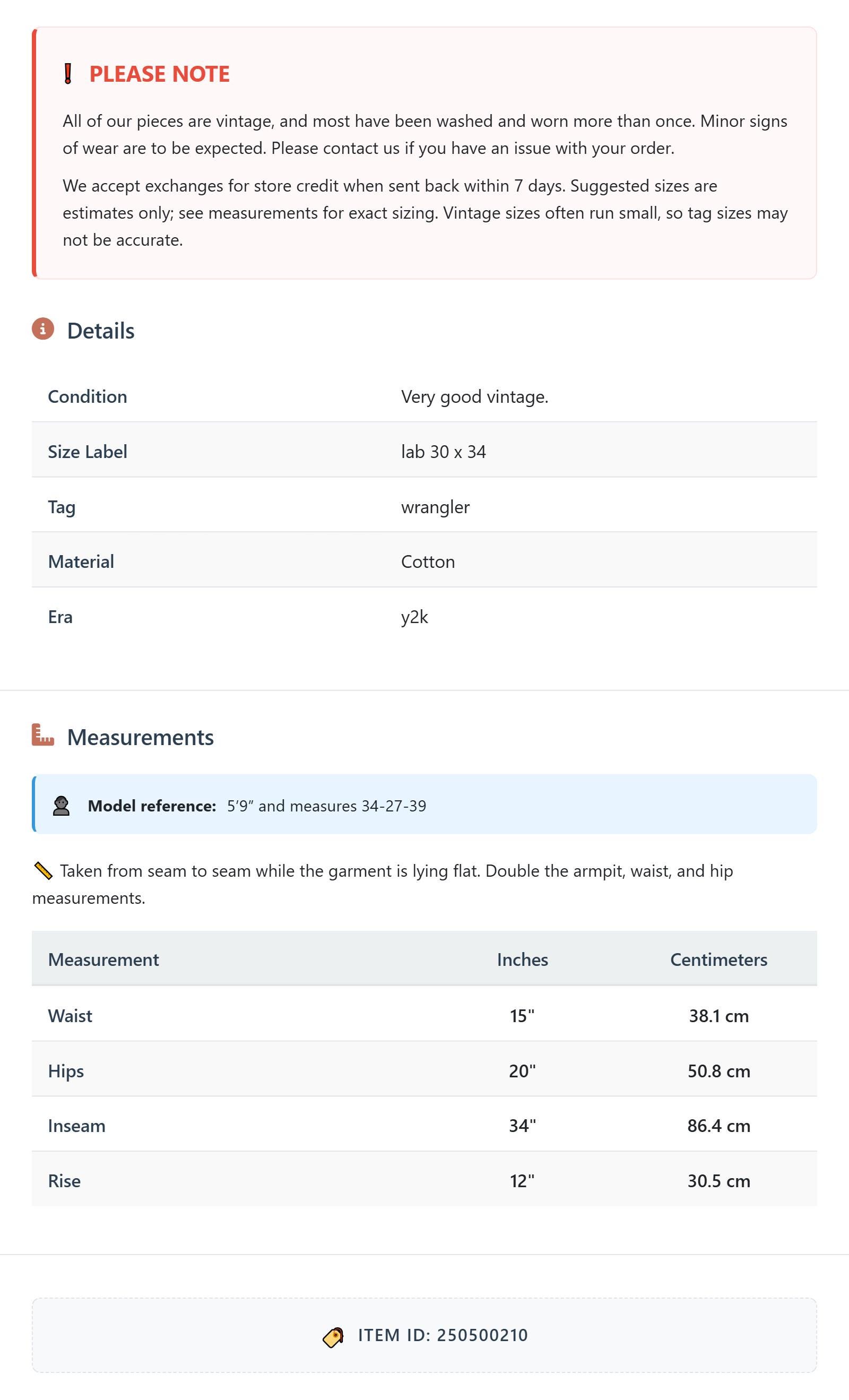 Vintage denim was usually made without any stretch, unlike modern jeans. Check the measurements to ensure proper fit, and remember to give yourself a little wiggle room in the waist and hips, depending on your preferred fit.