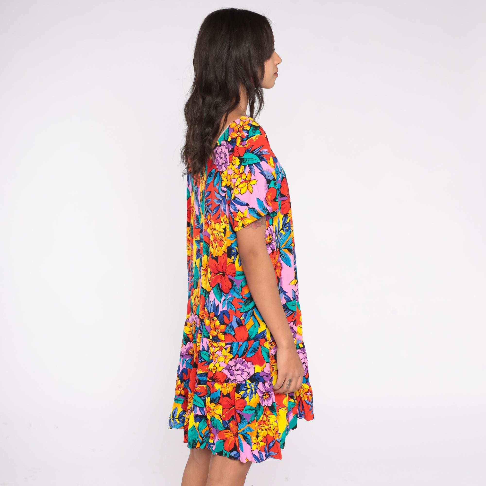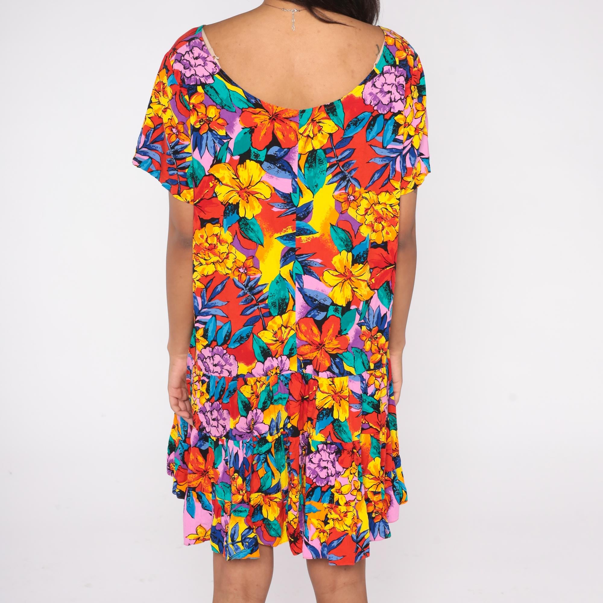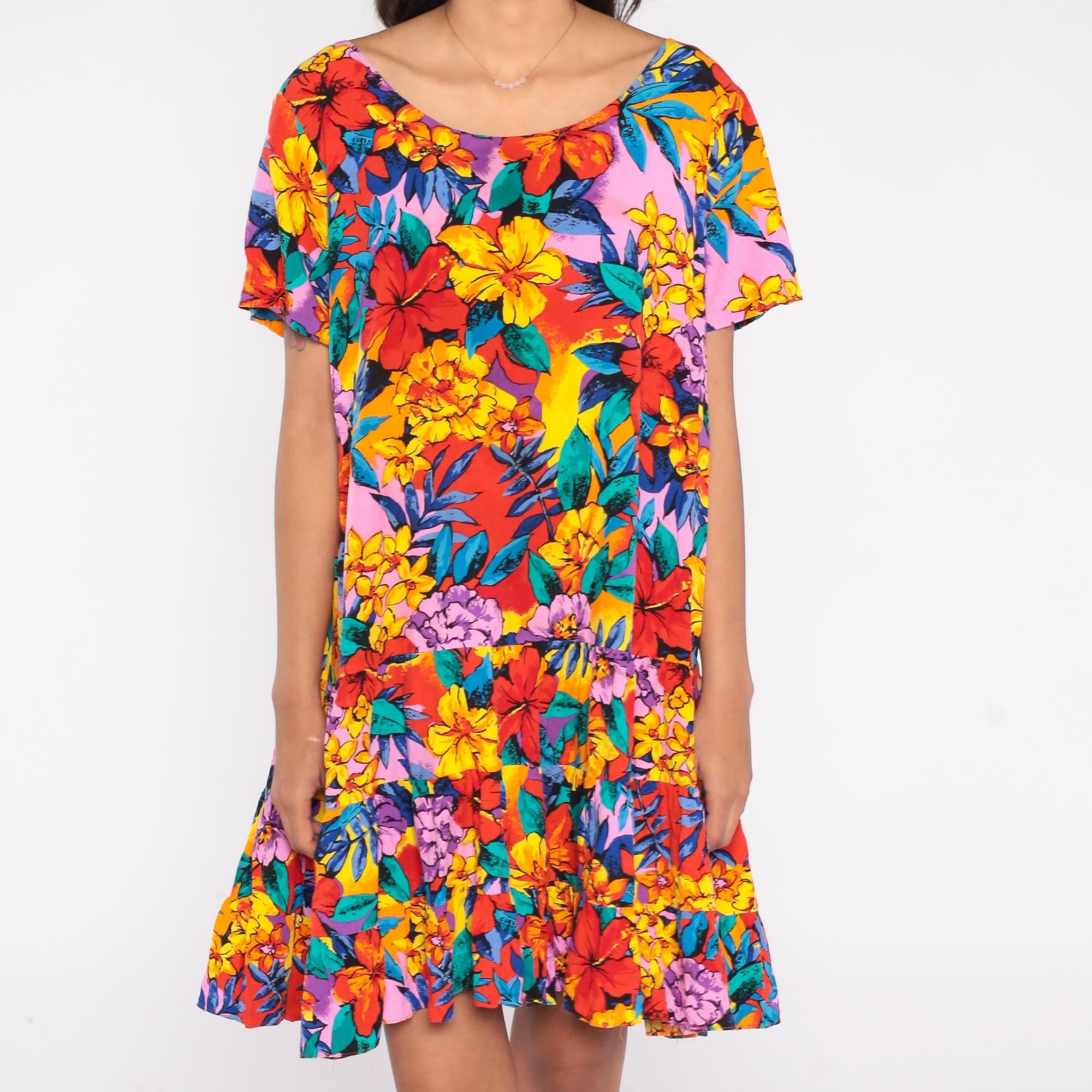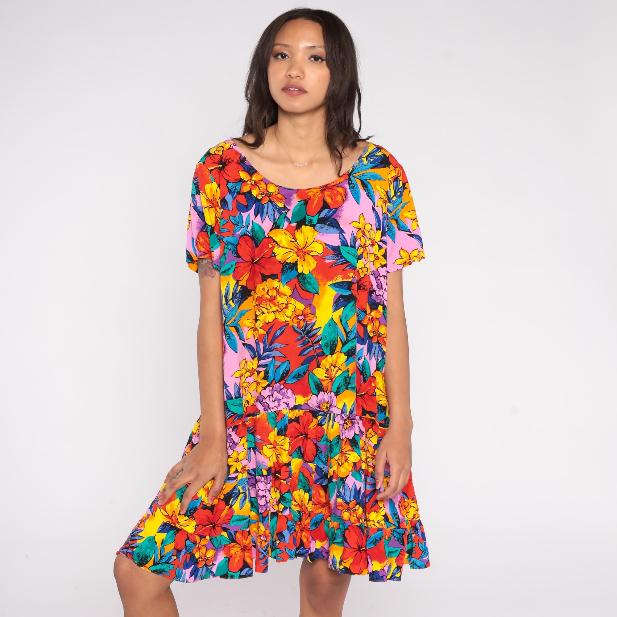 90s drop waist dress in vibrant tropical floral print. Features bold hibiscus flowers in red, yellow, and purple with teal leaves on a multicolored background. Short sleeves and scoop neckline. Elastic gathering at drop waist creates a tiered effect with ruffle hem.