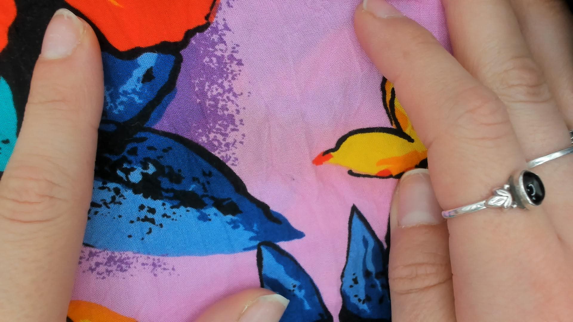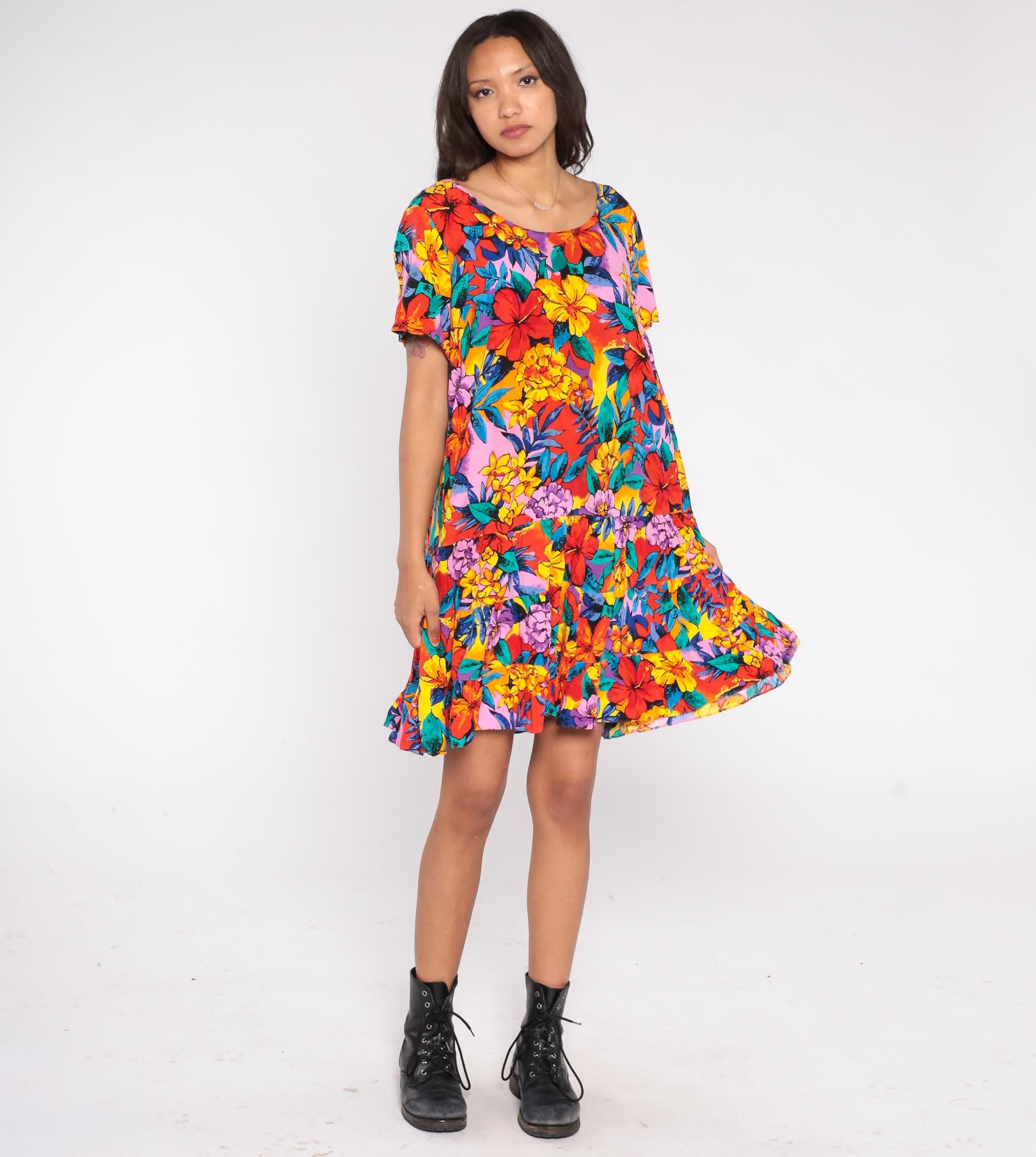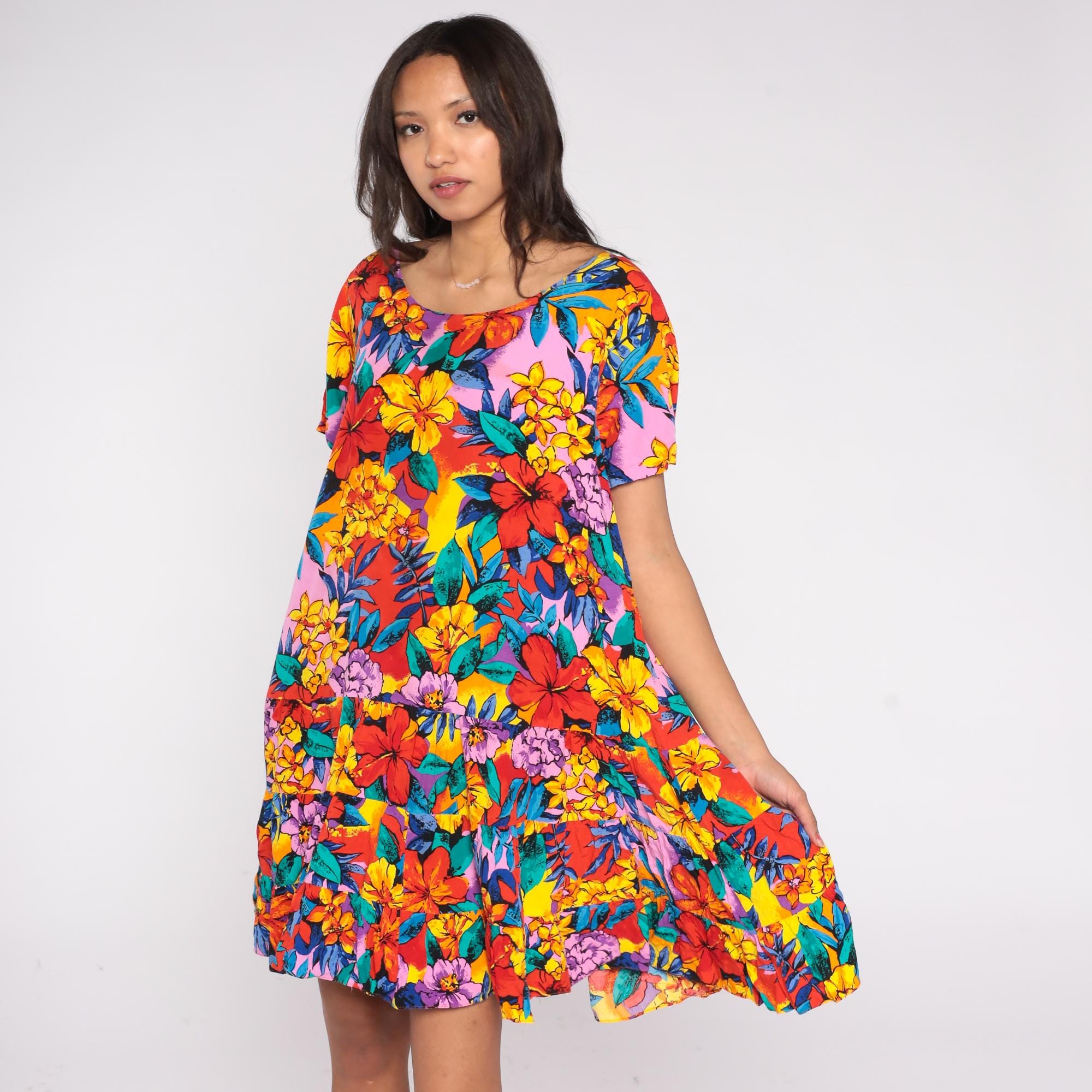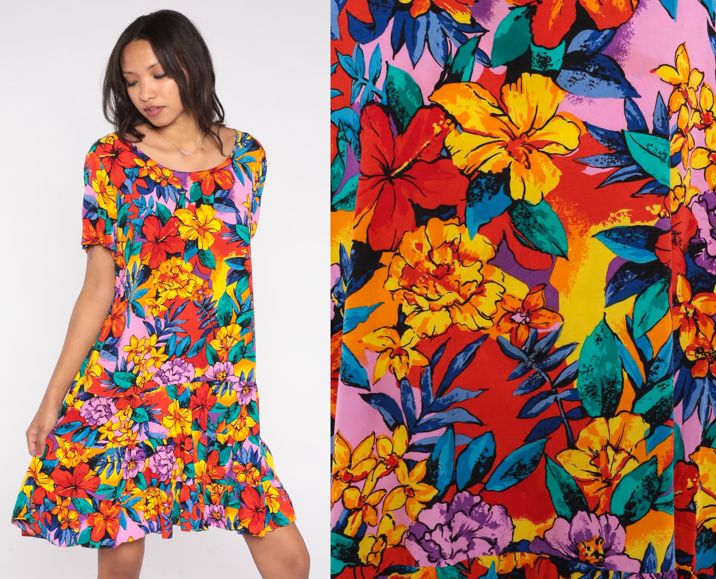 90s drop waist dress in vibrant tropical floral print. Features bold hibiscus flowers in red, yellow, and purple with teal leaves on a multicolored background. Short sleeves and scoop neckline. Elastic gathering at drop waist creates a tiered effect with ruffle hem.