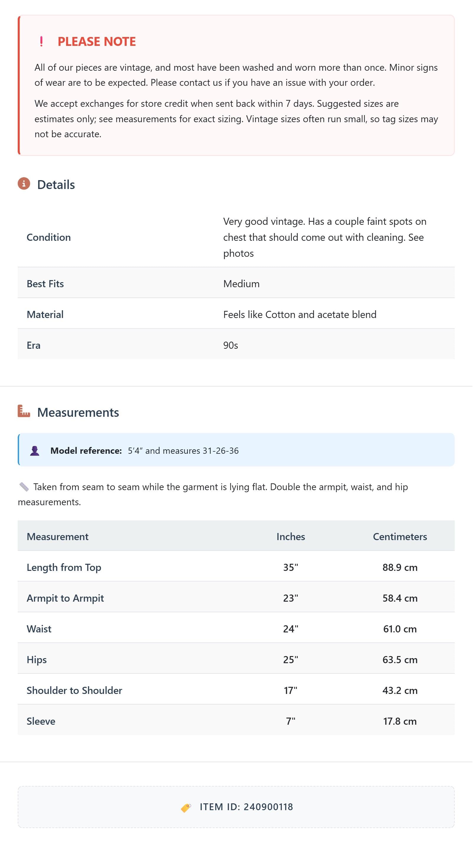 All of our pieces are vintage, and most have been washed and worn more than once. Minor signs of wear are to be expected. Please contact us if you have an issue with your order. We accept exchanges for store credit when sent back within 7 days.