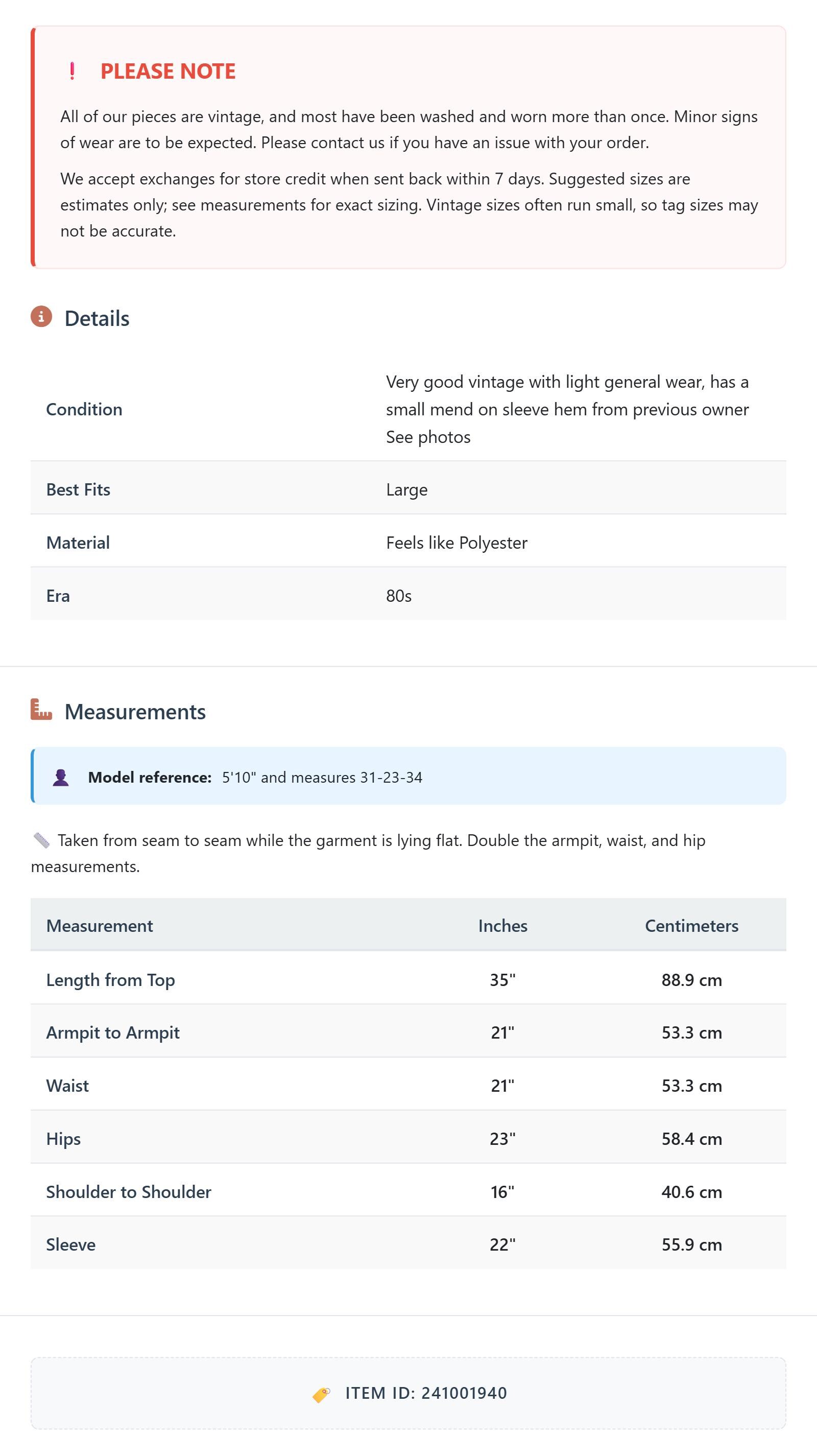 Suggested sizes are estimates only; see measurements for exact sizing. Vintage sizes often run small, so tag sizes may not be accurate.