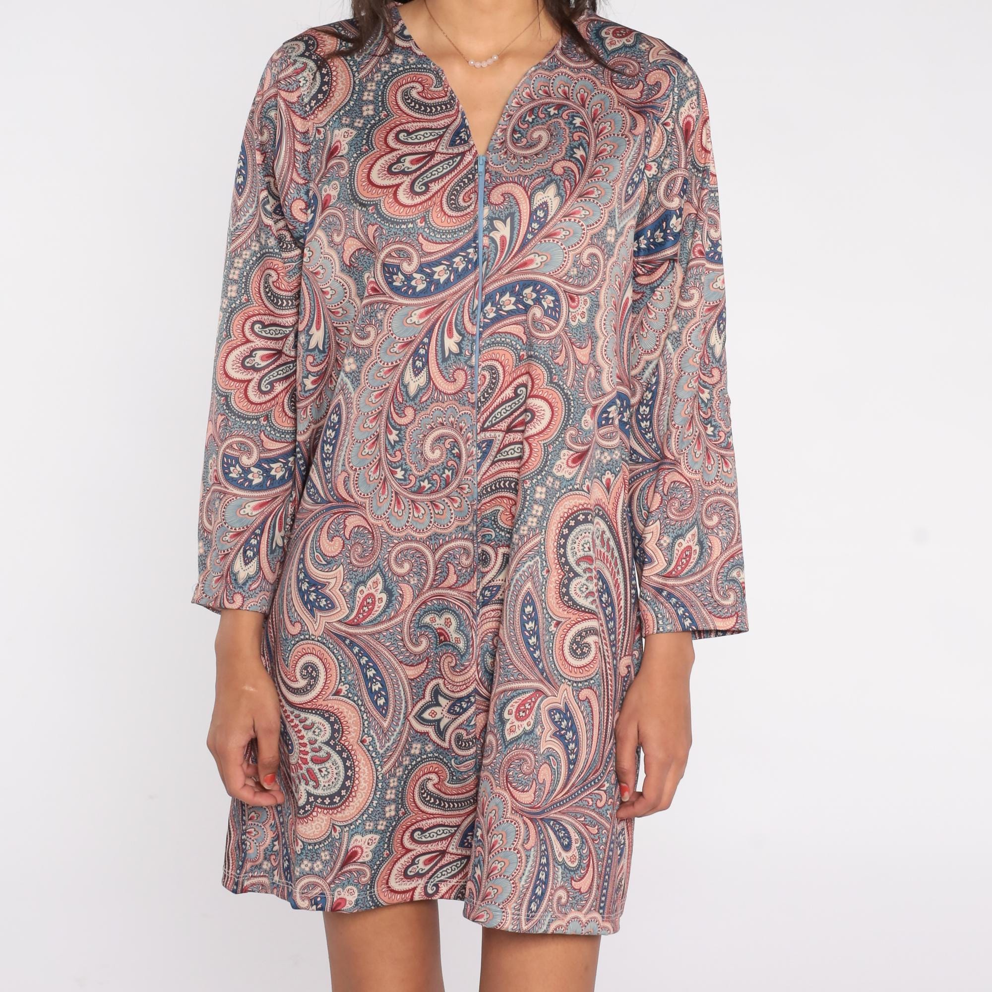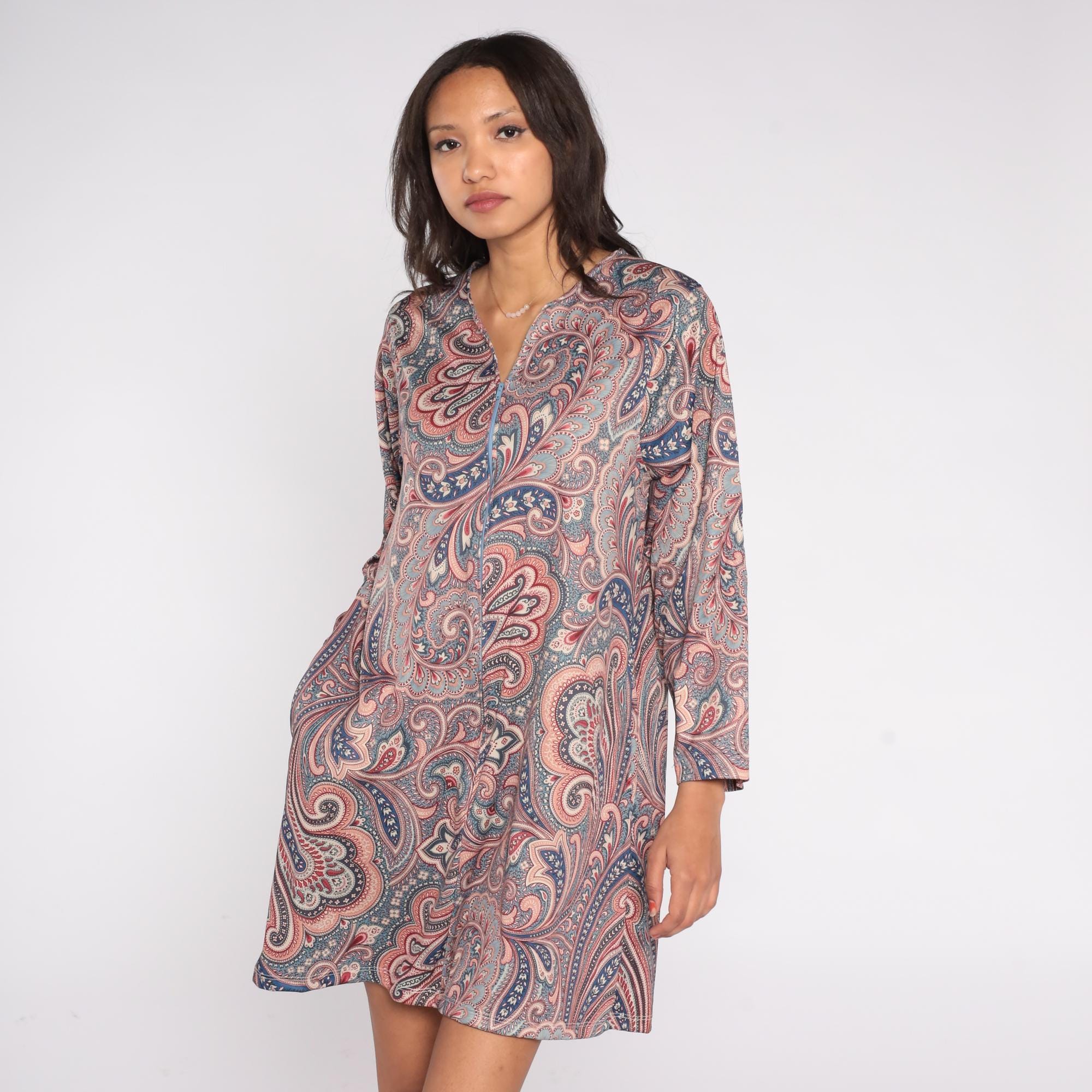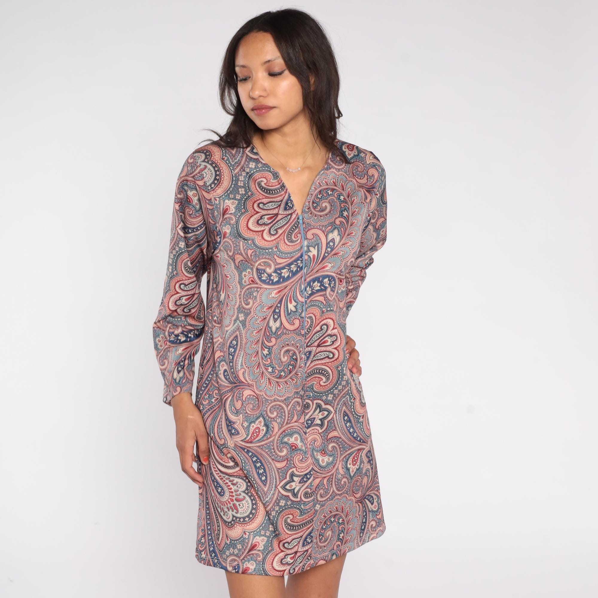 80s vintage paisley mini dress in beautiful blue and pink swirl pattern. Features elegant paisley design with intricate detailing throughout. V-neckline with zip-up front closure. Long sleeves with slight gathering. Straight shift silhouette with a tunic-like fit.