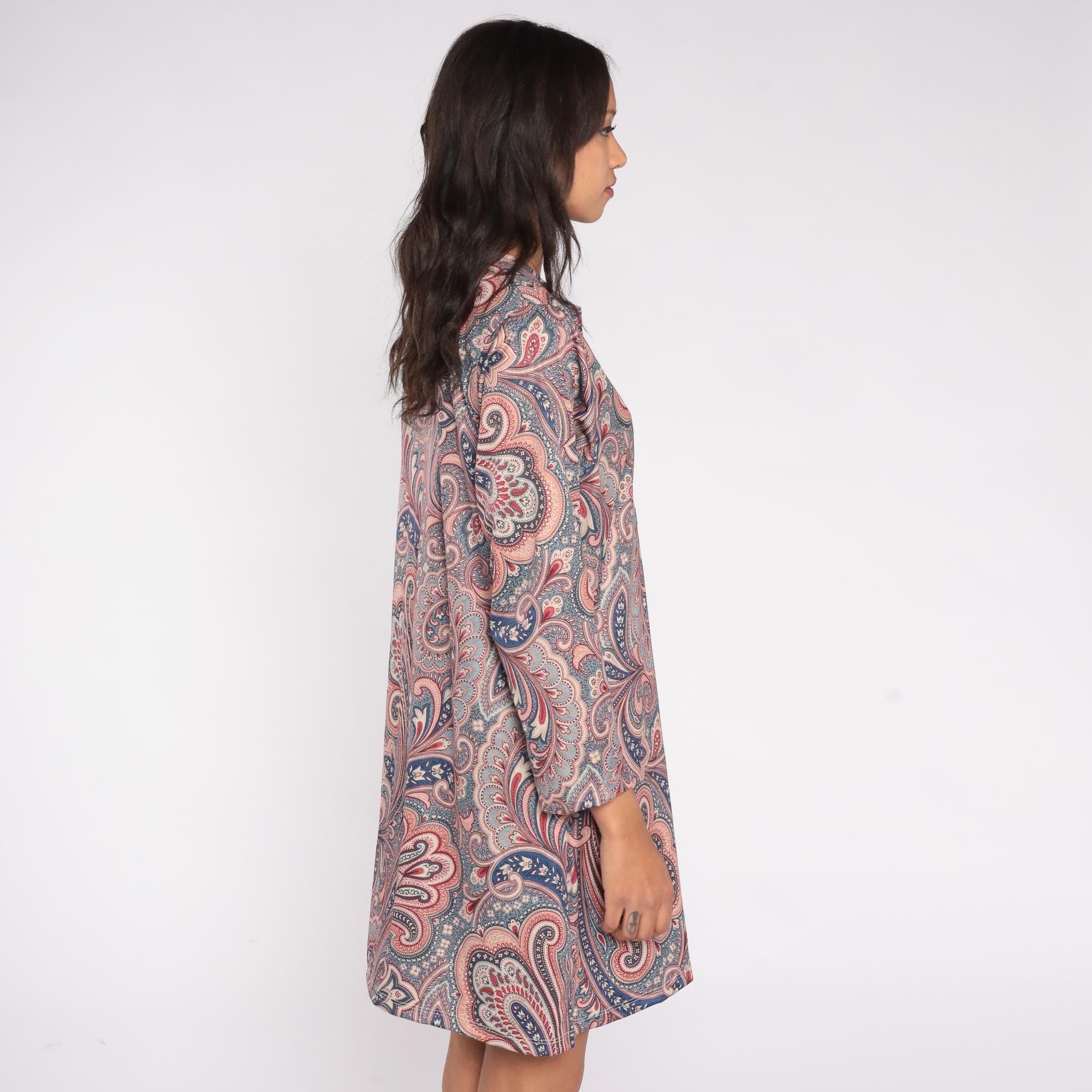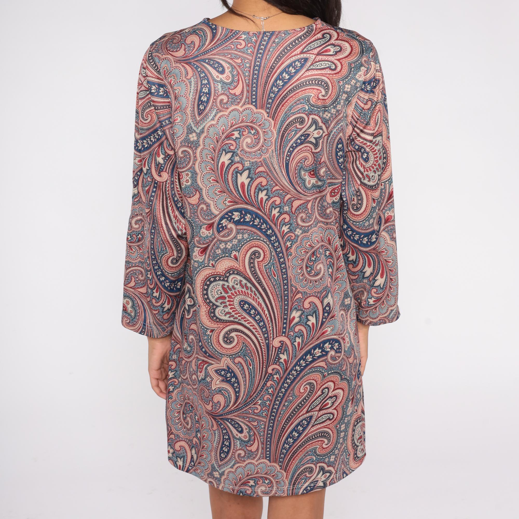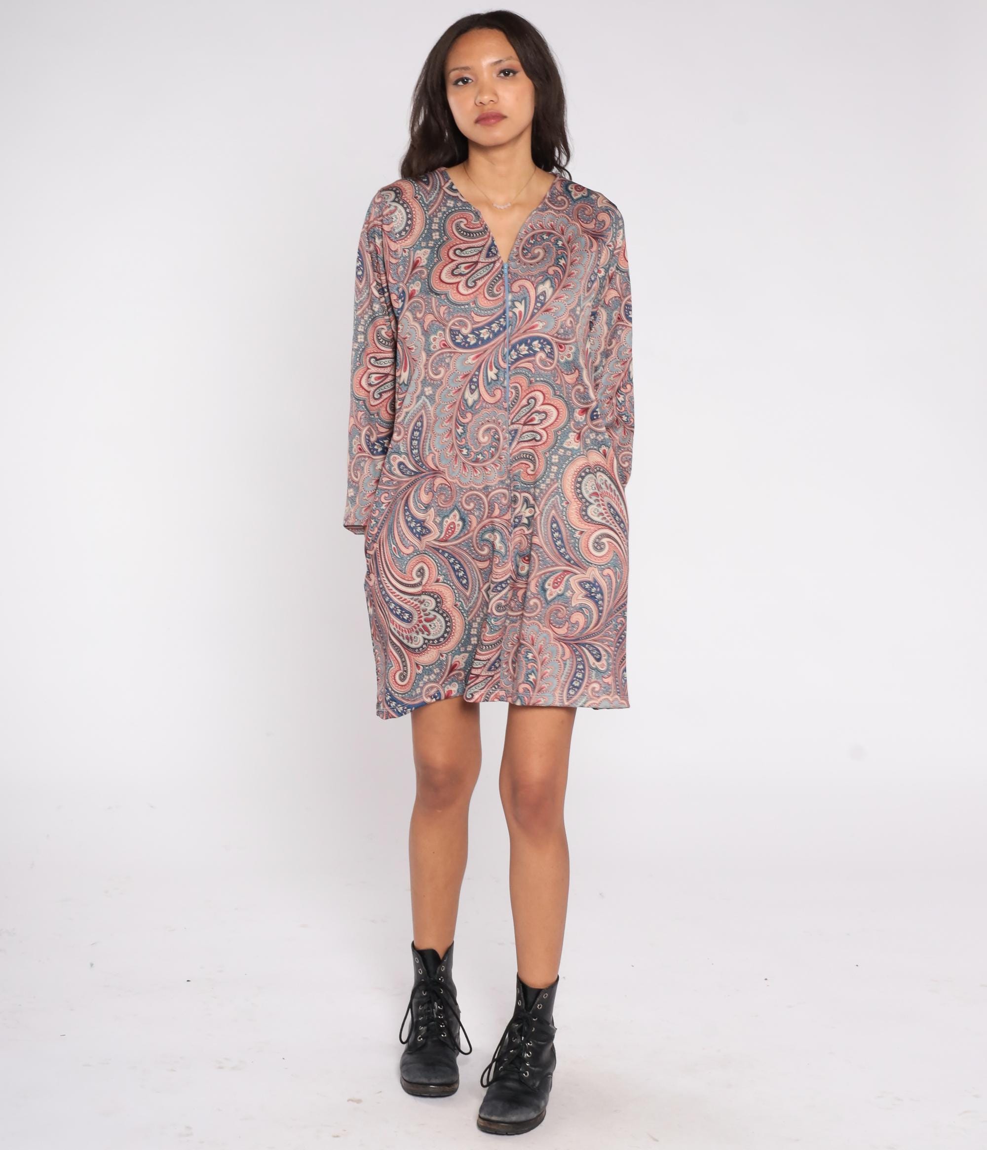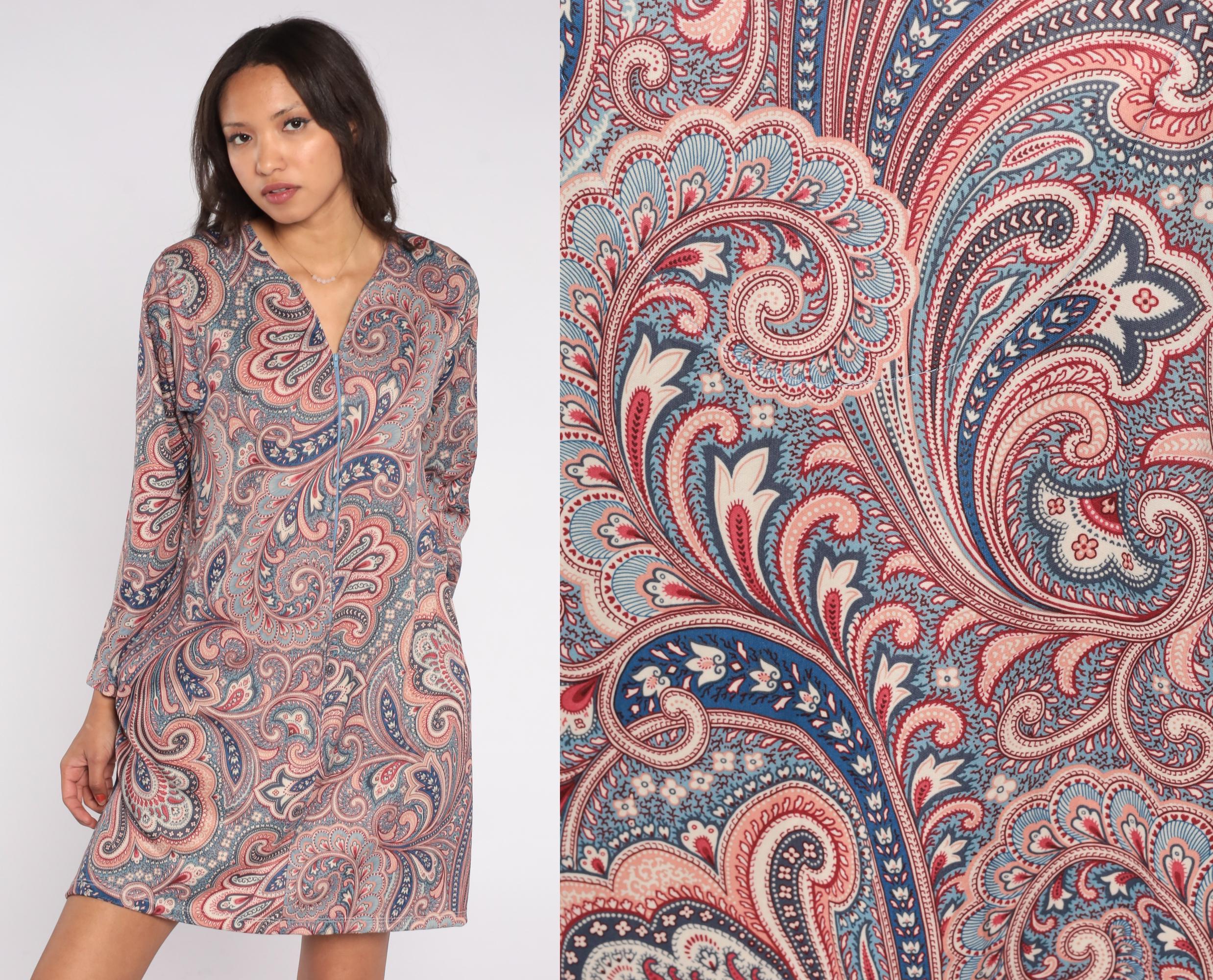 80s vintage paisley mini dress in beautiful blue and pink swirl pattern. Features elegant paisley design with intricate detailing throughout. V-neckline with zip-up front closure. Long sleeves with slight gathering. Straight shift silhouette with a tunic-like fit.