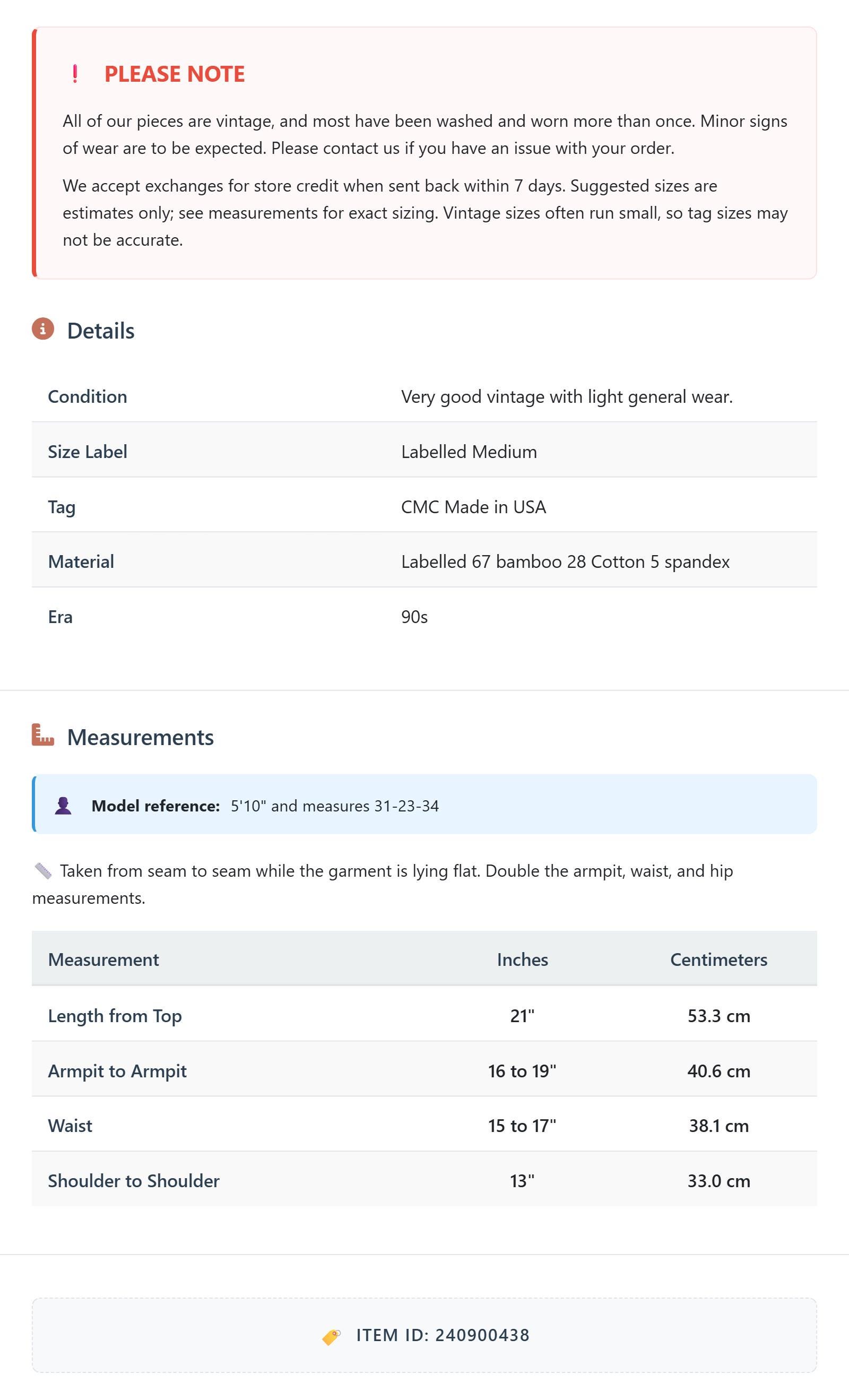 Suggested sizes are estimates only; see measurements for exact sizing. Vintage sizes often run small, so tag sizes may not be accurate.