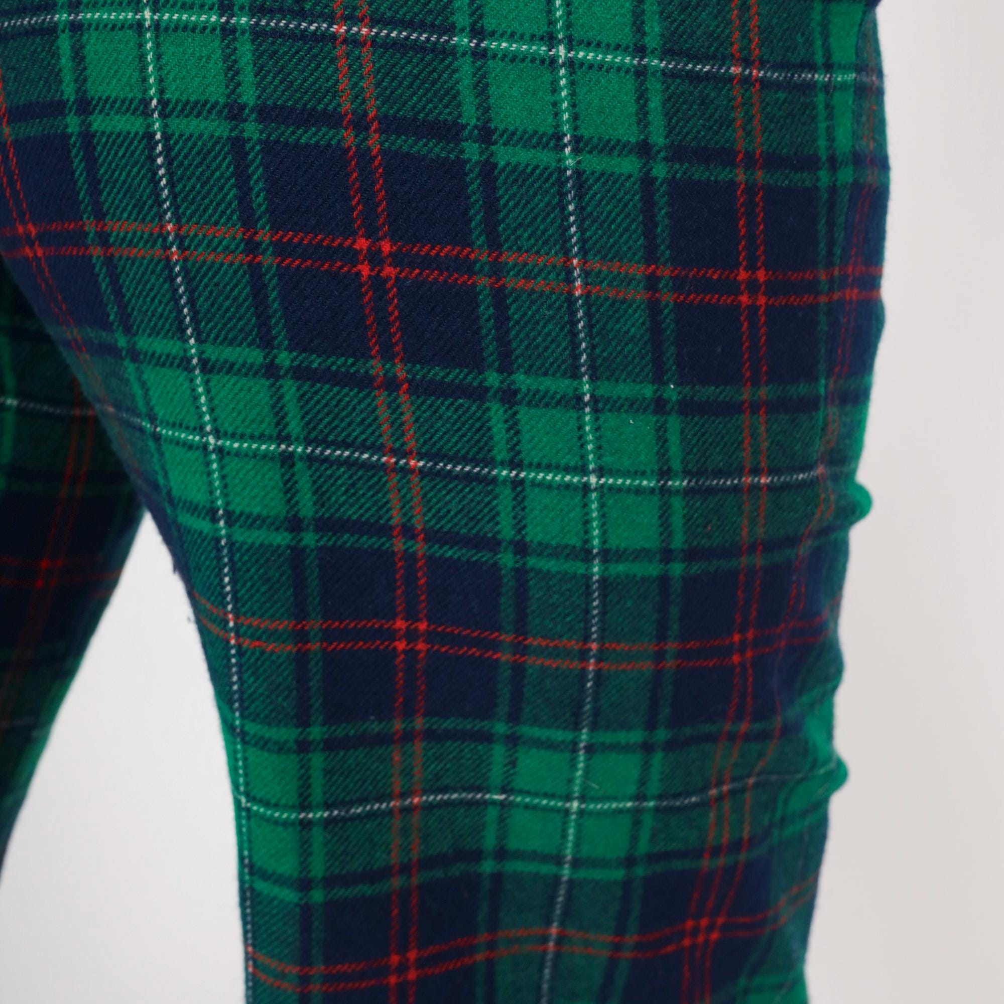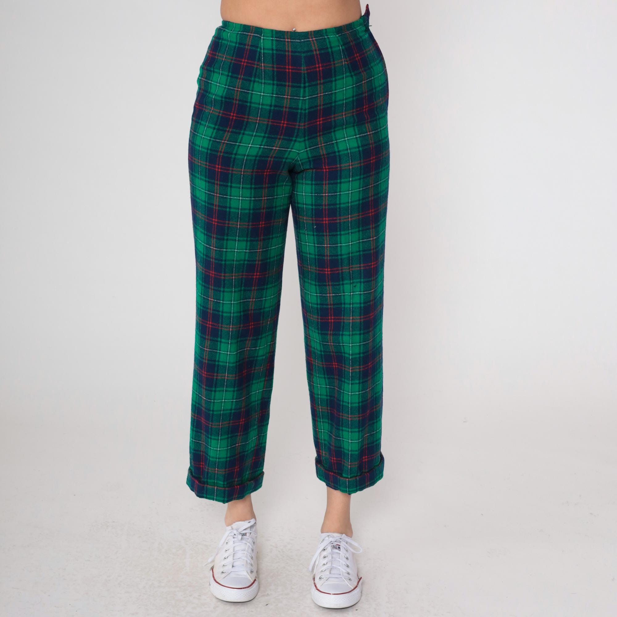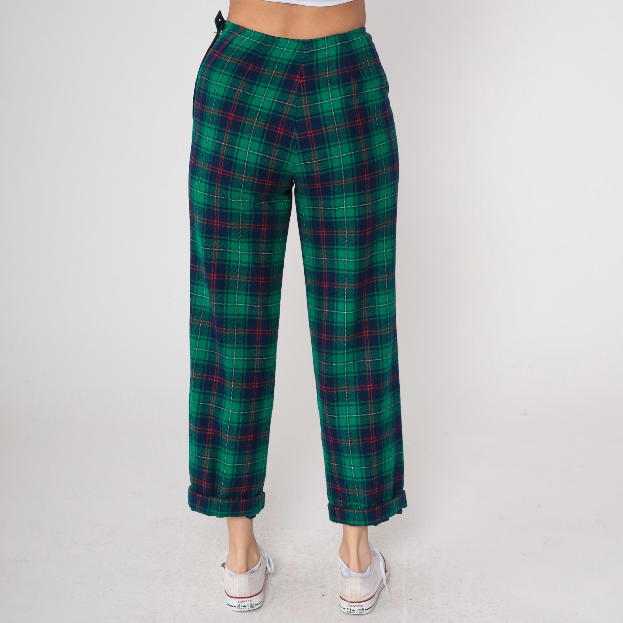 70s Pendleton wool pants in green, navy and red tartan plaid. High waisted style with side button closure. Cropped length with cuffed hem. Cotton lined for comfort. Classic Scottish check pattern.