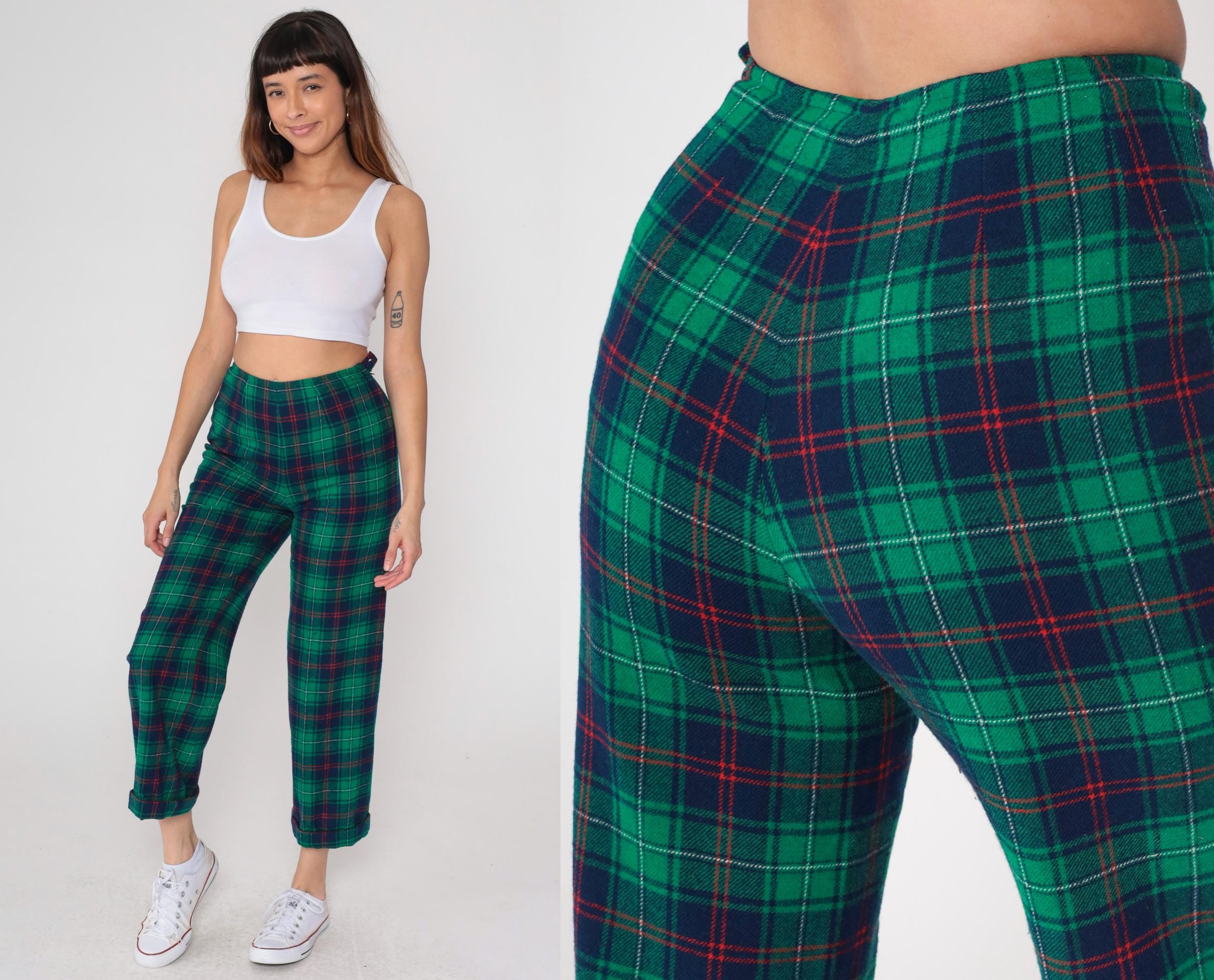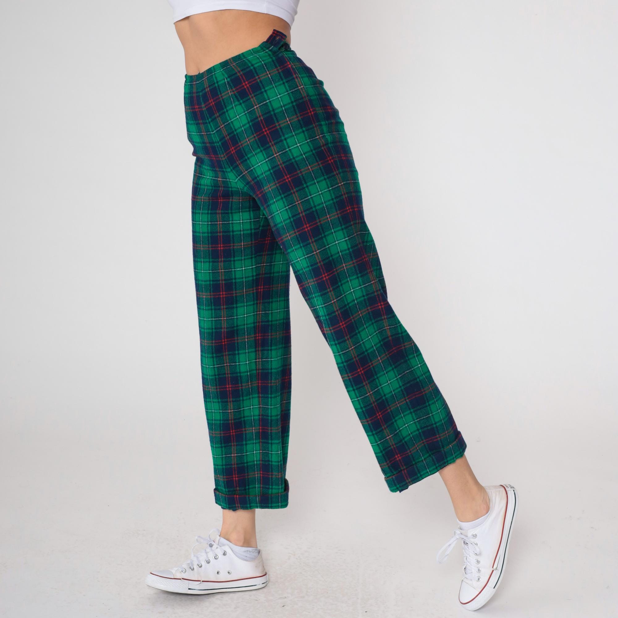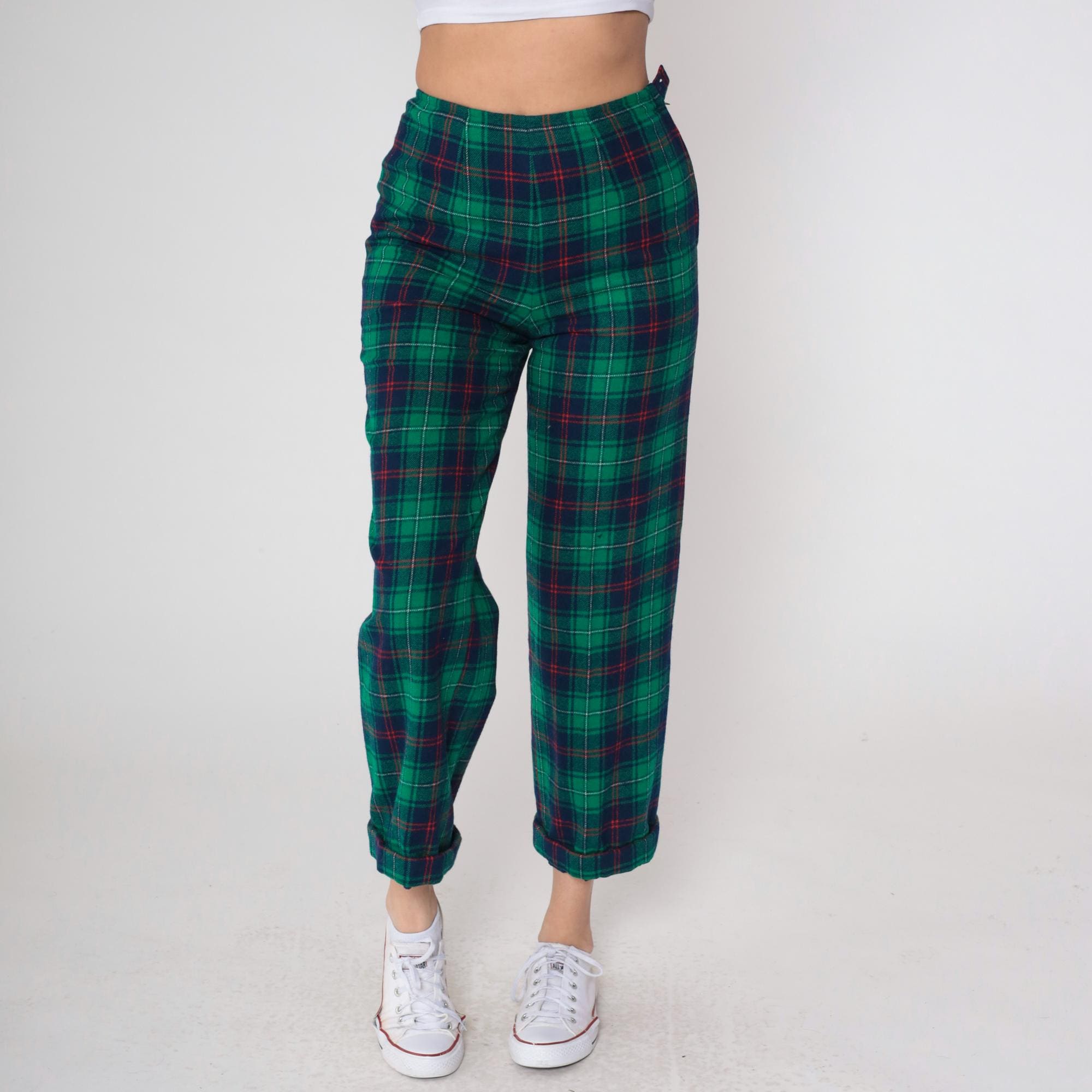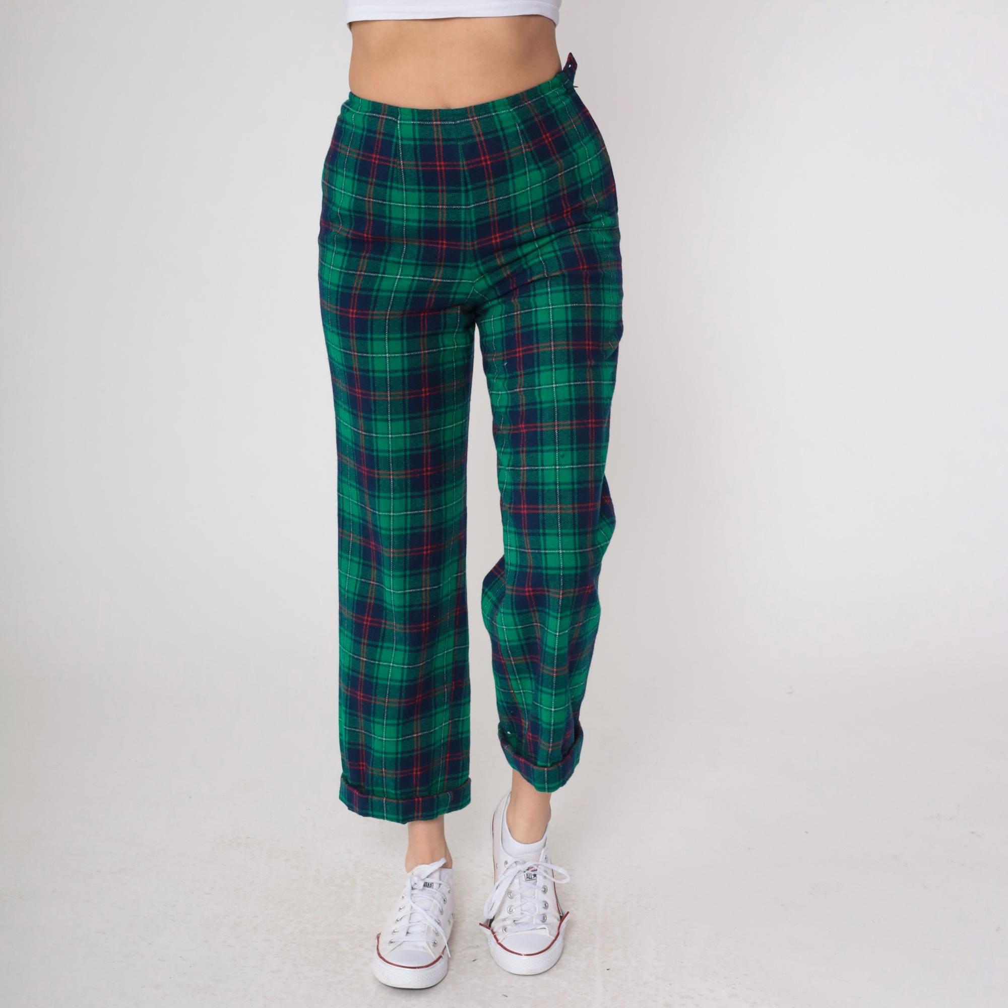 70s Pendleton wool pants in green, navy and red tartan plaid. High waisted style with side button closure. Cropped length with cuffed hem. Cotton lined for comfort. Classic Scottish check pattern.