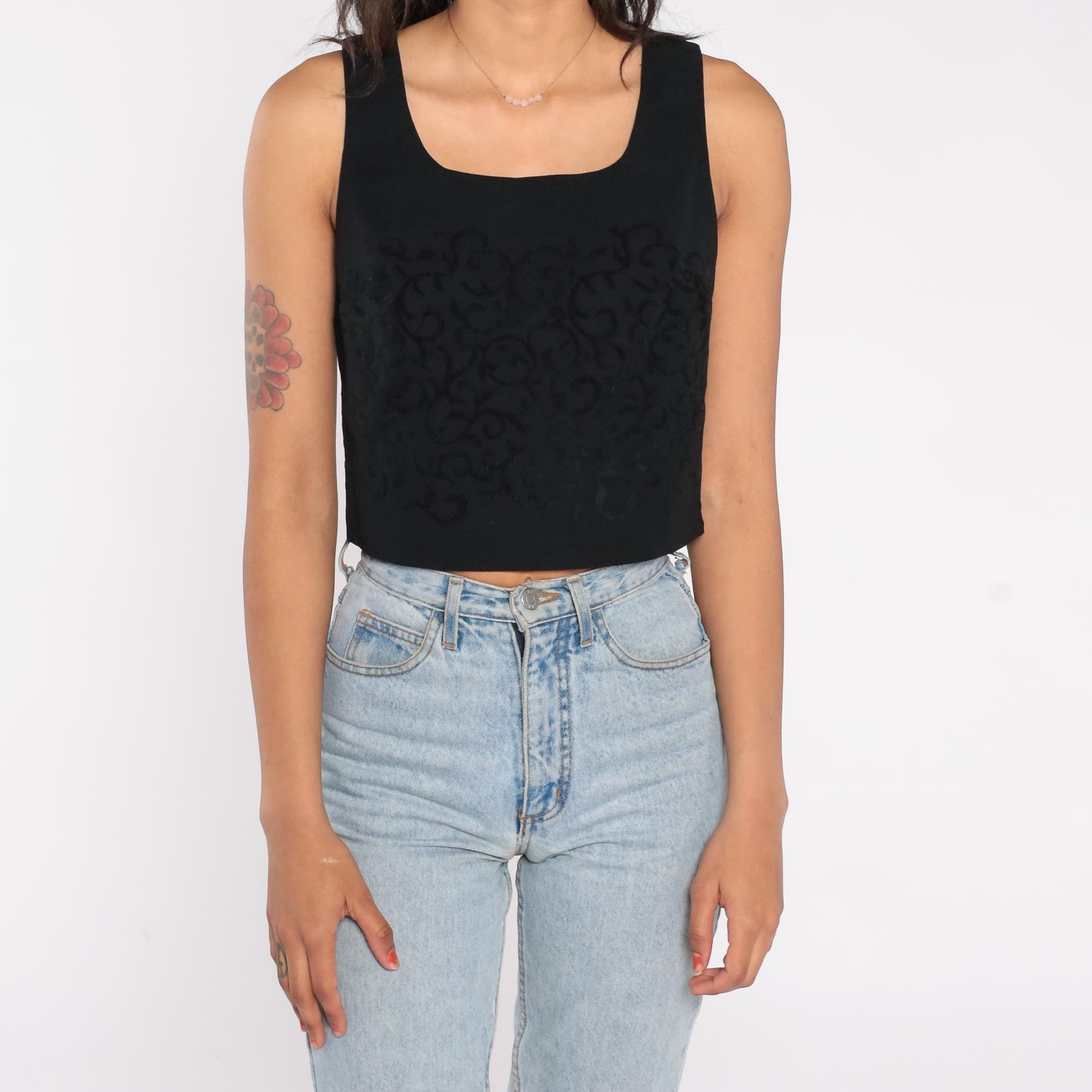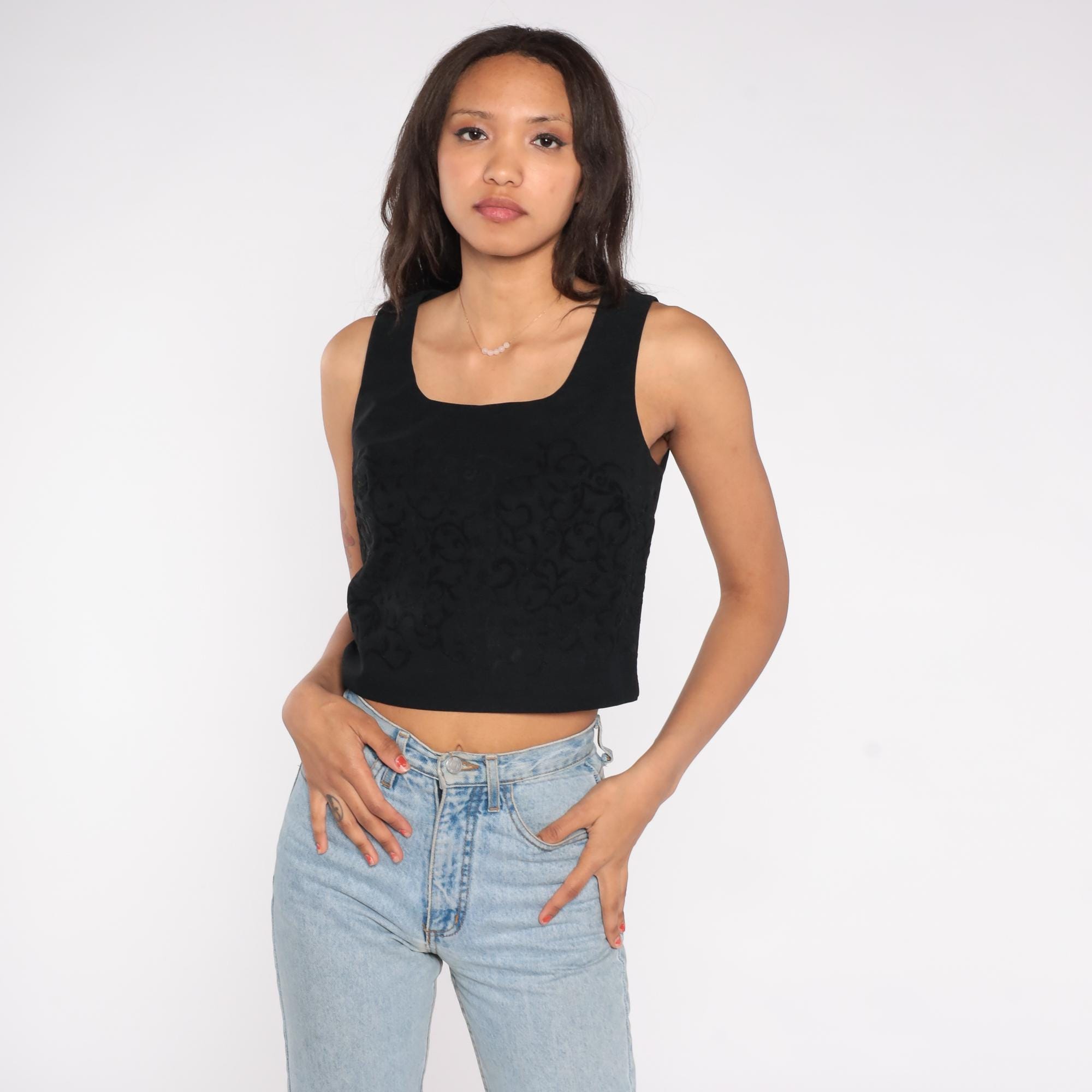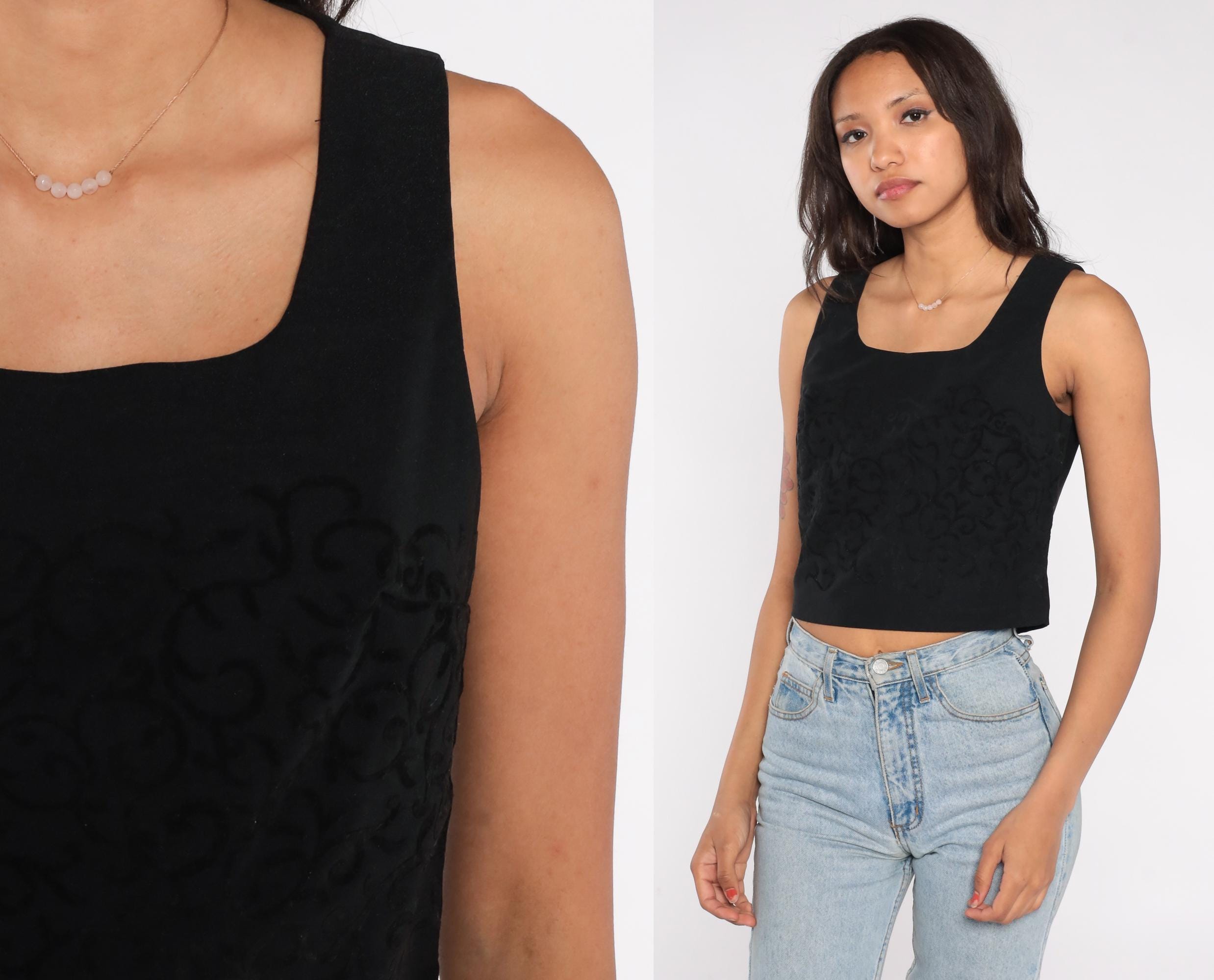 90s vintage textured crop top by XOXO In America and Abroad. Features subtle embossed floral jacquard pattern throughout for elegant dimension. Sophisticated square neckline with clean finished edges. Sleeveless design with structured fit. Back zipper closure.