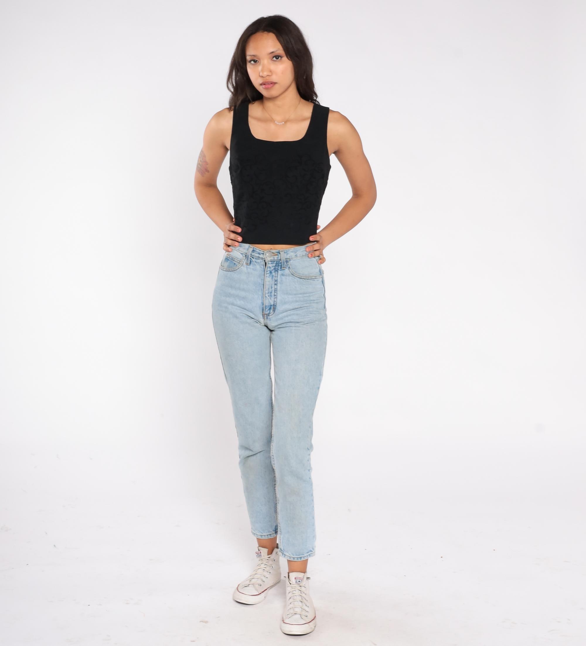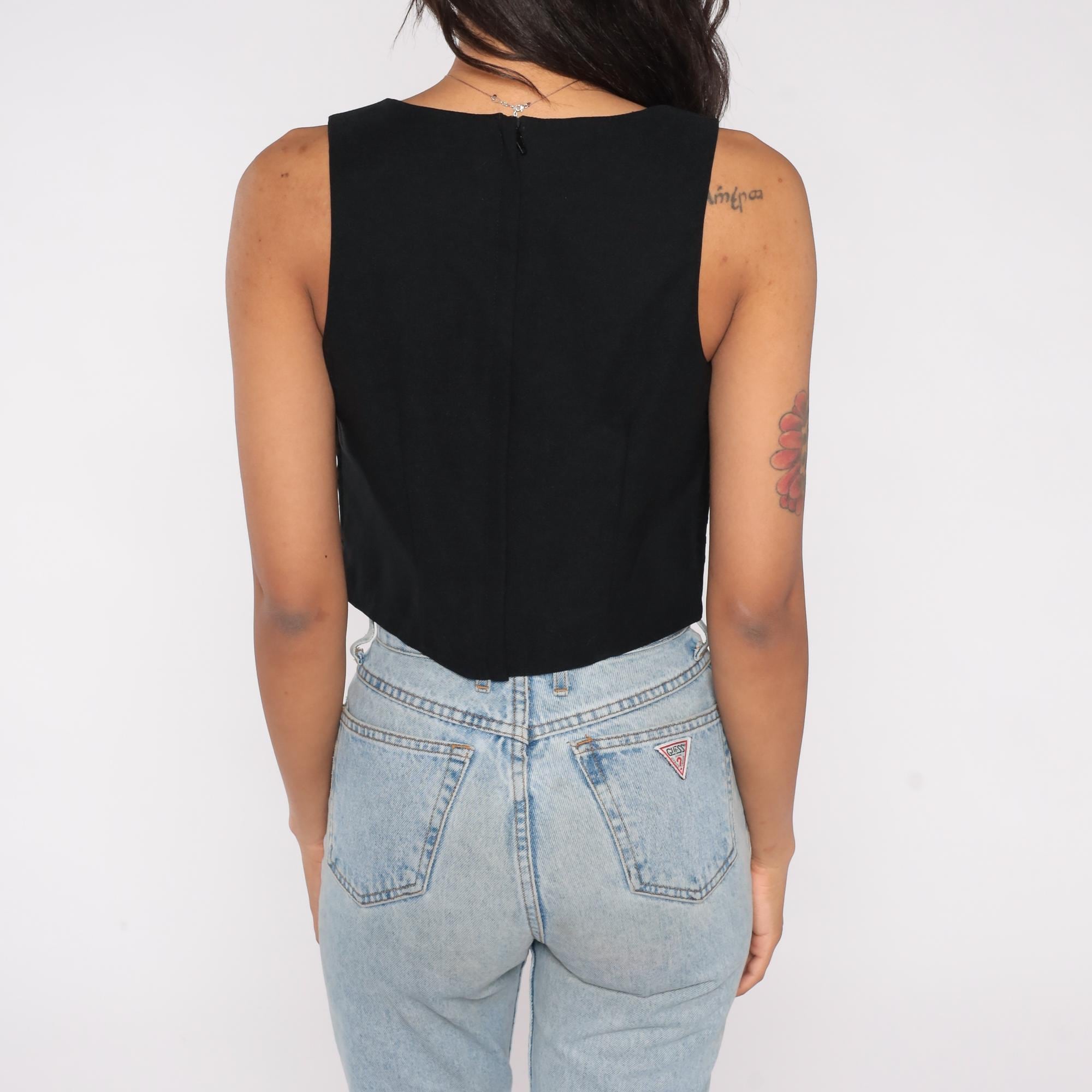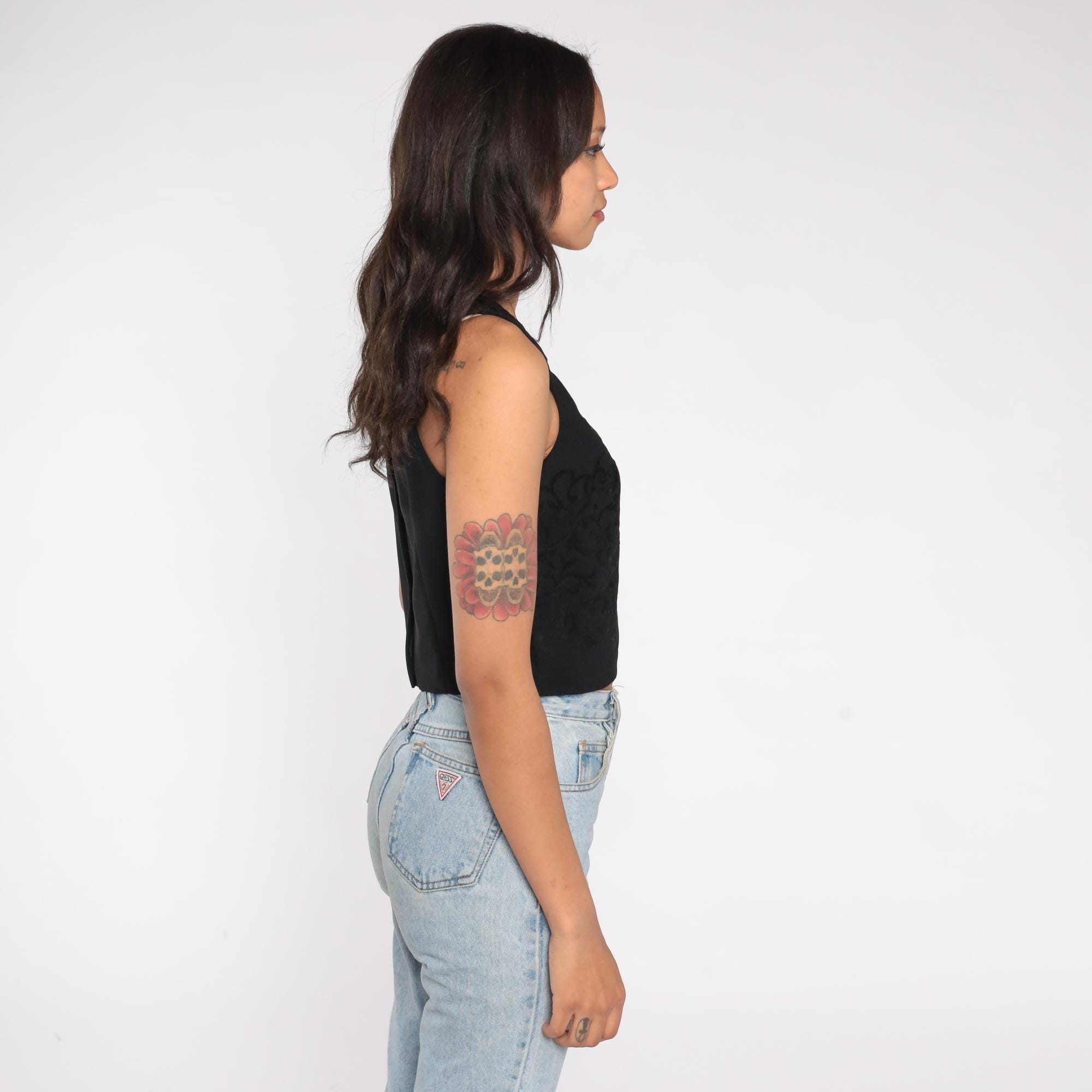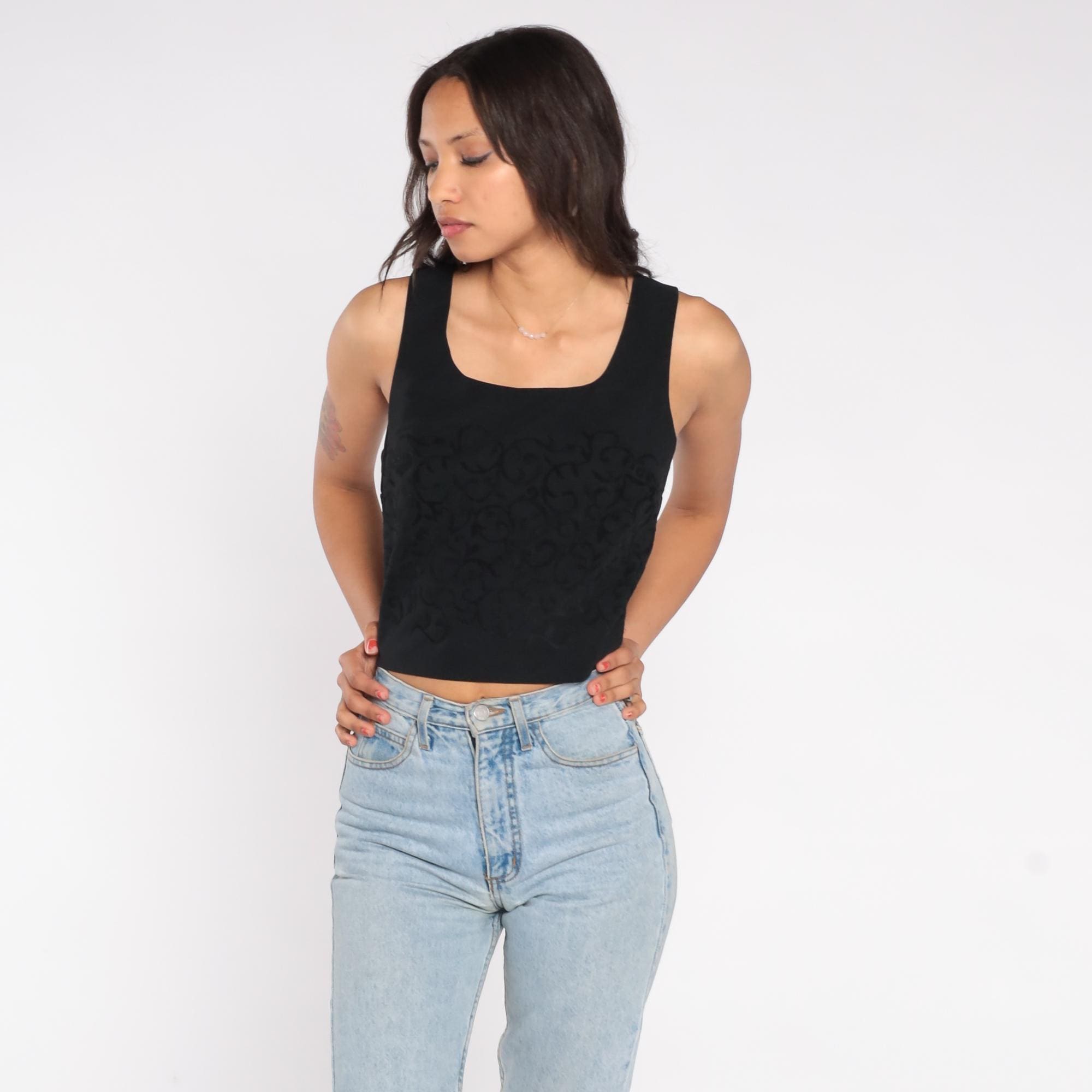90s vintage textured crop top by XOXO In America and Abroad. Features subtle embossed floral jacquard pattern throughout for elegant dimension. Sophisticated square neckline with clean finished edges. Sleeveless design with structured fit. Back zipper closure.