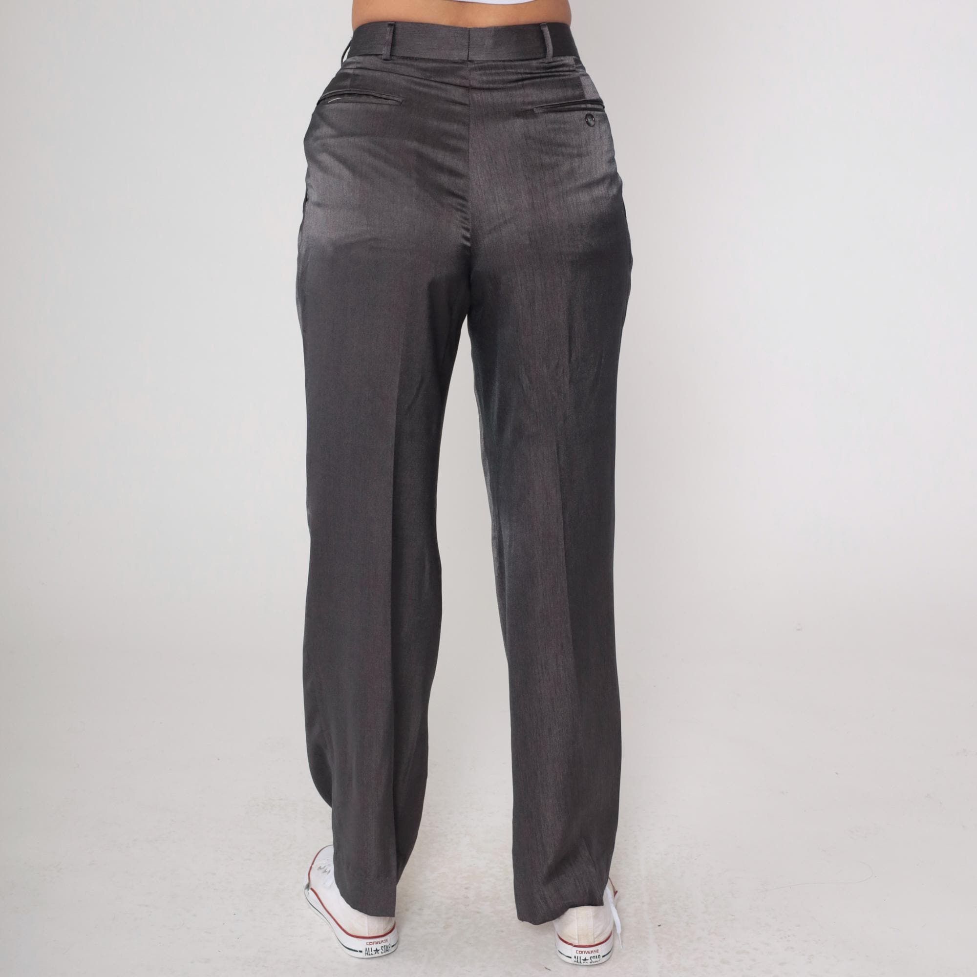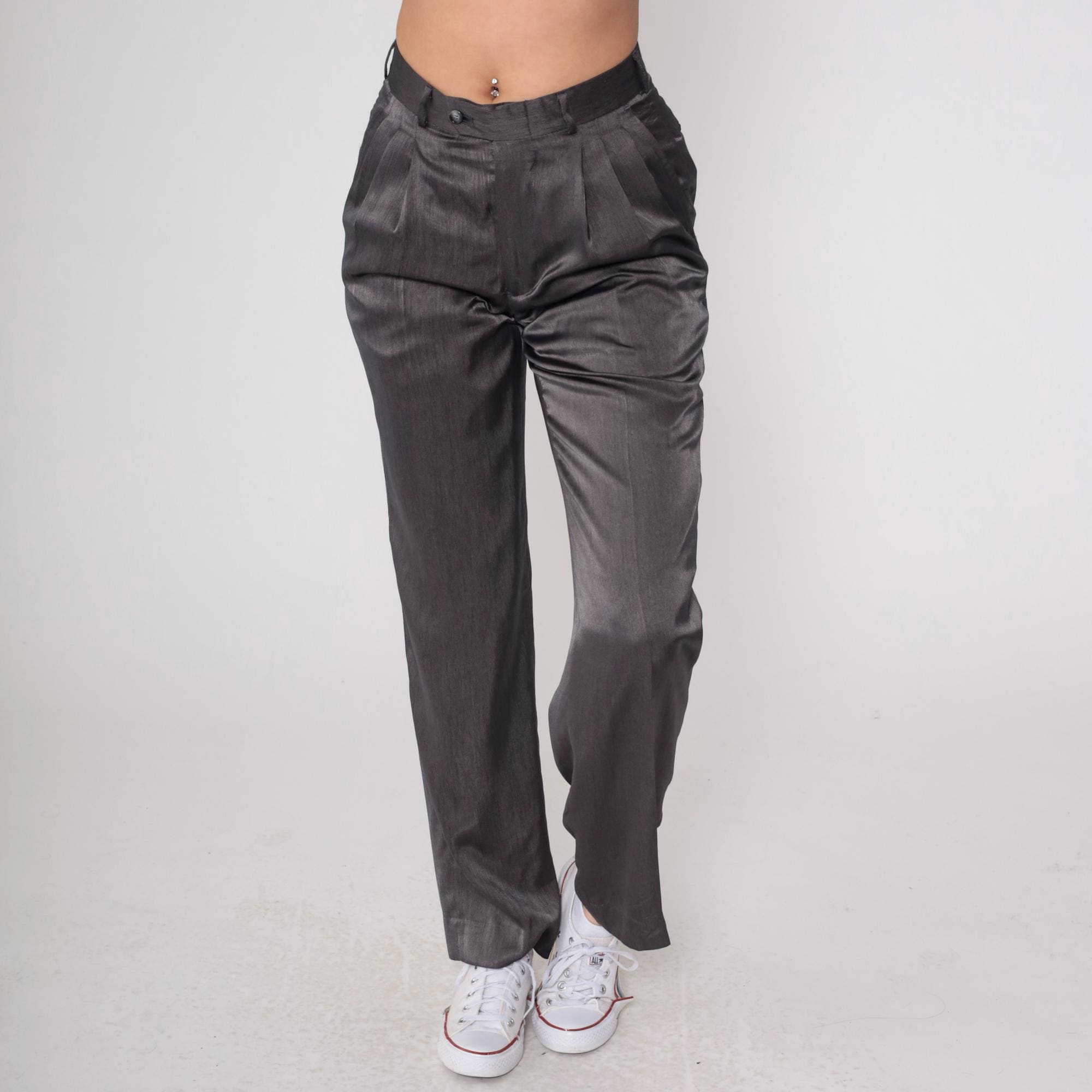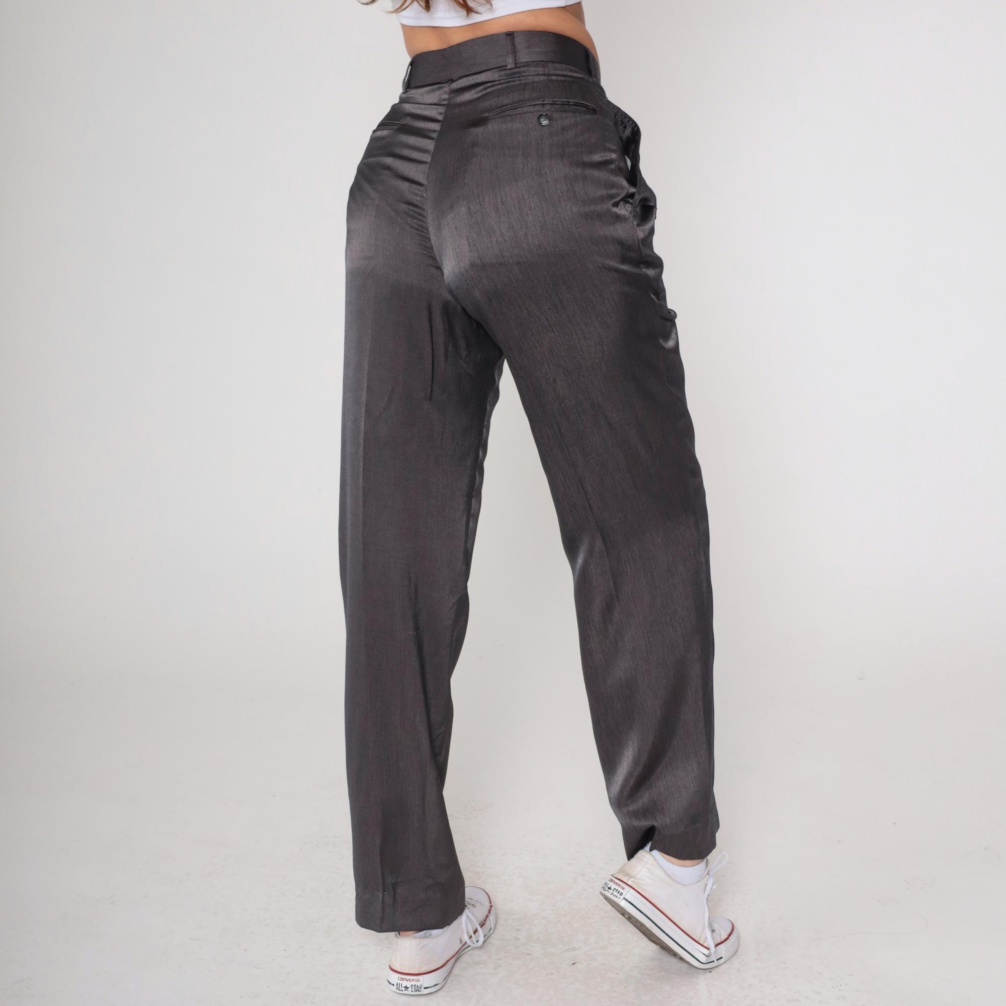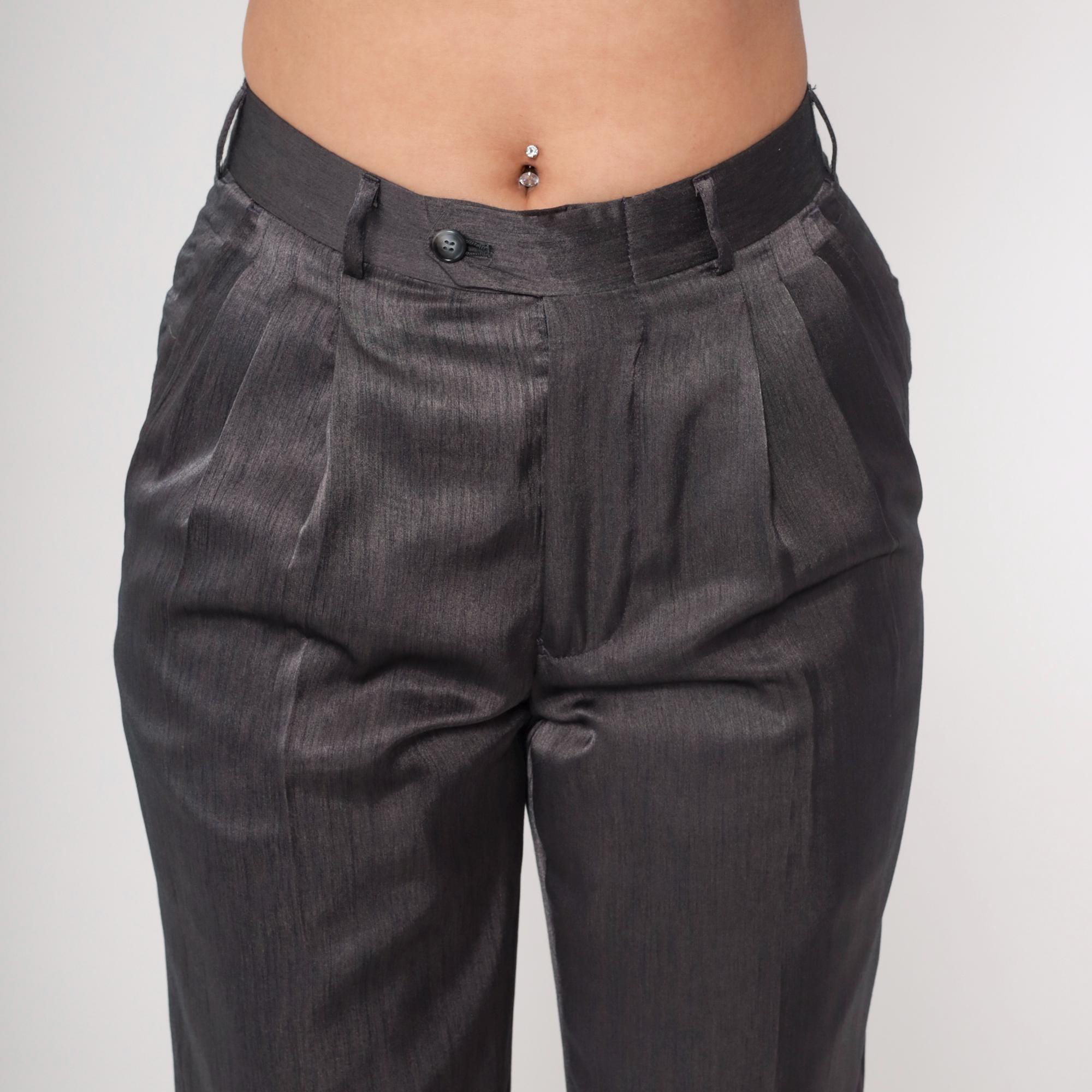 80s high waisted trousers in charcoal gray with silky sheen. Front pleats with button closure. Straight leg silhouette. Side and back pockets.