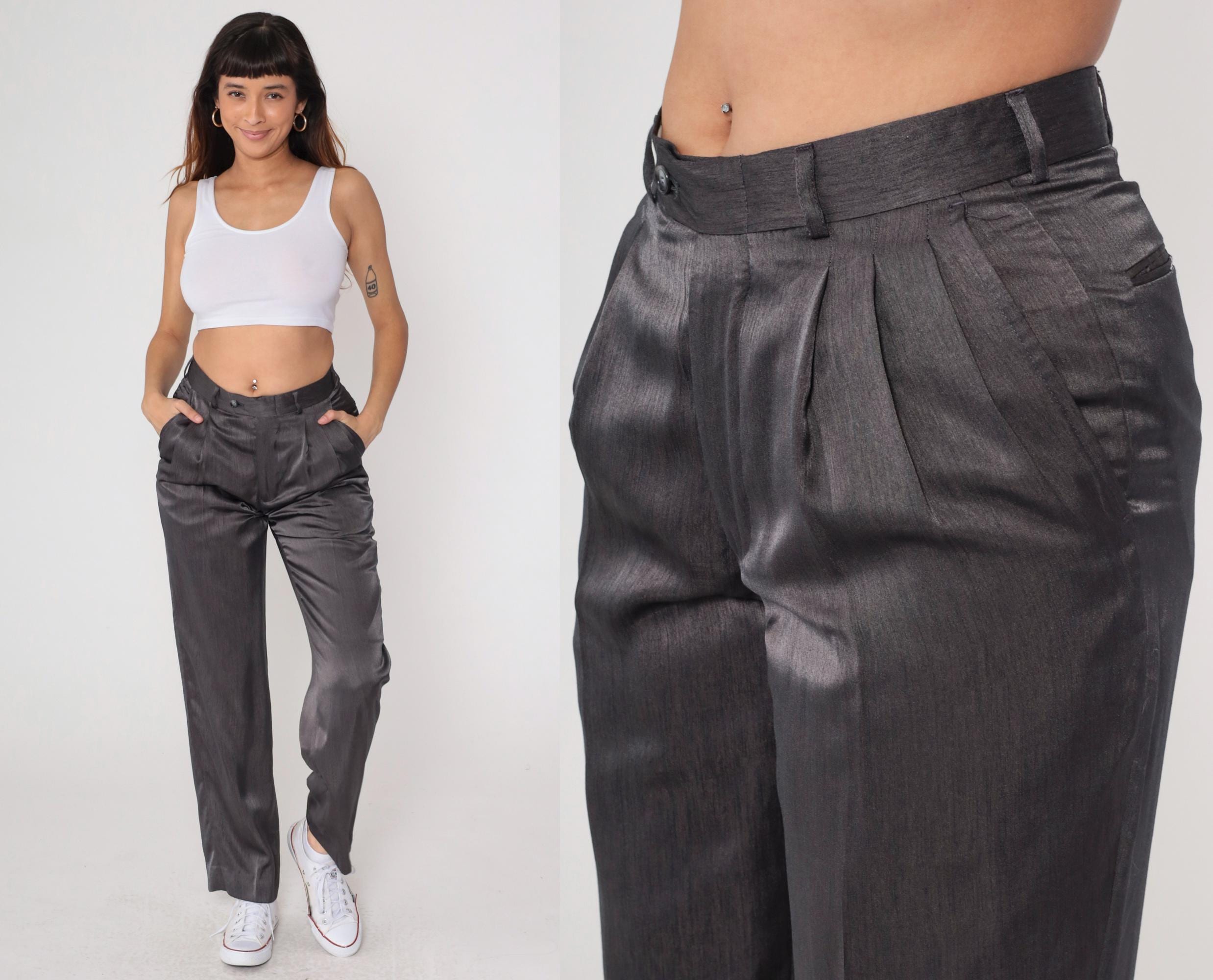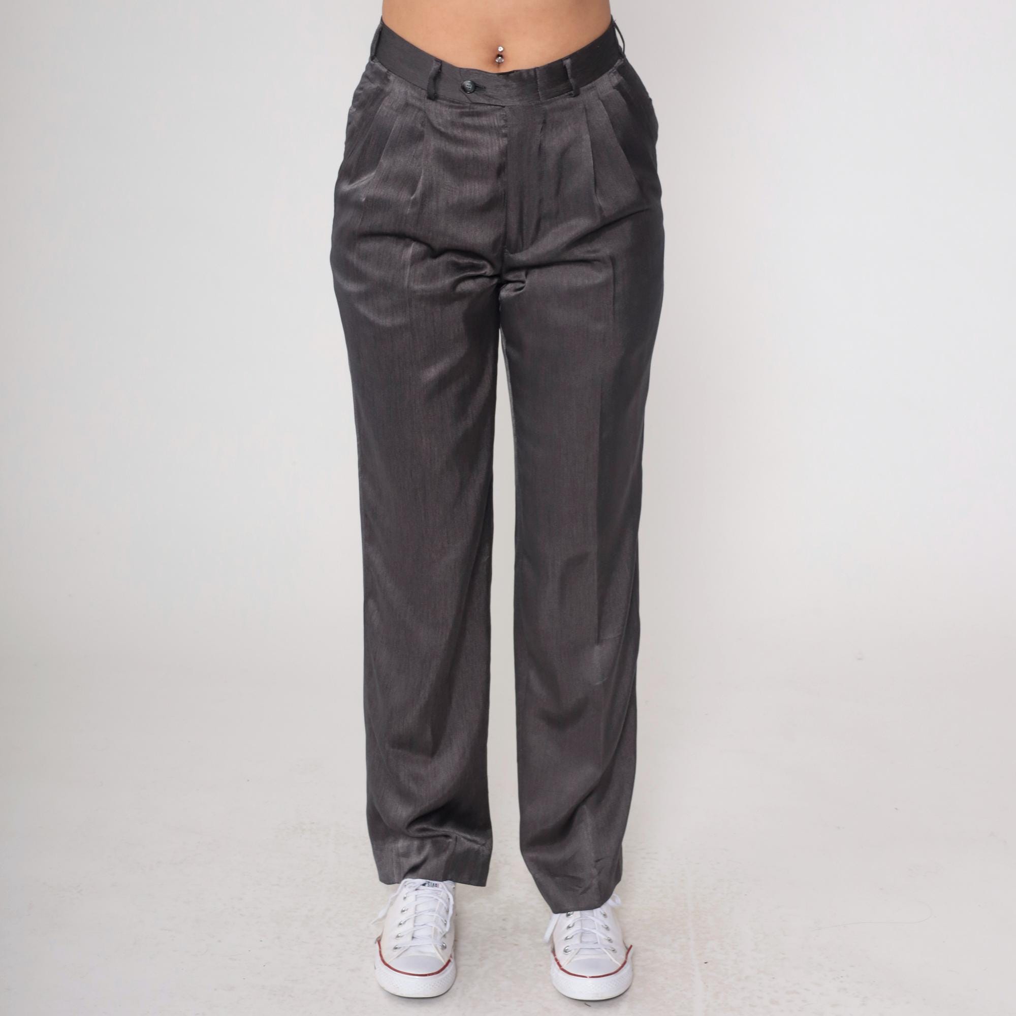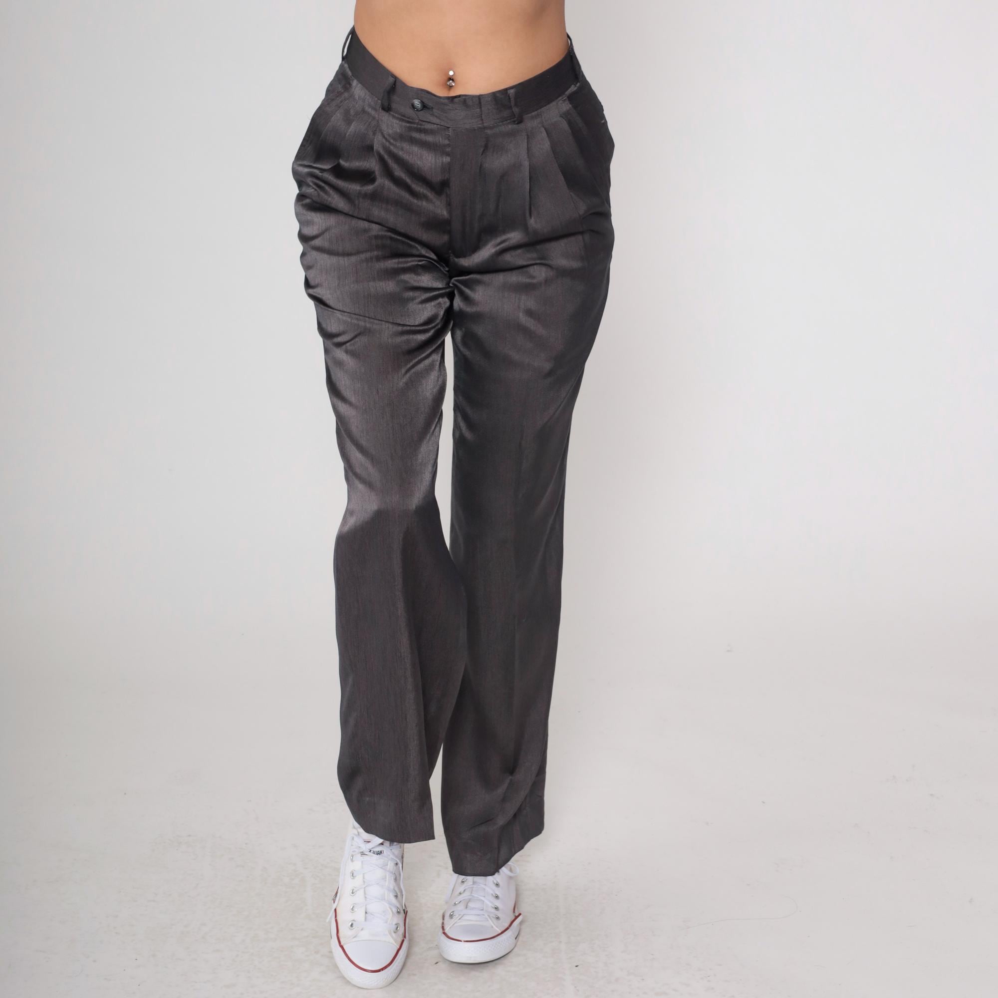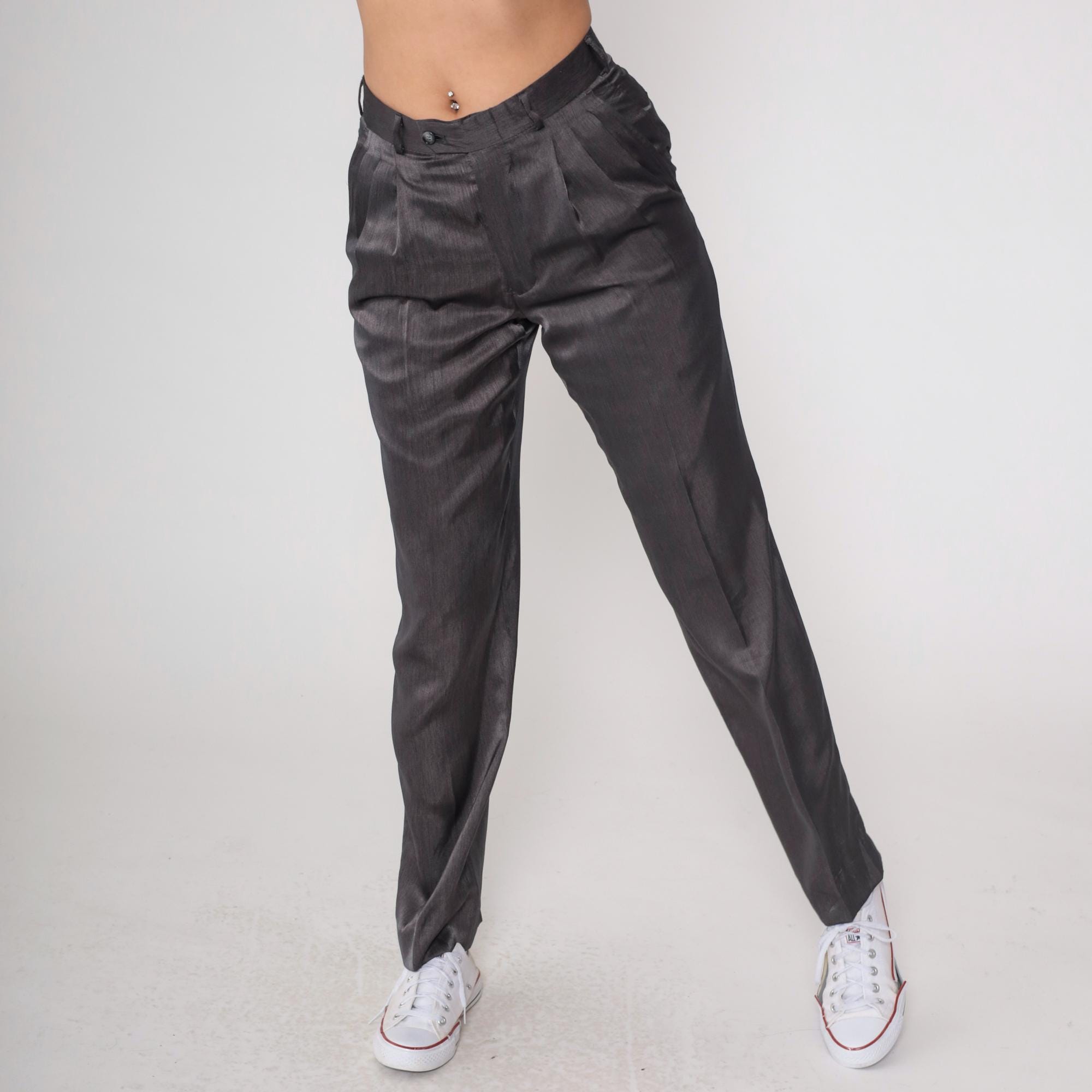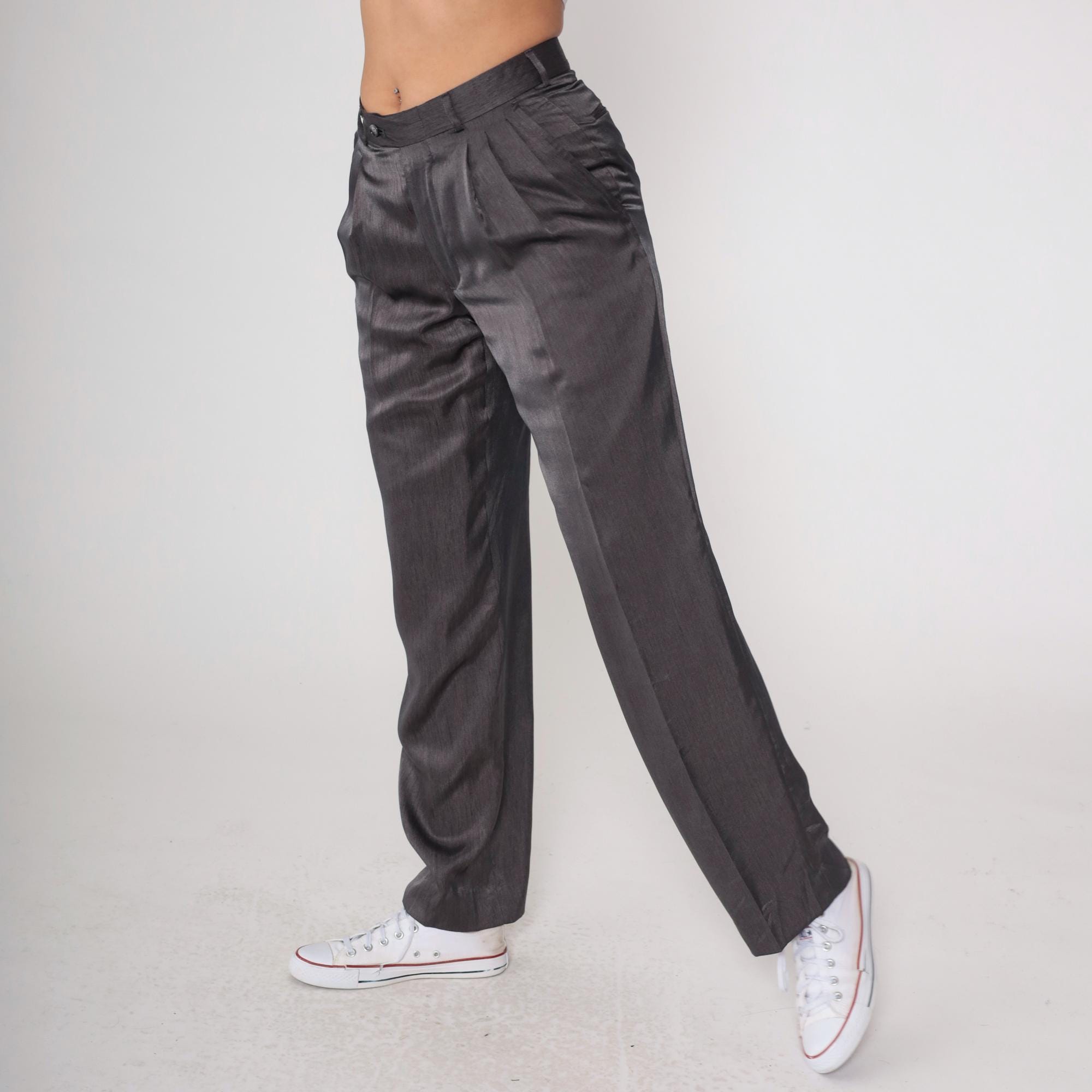 80s high waisted trousers in charcoal gray with silky sheen. Front pleats with button closure. Straight leg silhouette. Side and back pockets.