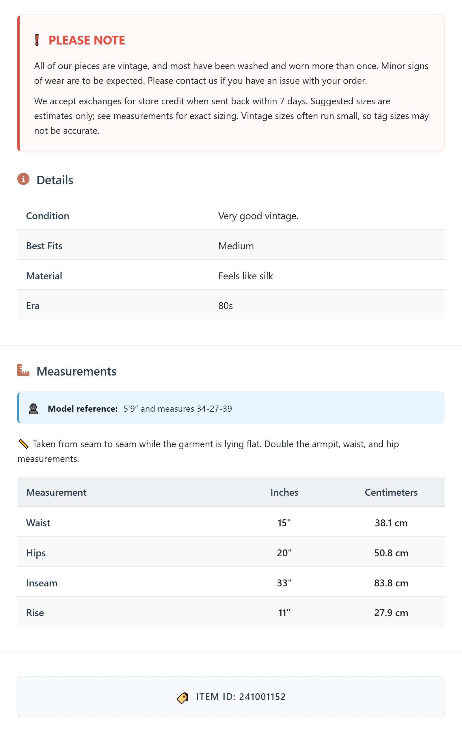 Vintage denim was usually made without any stretch, unlike modern jeans. Check the measurements to ensure proper fit, and remember to give yourself a little wiggle room in the waist and hips, depending on your preferred fit.