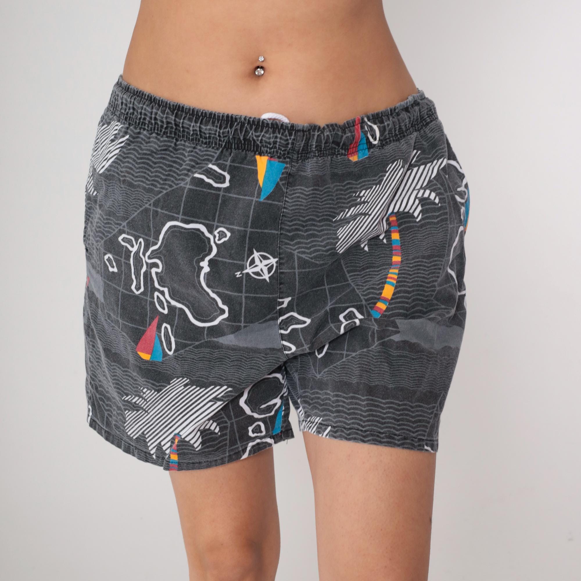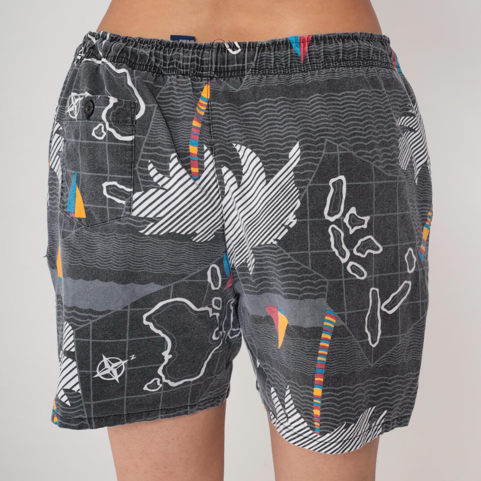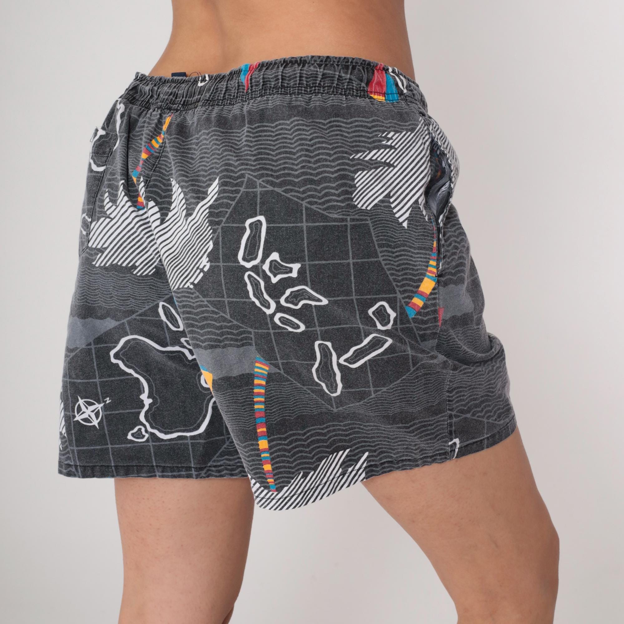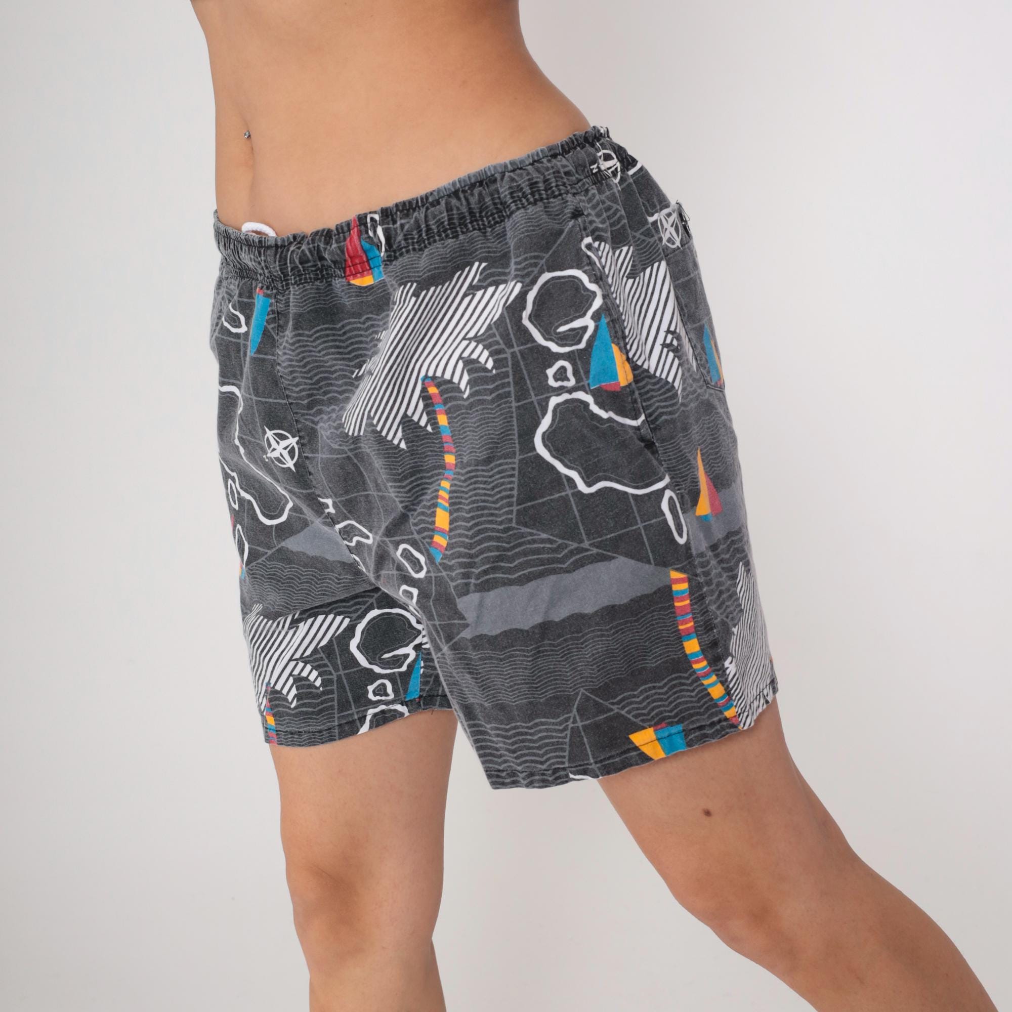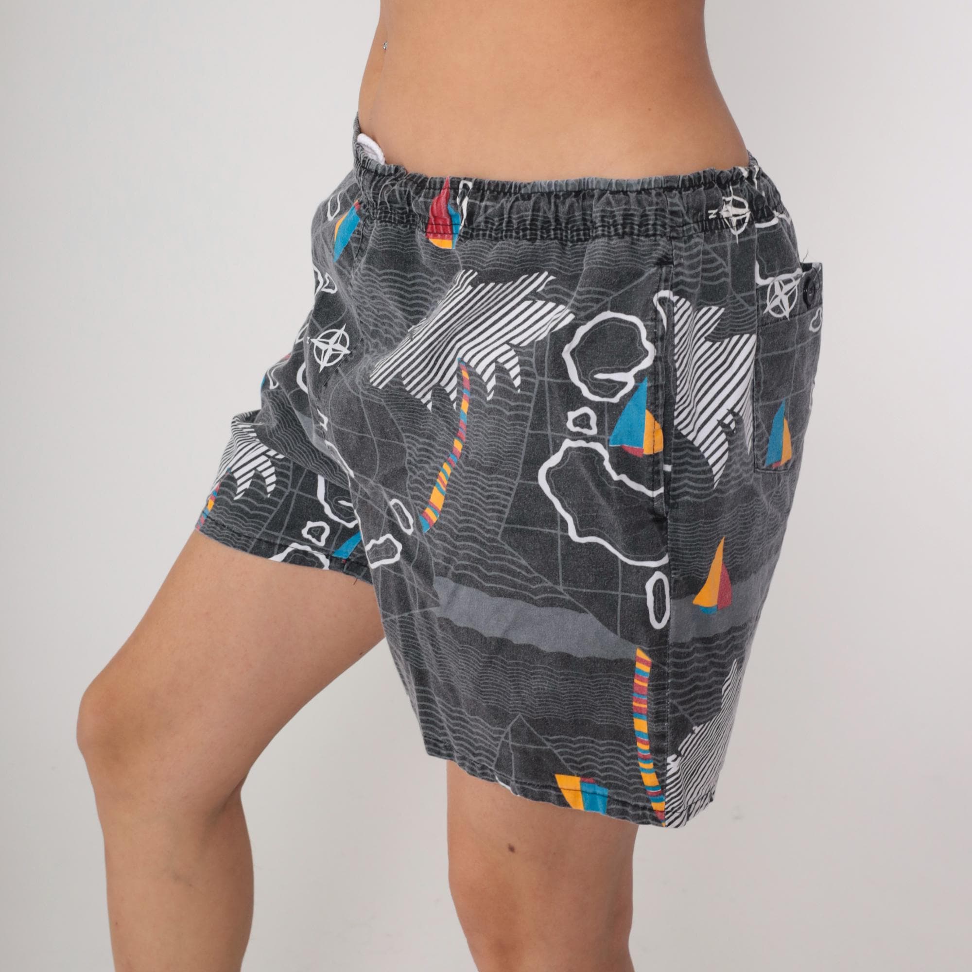 1990s Blair cotton swim trunks featuring a gray base with a bold white map and island graphic accented by colorful geometric details. Made from lightweight cotton with mesh lining, an elastic waistband, and side pockets.