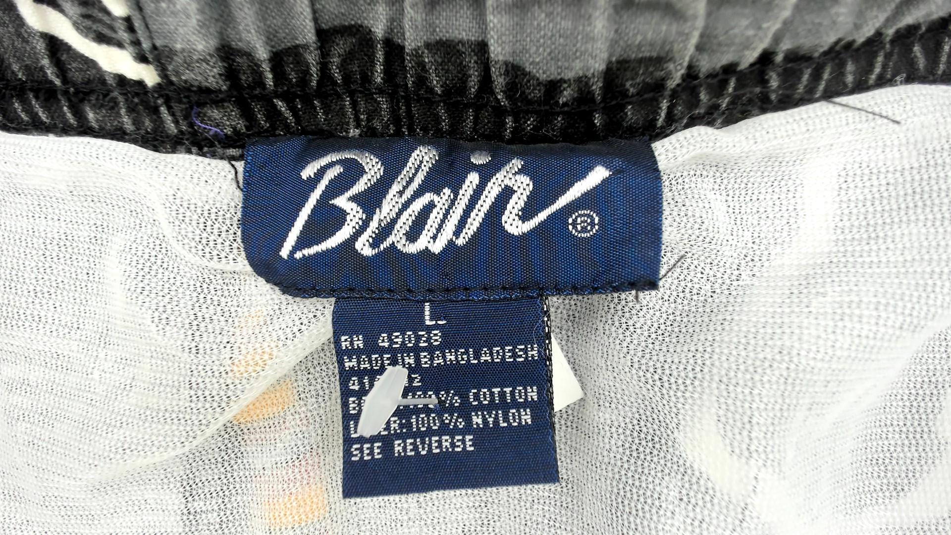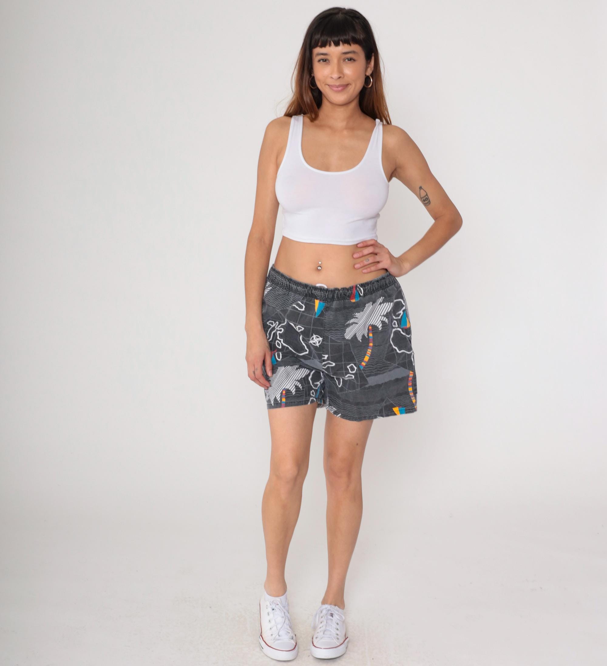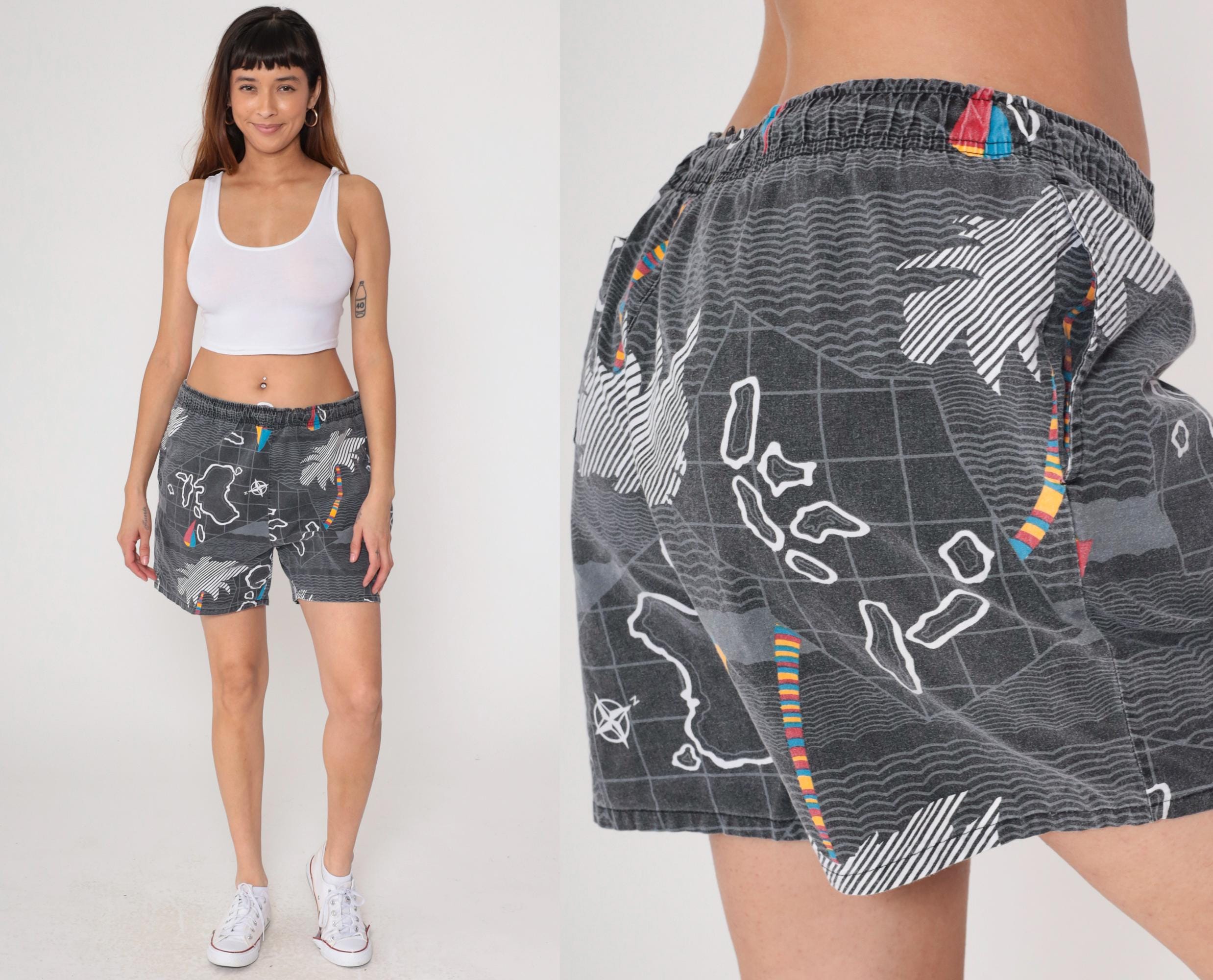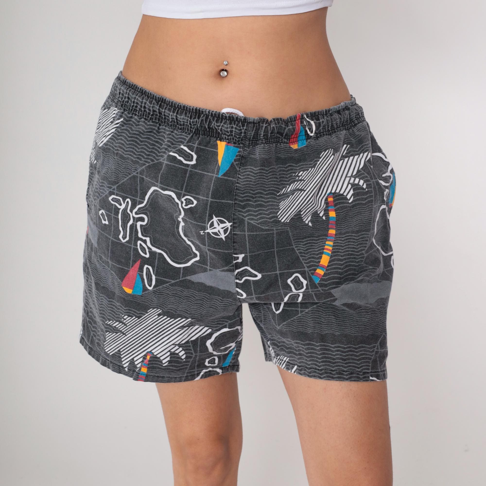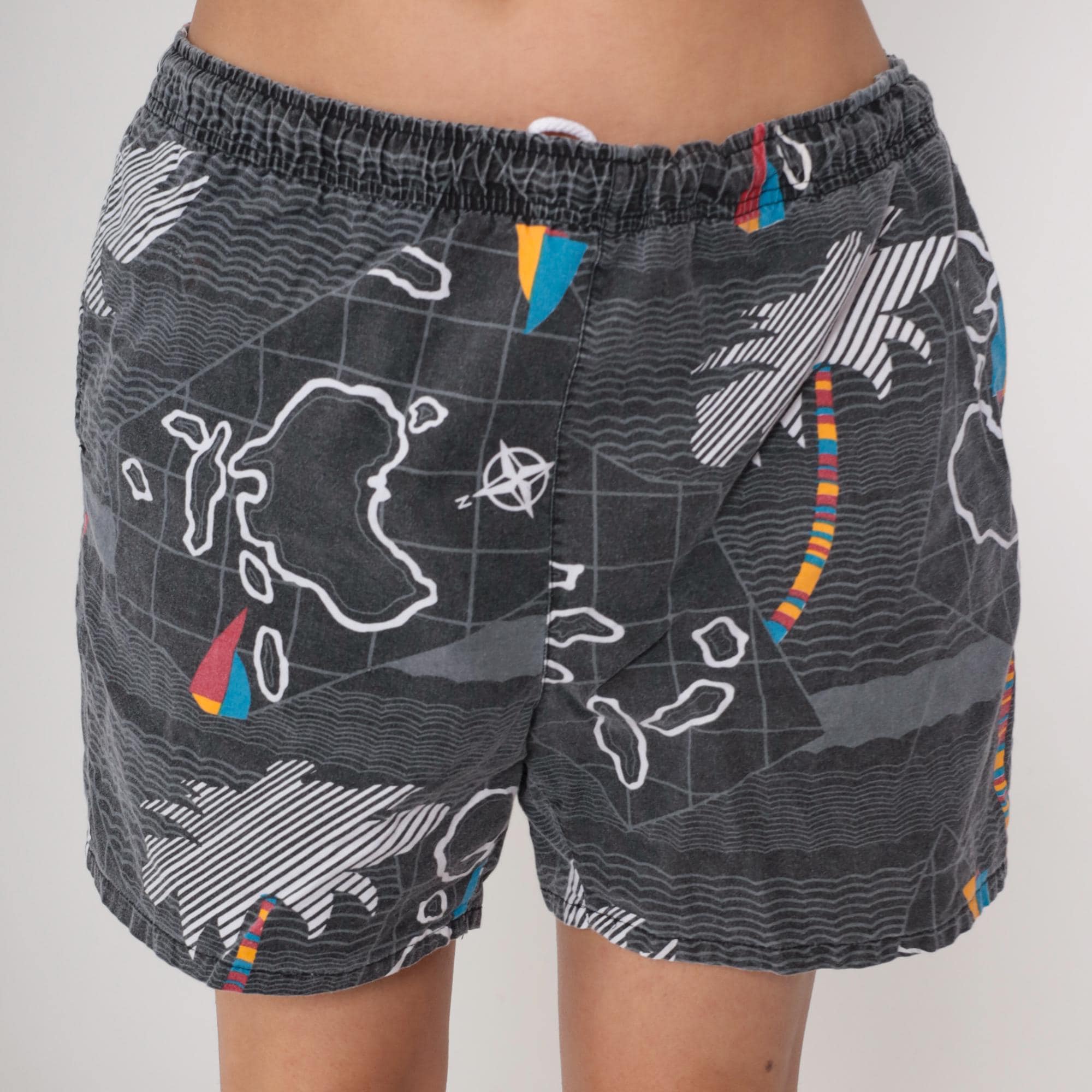 1990s Blair cotton swim trunks featuring a gray base with a bold white map and island graphic accented by colorful geometric details. Made from lightweight cotton with mesh lining, an elastic waistband, and side pockets.