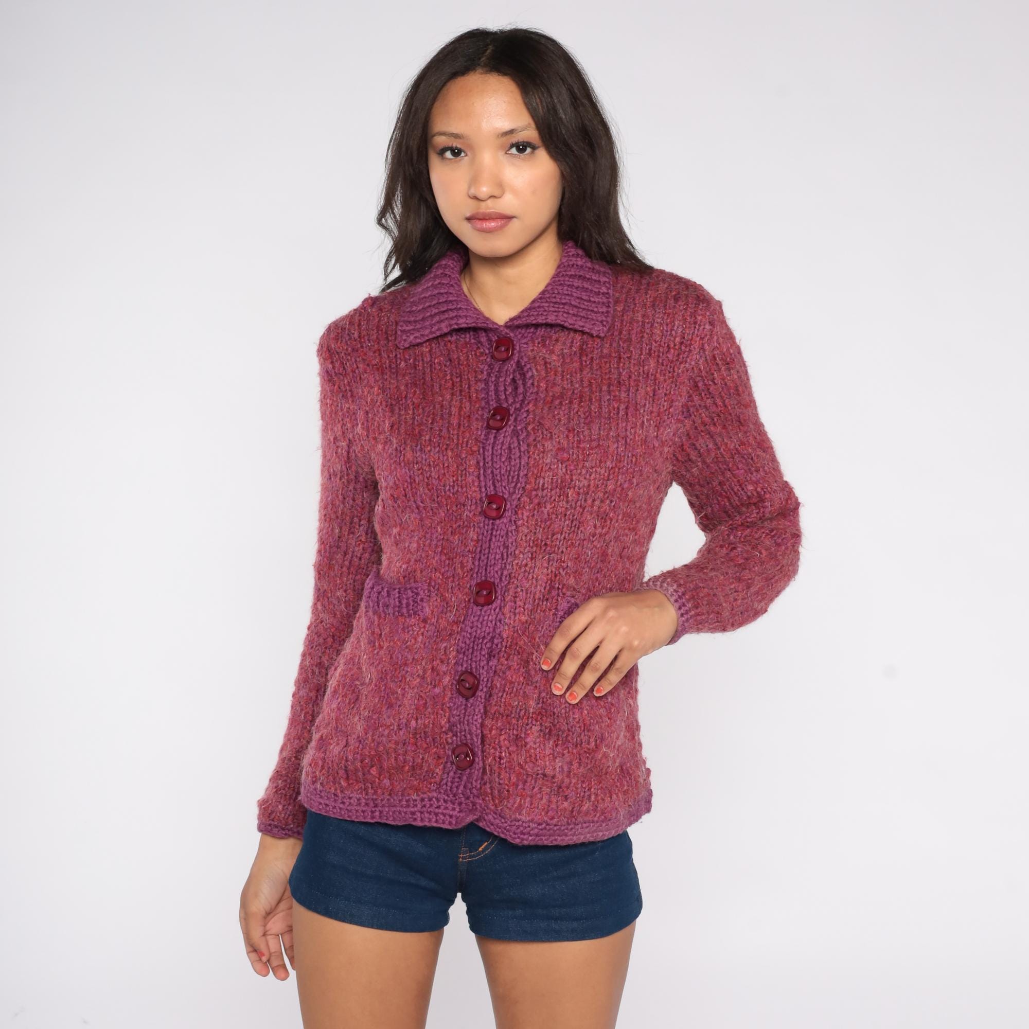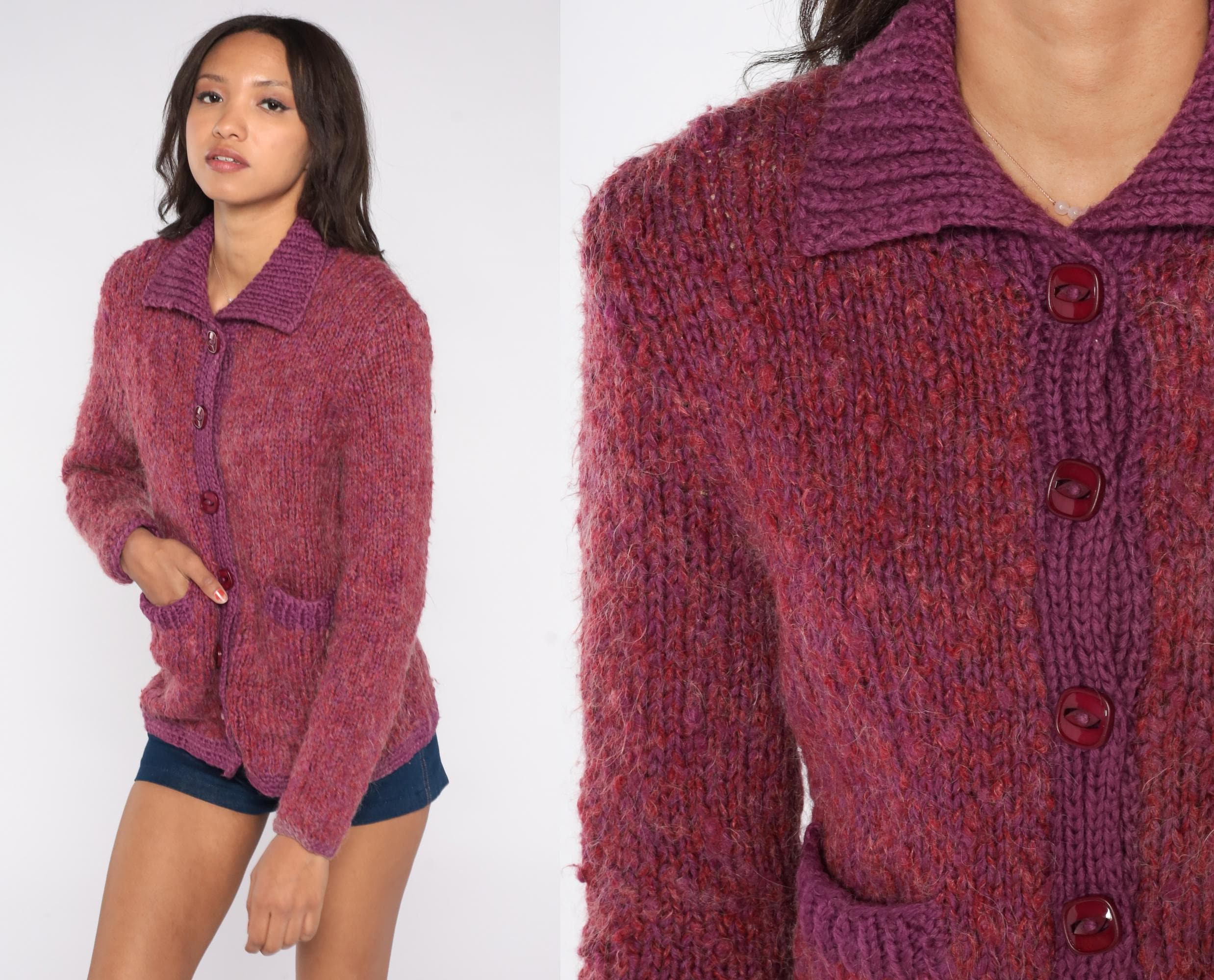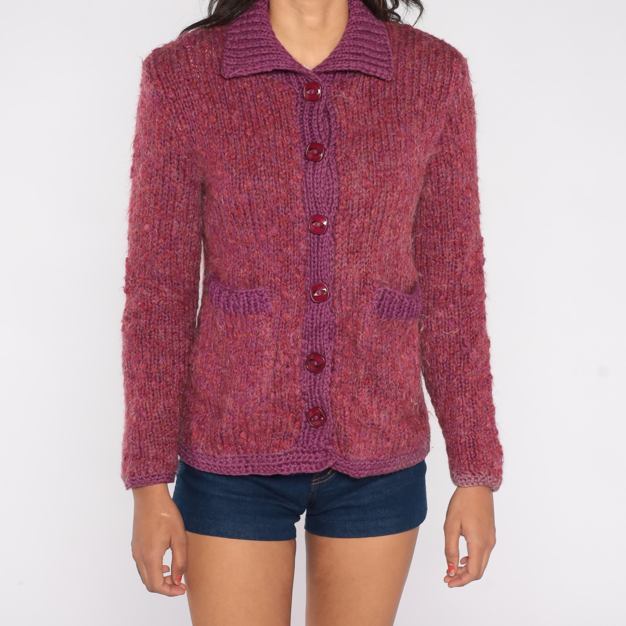 1970s spacedye knit cardigan in purple and burgundy tones. Button-up front with collared neckline and chunky knit construction. Two front pockets.