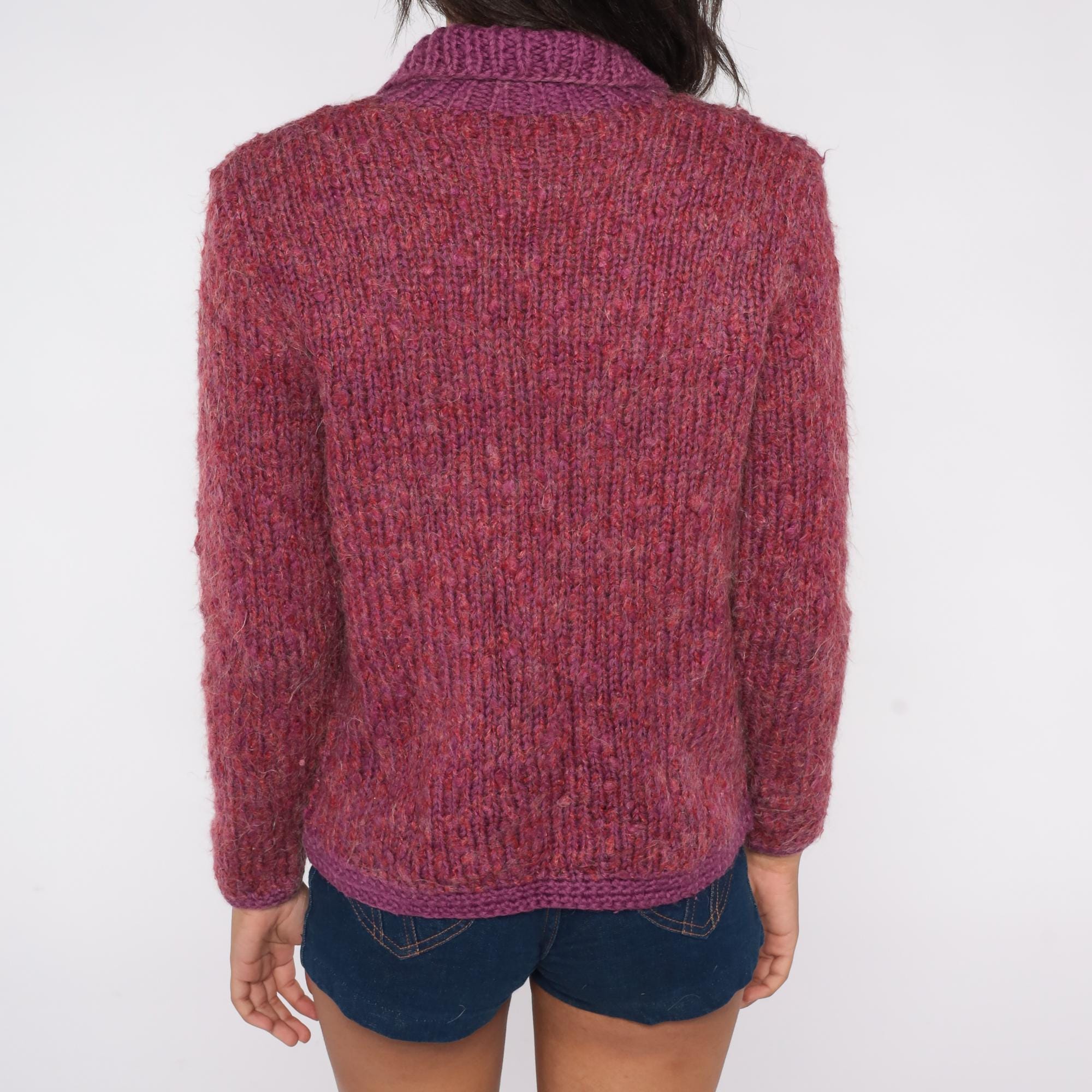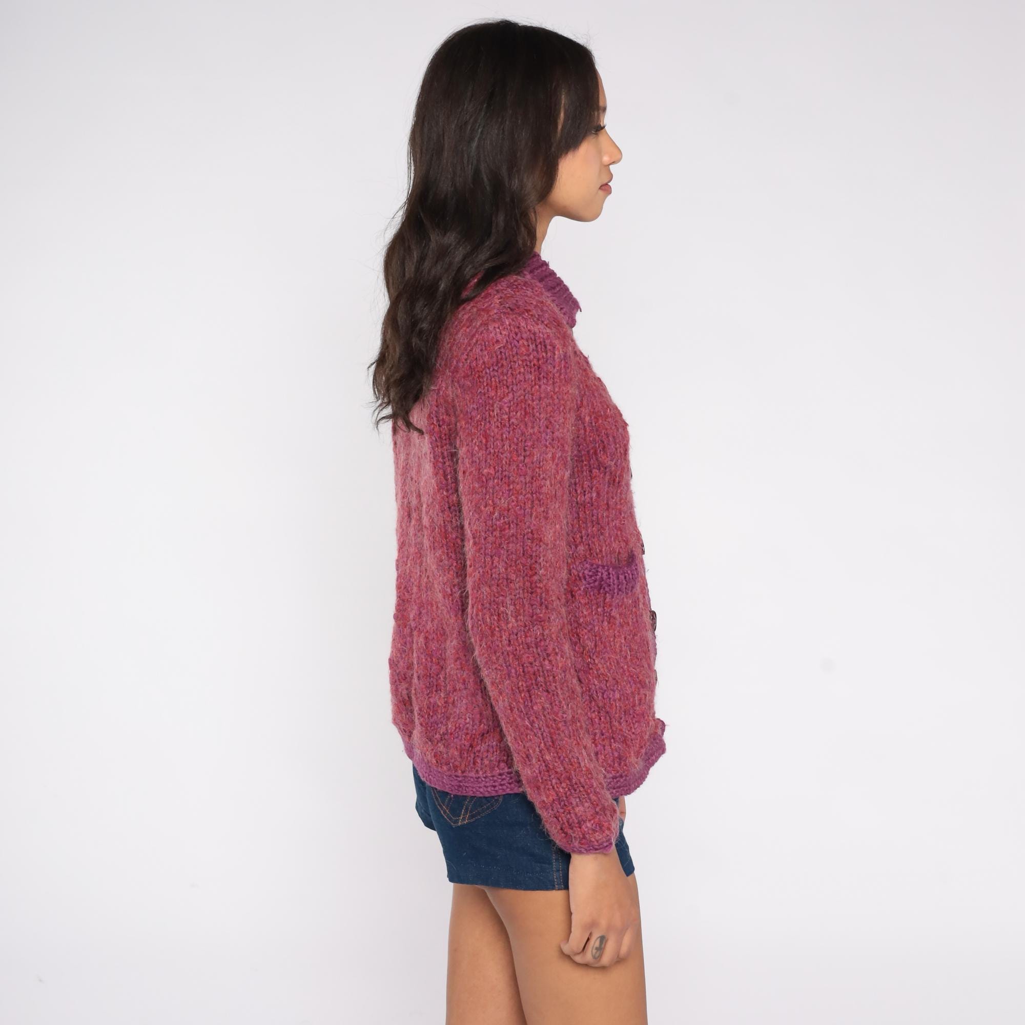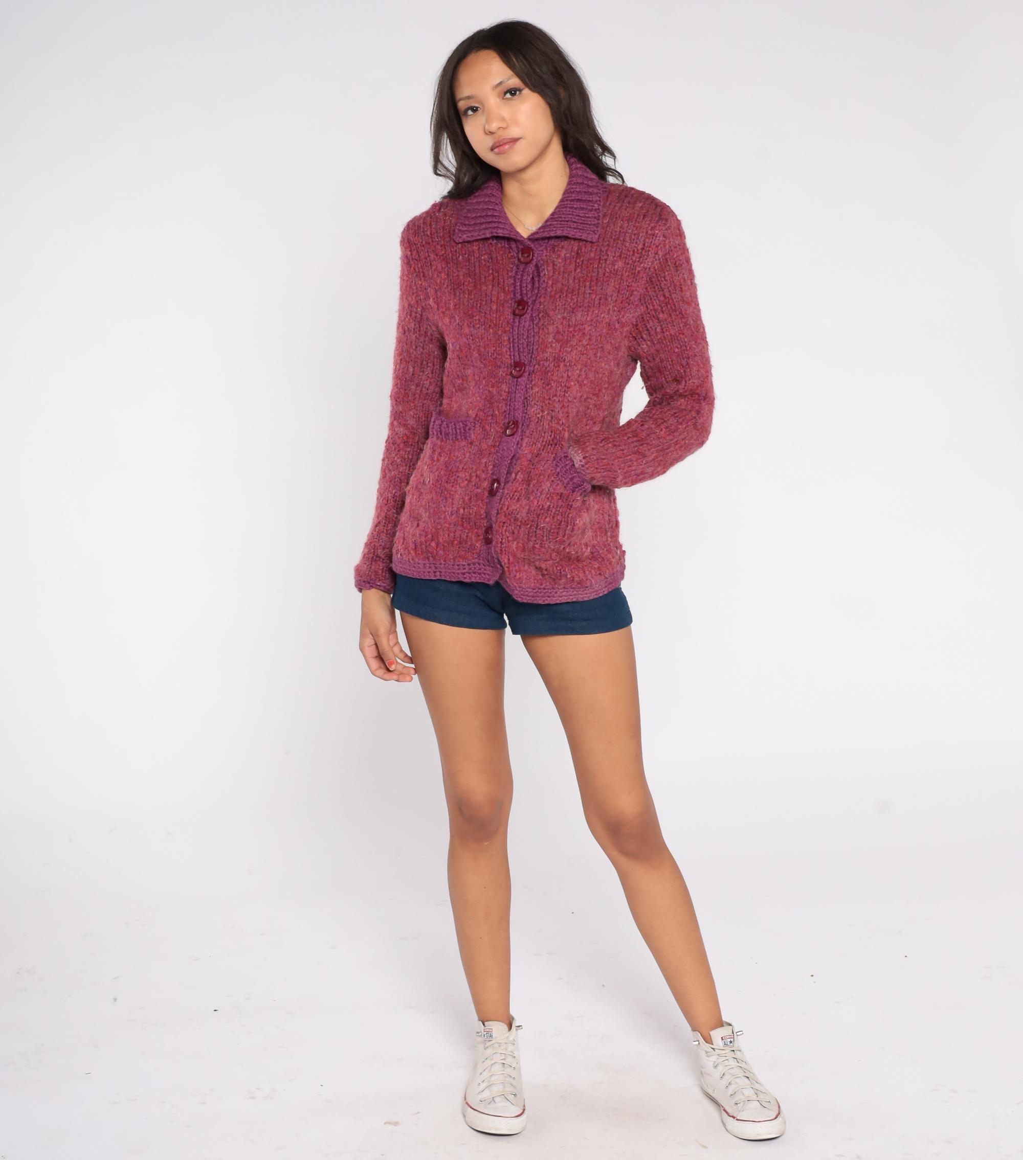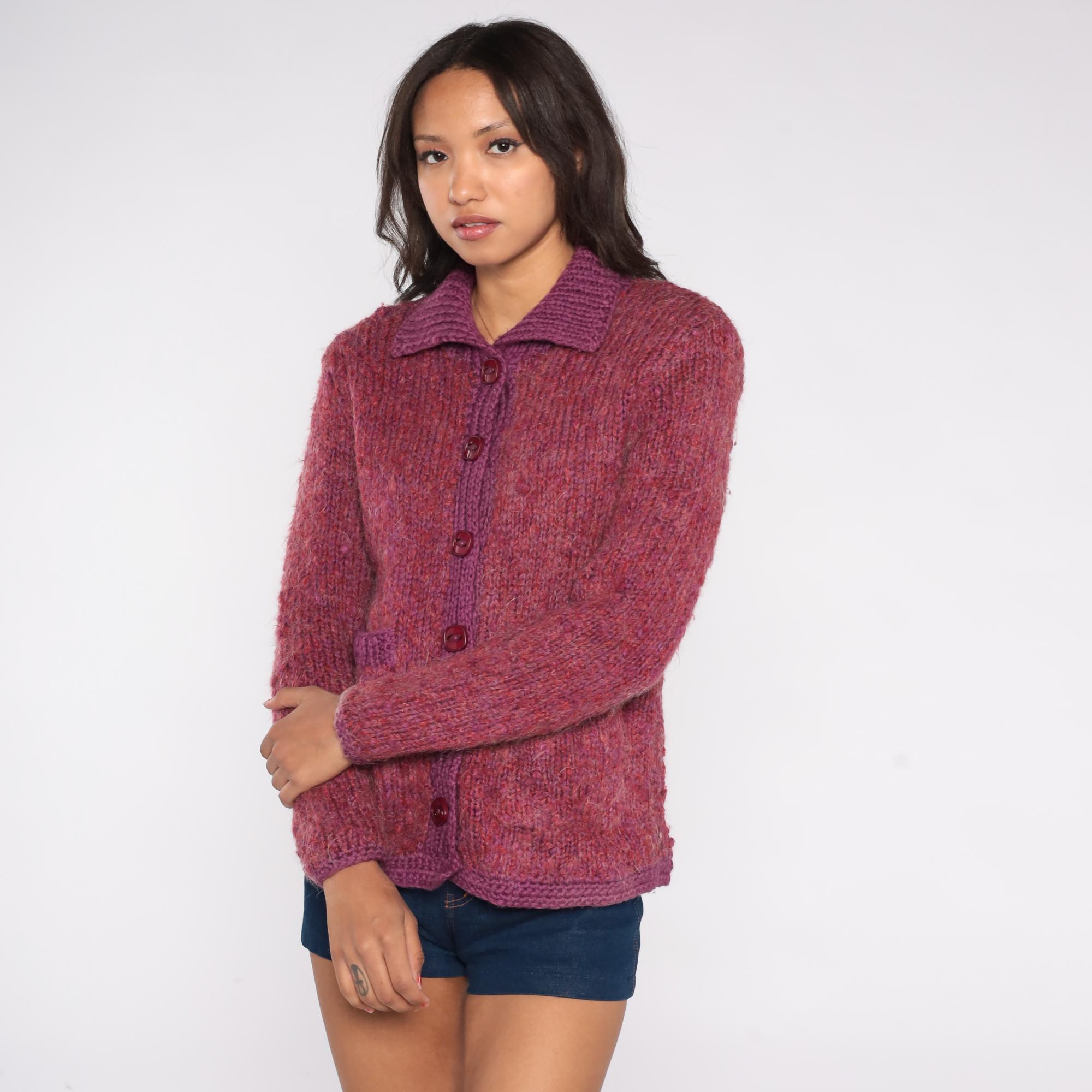 1970s spacedye knit cardigan in purple and burgundy tones. Button-up front with collared neckline and chunky knit construction. Two front pockets.