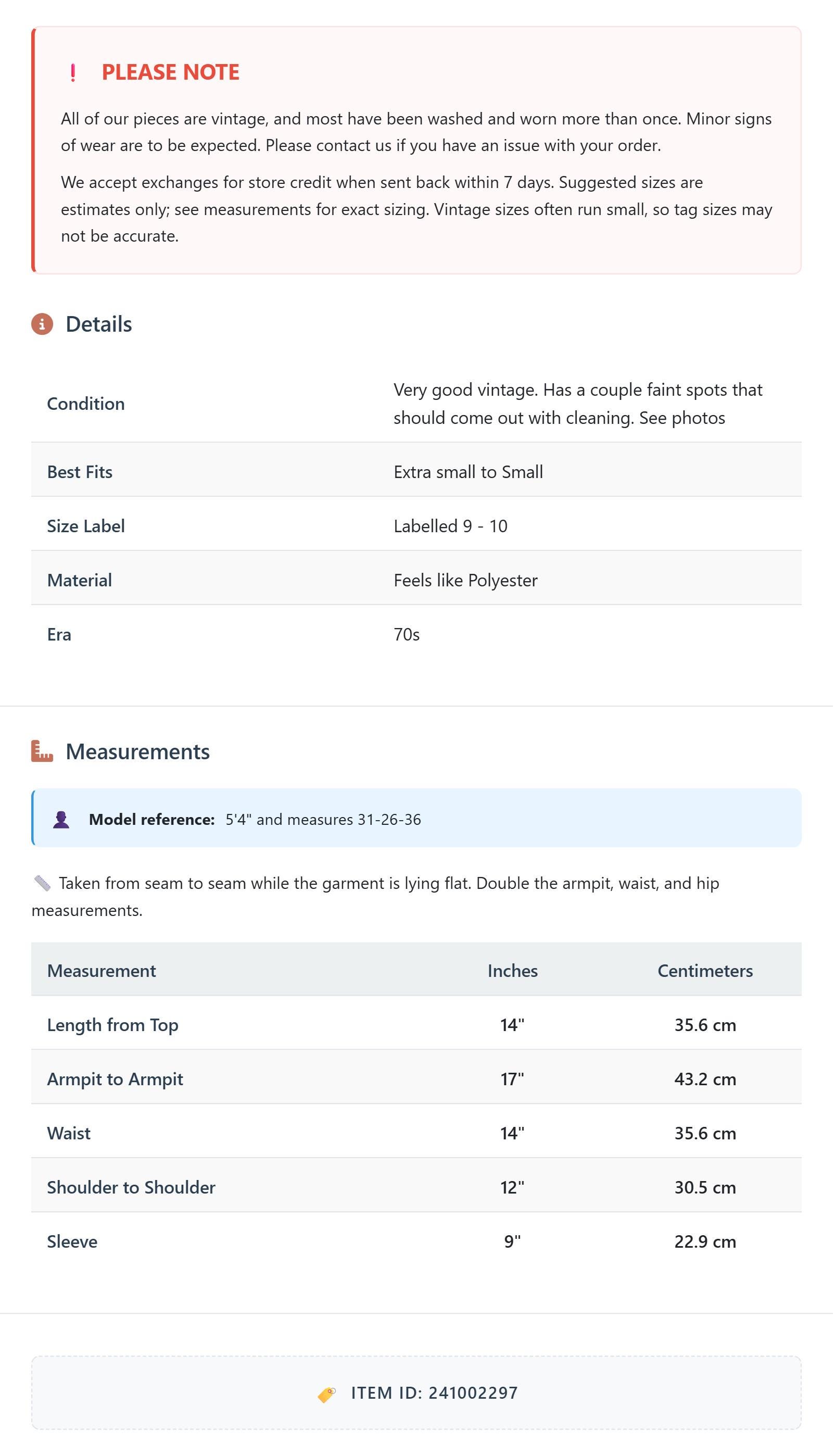 All of our pieces are vintage, and most have been washed and worn more than once. Minor signs of wear are to be expected. Please contact us if you have an issue with your order. We accept exchanges for store credit when sent back within 7 days.