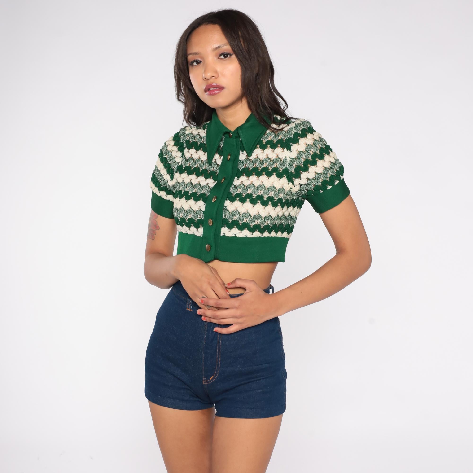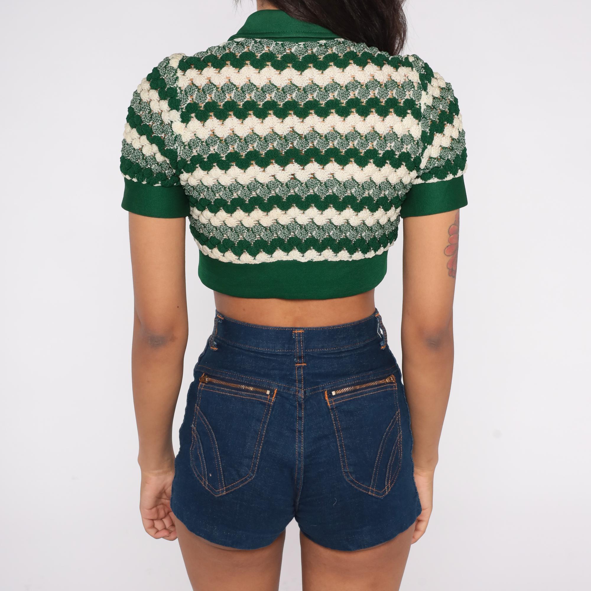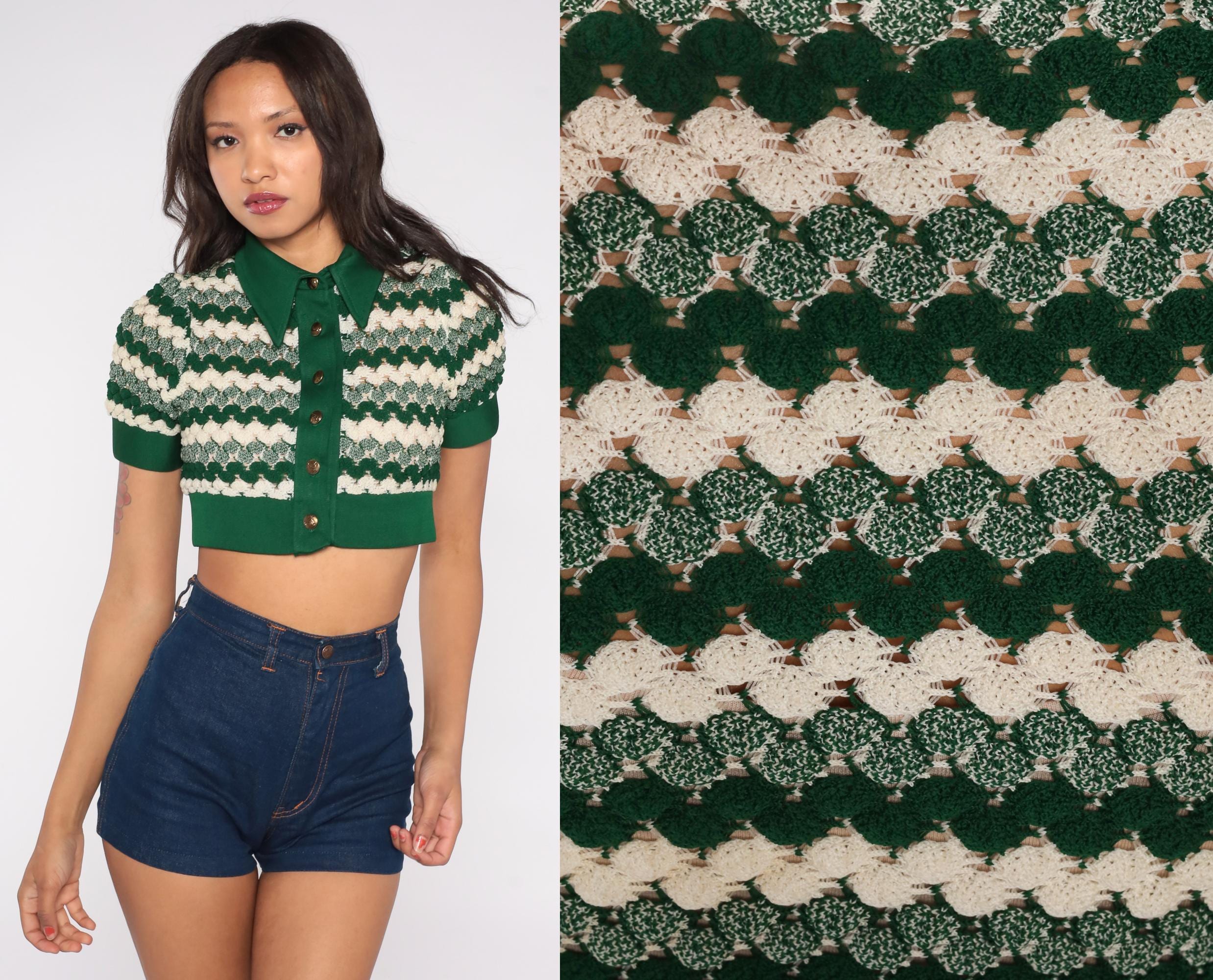 1970s green crop cardigan featuring textured chevron knit pattern in forest green and cream. Button-front style with pointed collar and short sleeves. Distinctive zigzag wave design throughout. Fitted silhouette with ribbed trim at waist and sleeves.