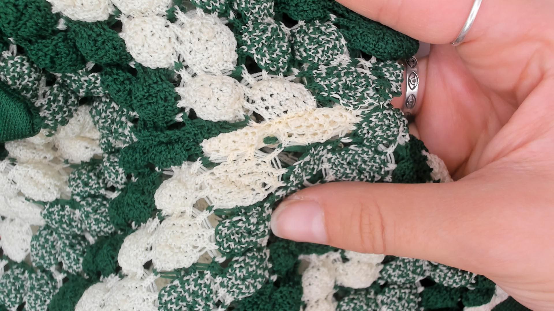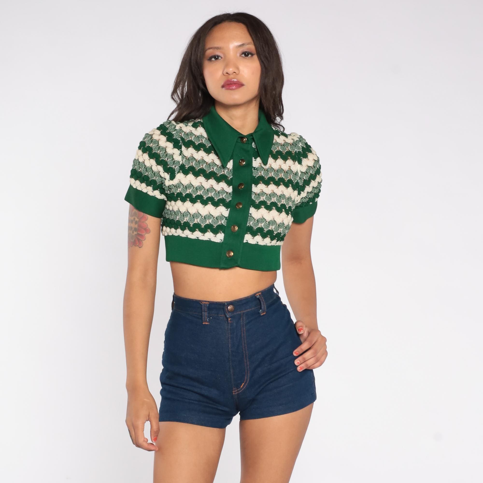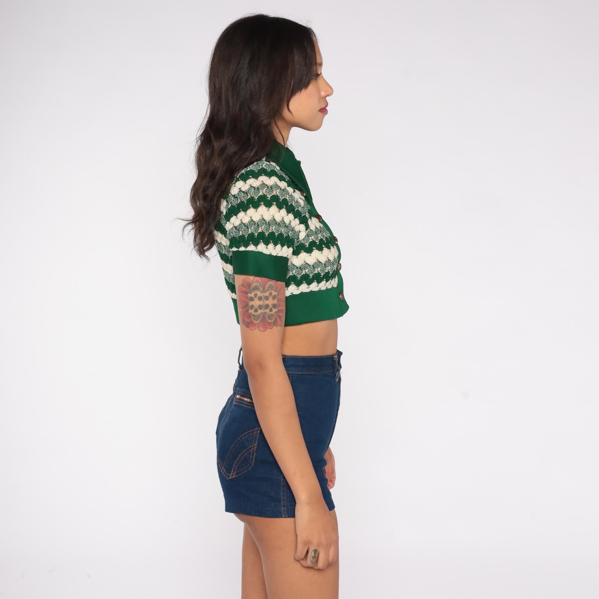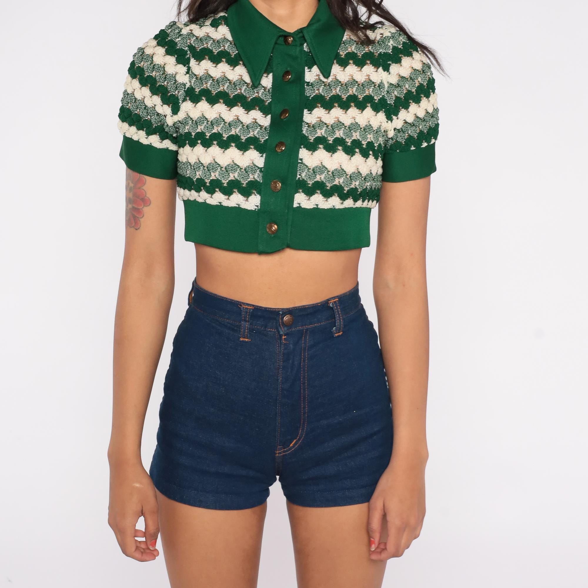 1970s green crop cardigan featuring textured chevron knit pattern in forest green and cream. Button-front style with pointed collar and short sleeves. Distinctive zigzag wave design throughout. Fitted silhouette with ribbed trim at waist and sleeves.