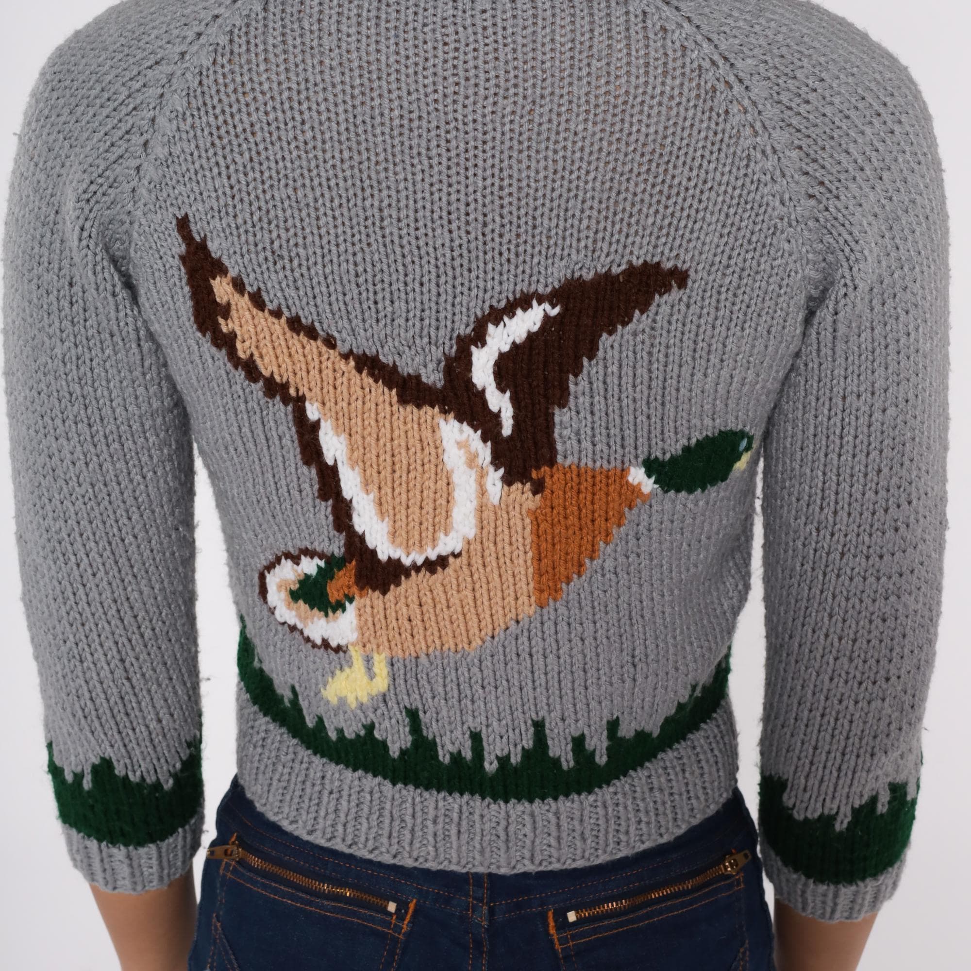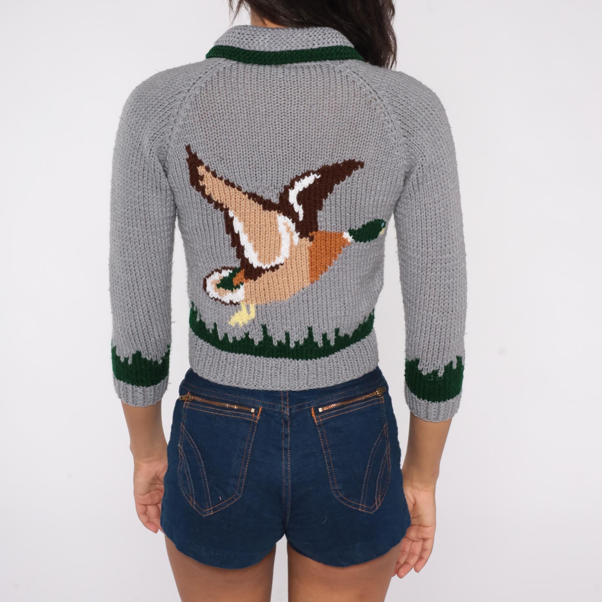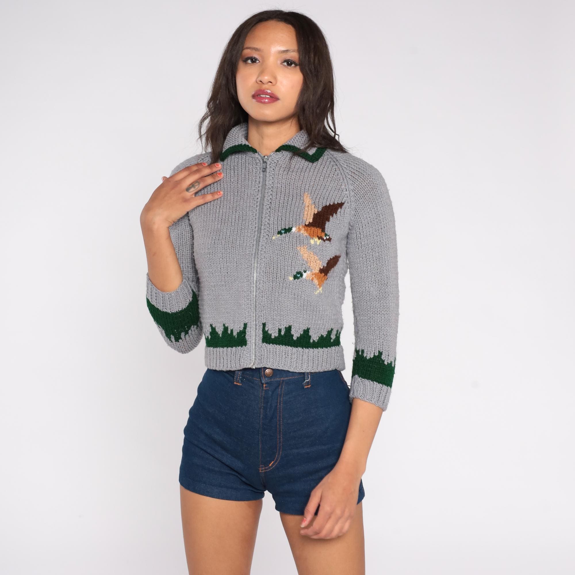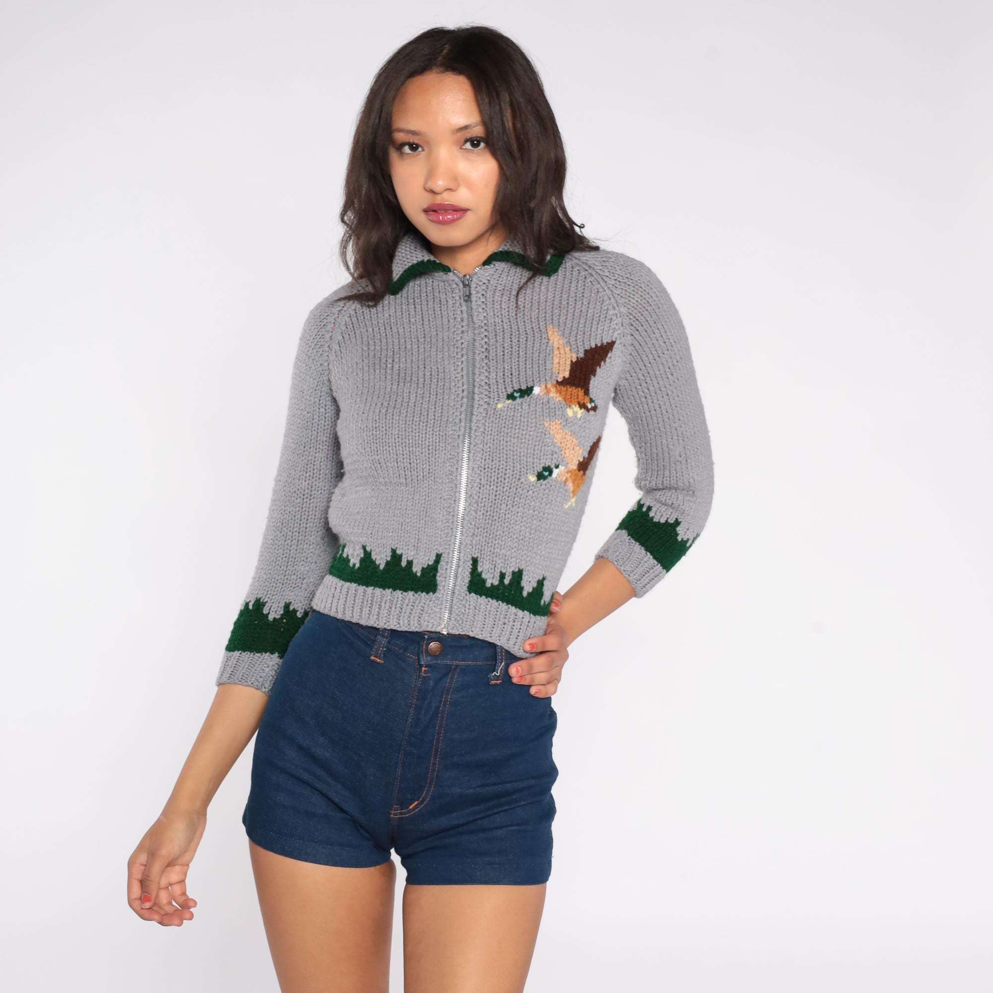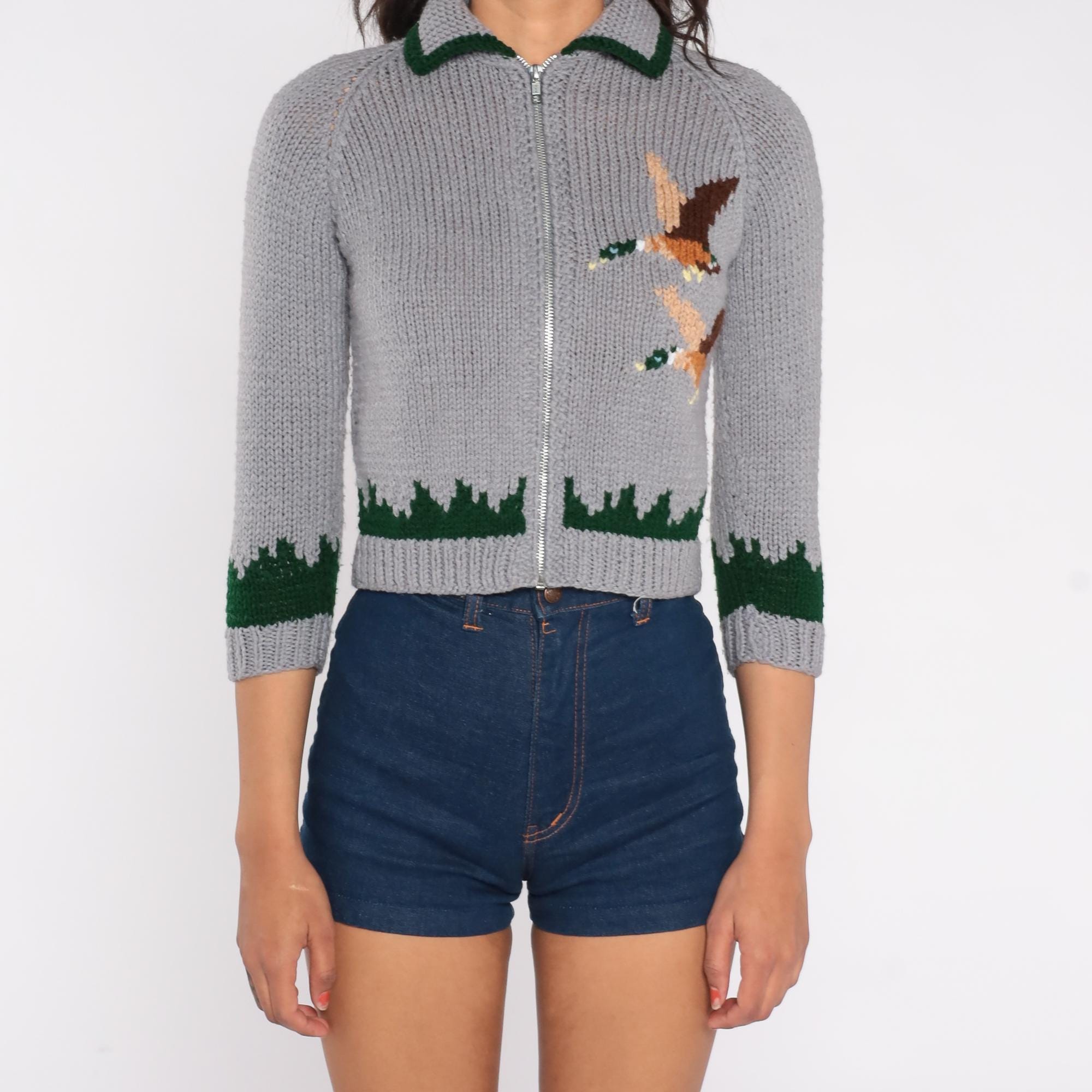 70s grey cardigan sweater featuring intarsia knit mallard duck design. Cropped zip-front style with green trim at collar, sleeves, and hem. Three-quarter length sleeves with classic forest scene detail. Green knit collar with contrast trim. Silver metal zipper closure.