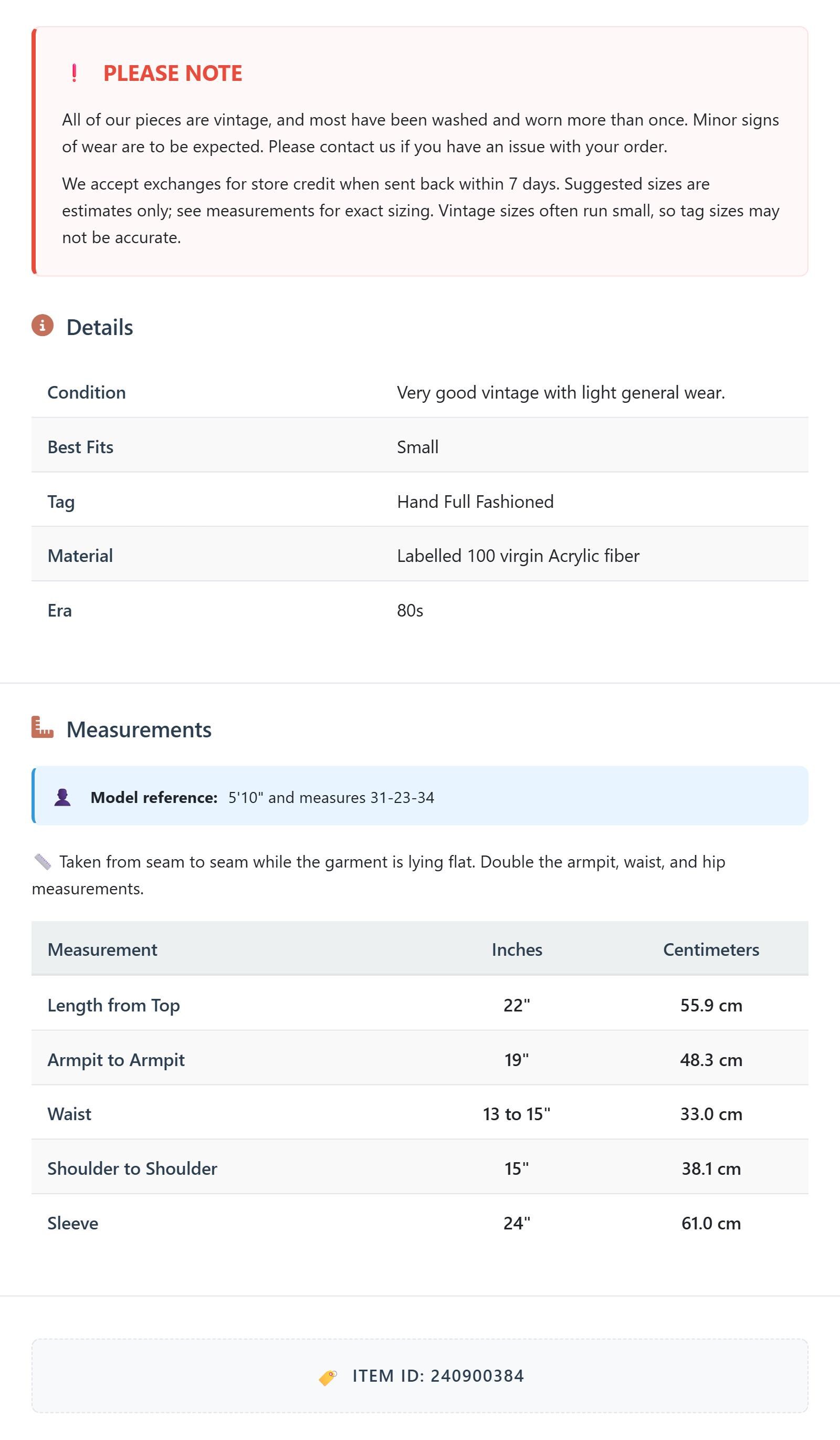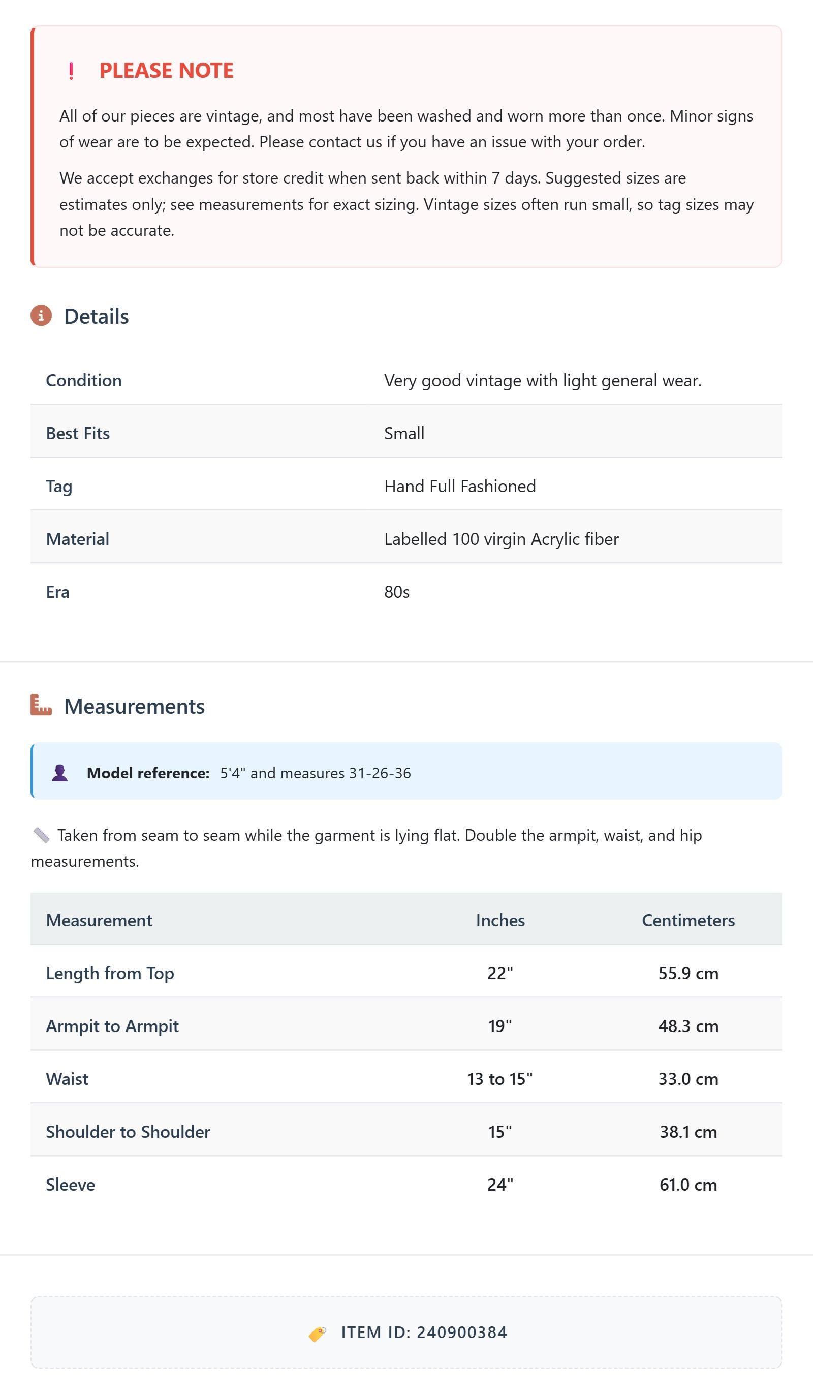 Suggested sizes are estimates only; see measurements for exact sizing. Vintage sizes often run small, so tag sizes may not be accurate.