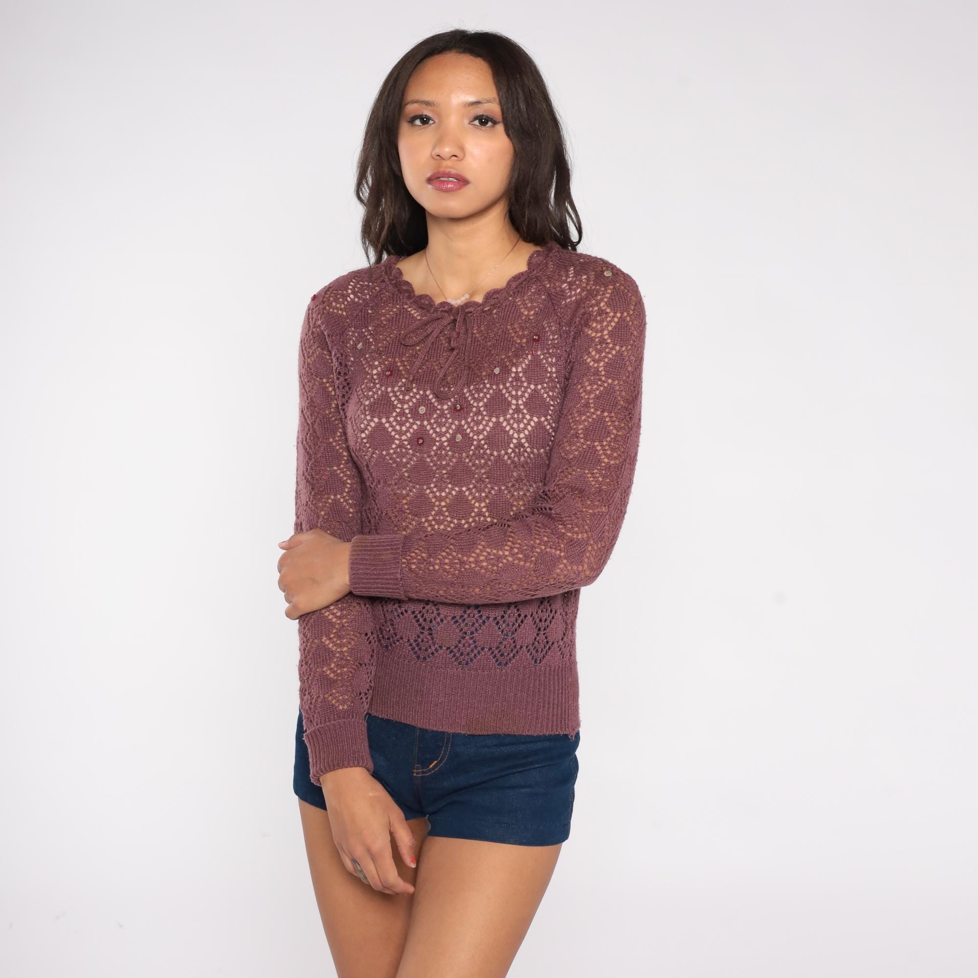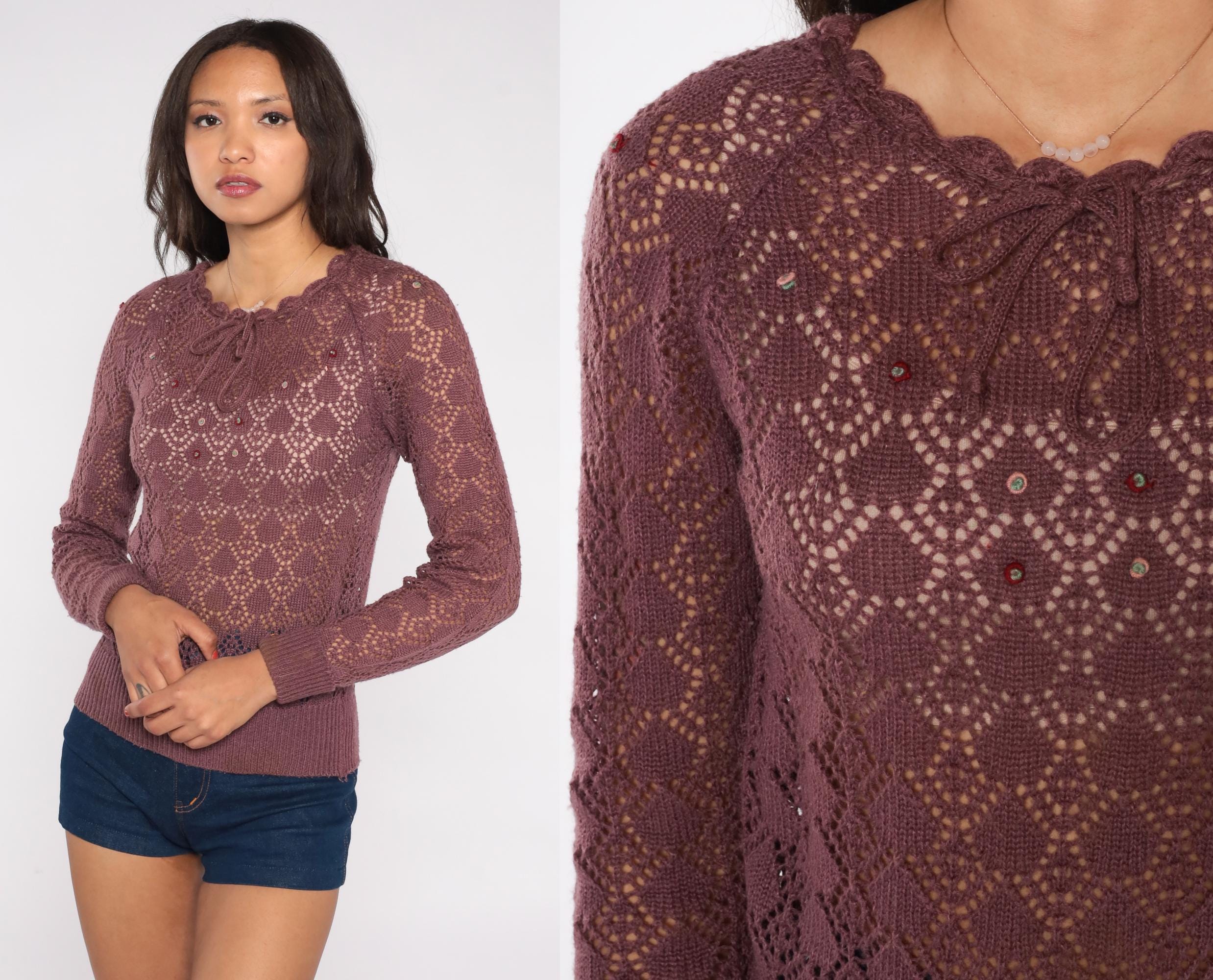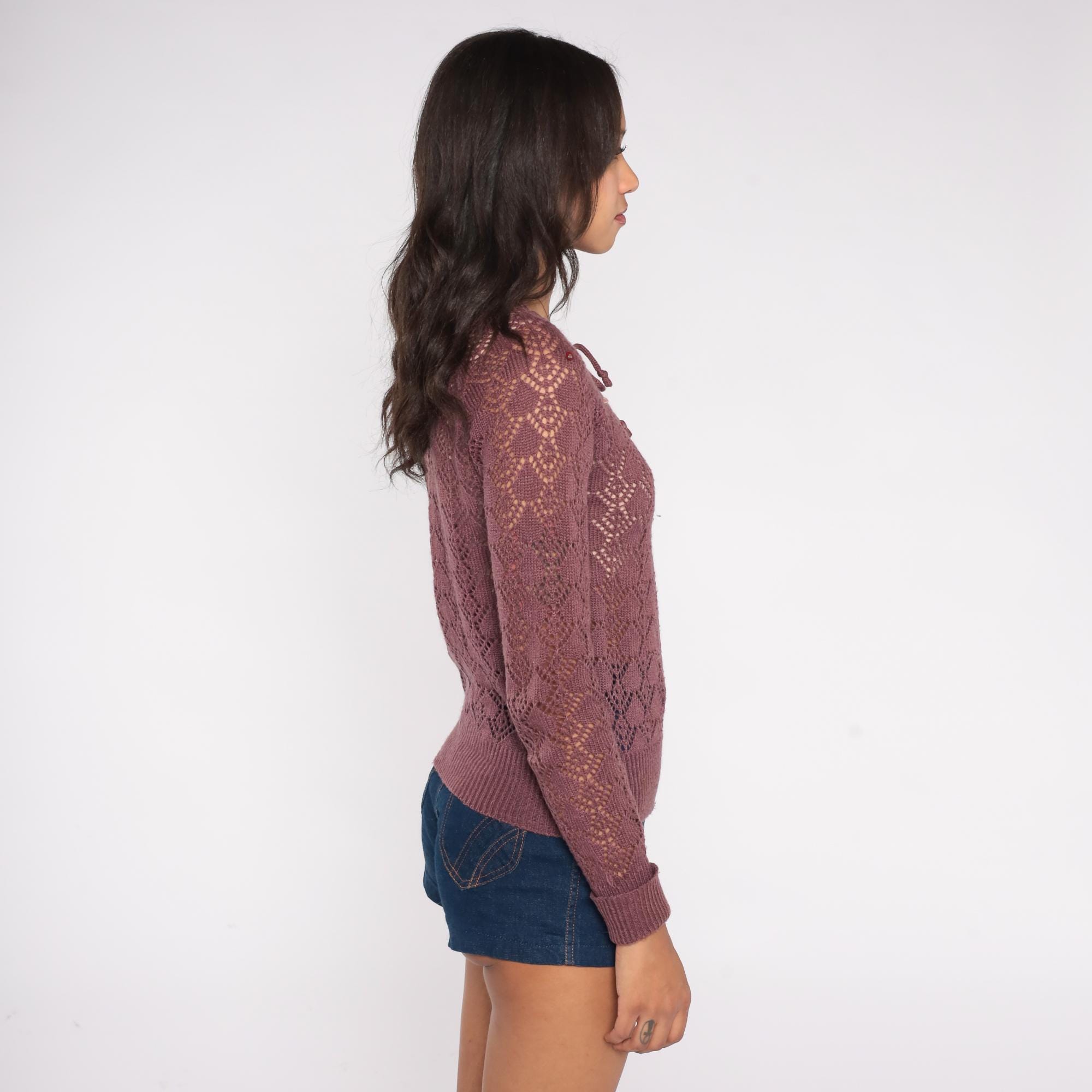 1980s purple/mauve sweater featuring delicate open knit lace pattern throughout. Romantic scalloped neckline with tie front closure. Long sleeves with ribbed cuffs. Diamond crochet pattern creates a semi-sheer effect. Has small embroidered flowers along the chest.