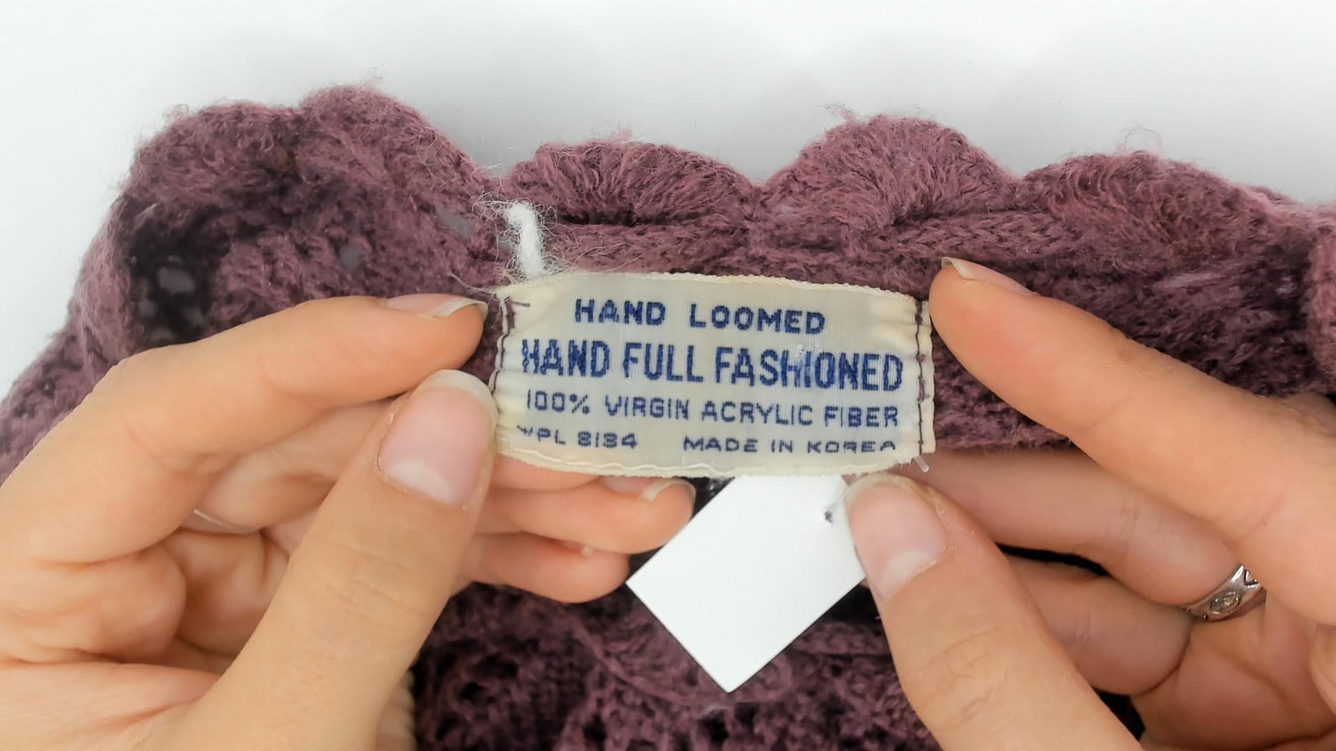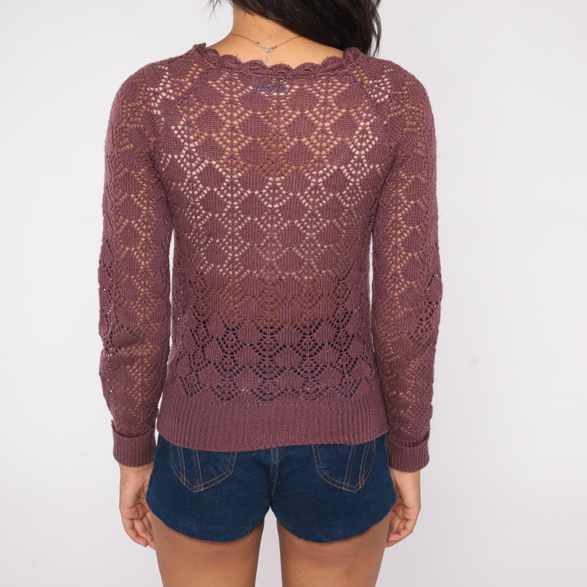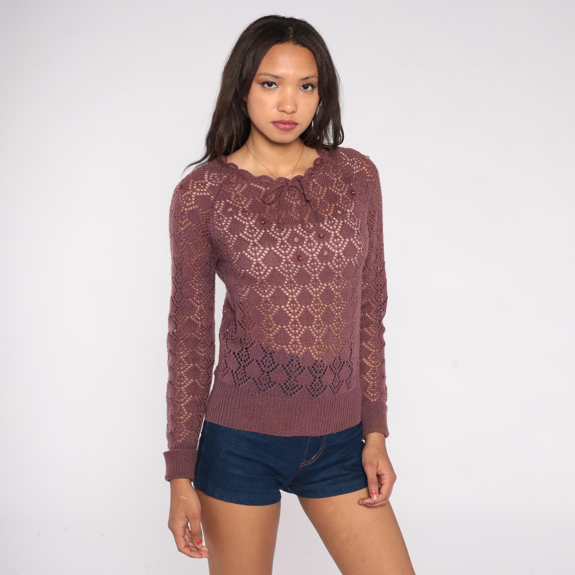 1980s purple/mauve sweater featuring delicate open knit lace pattern throughout. Romantic scalloped neckline with tie front closure. Long sleeves with ribbed cuffs. Diamond crochet pattern creates a semi-sheer effect. Has small embroidered flowers along the chest.