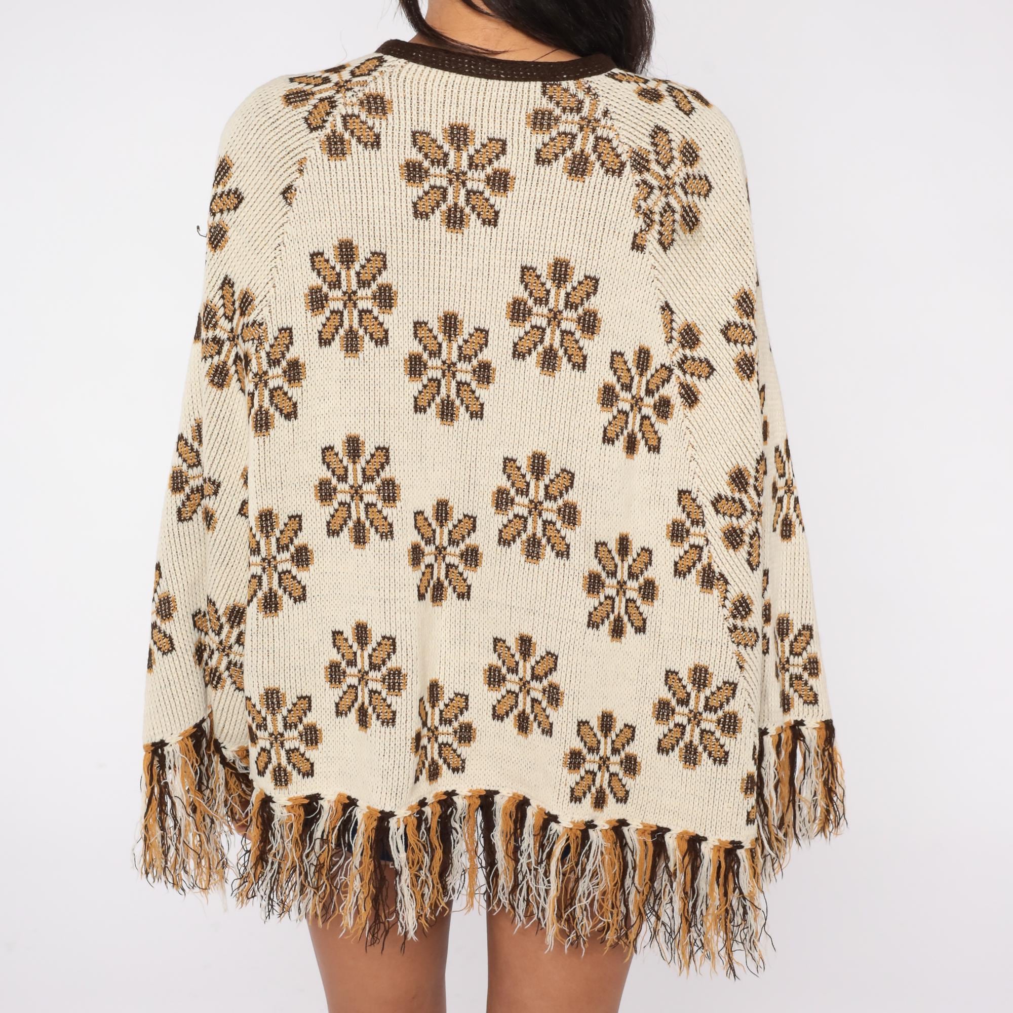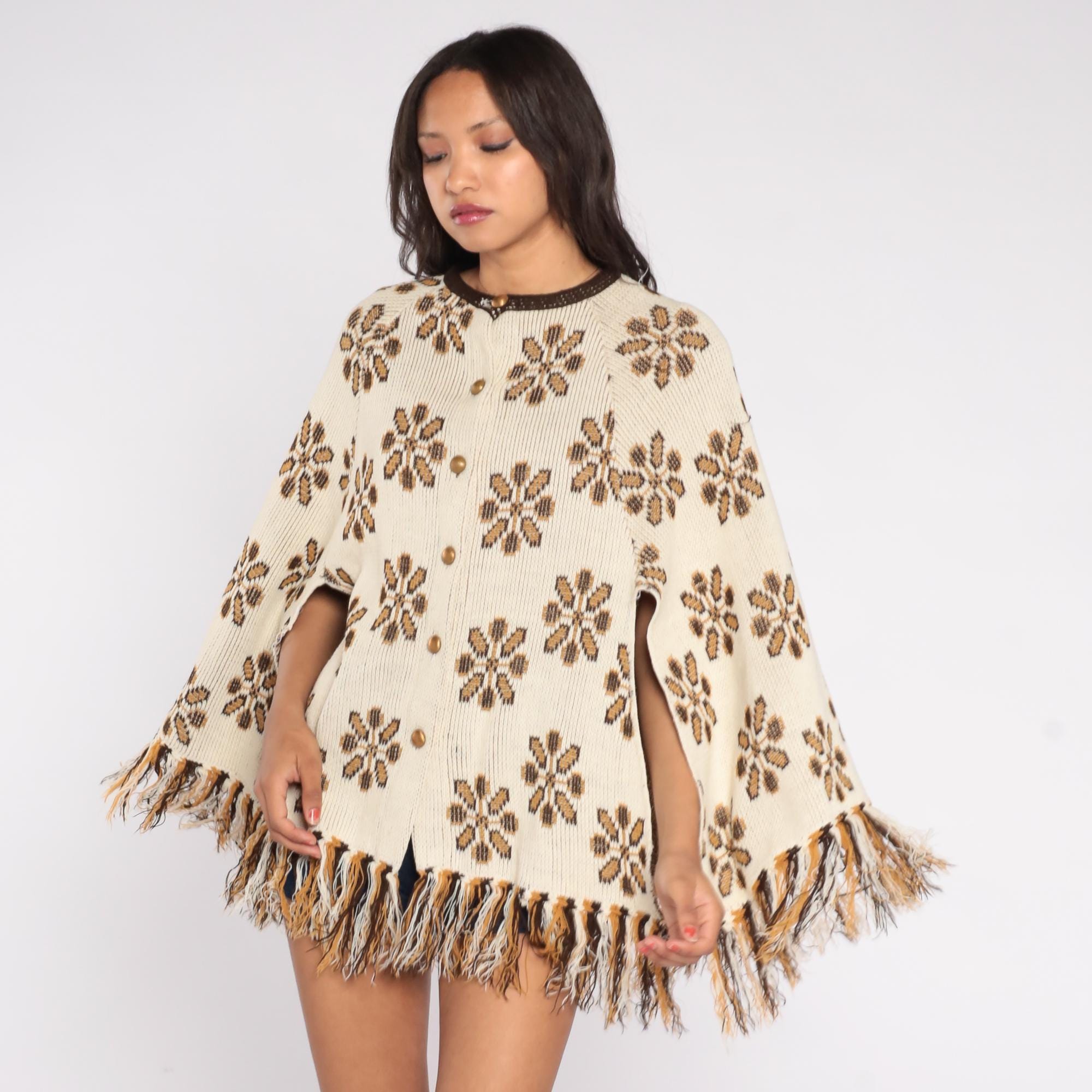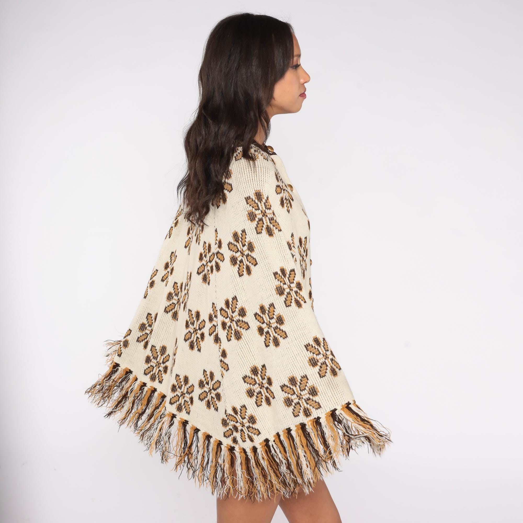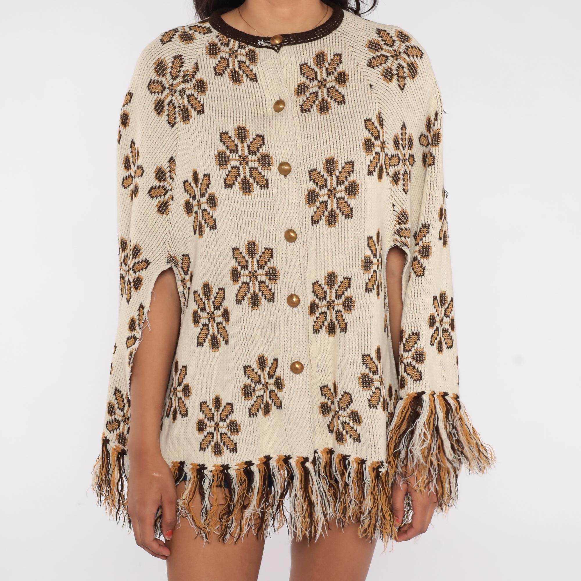 1970s cream knit poncho featuring brown daisy flower pattern throughout. Button-front cape style with brown trim around neckline. Finished with multicolor fringe in cream, brown, and tan tones along bottom hem.