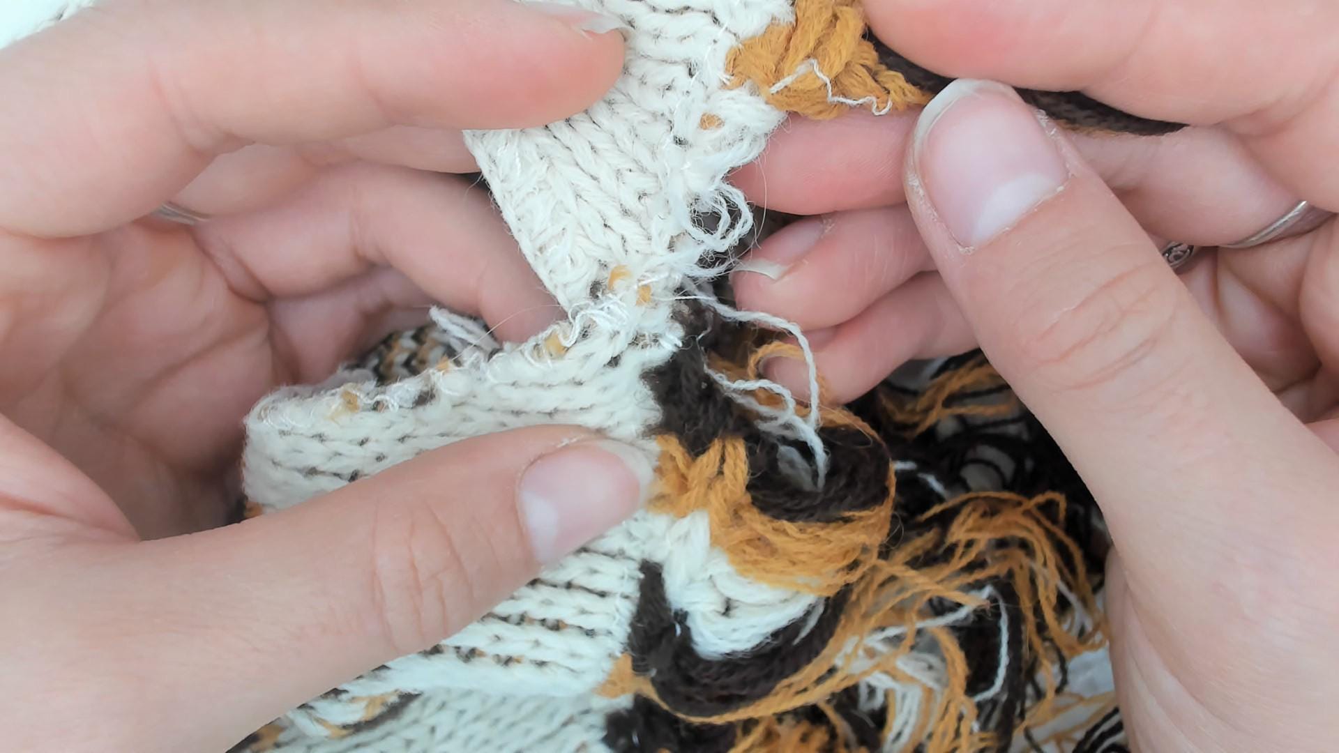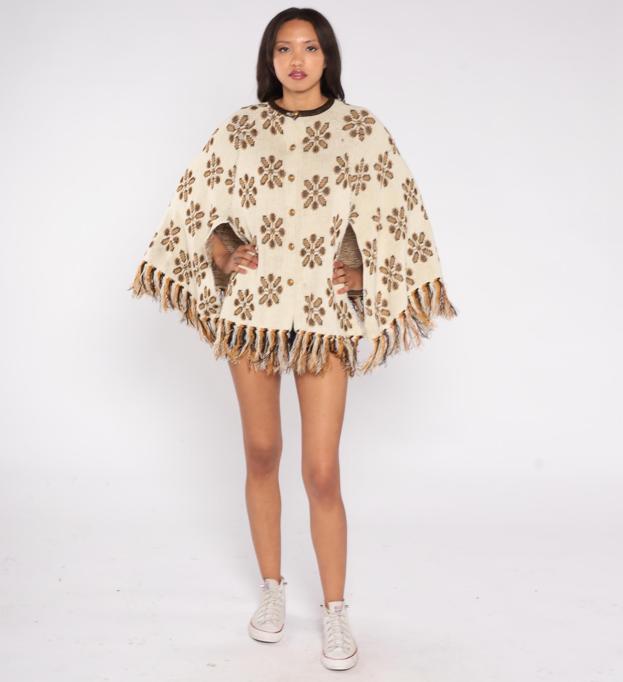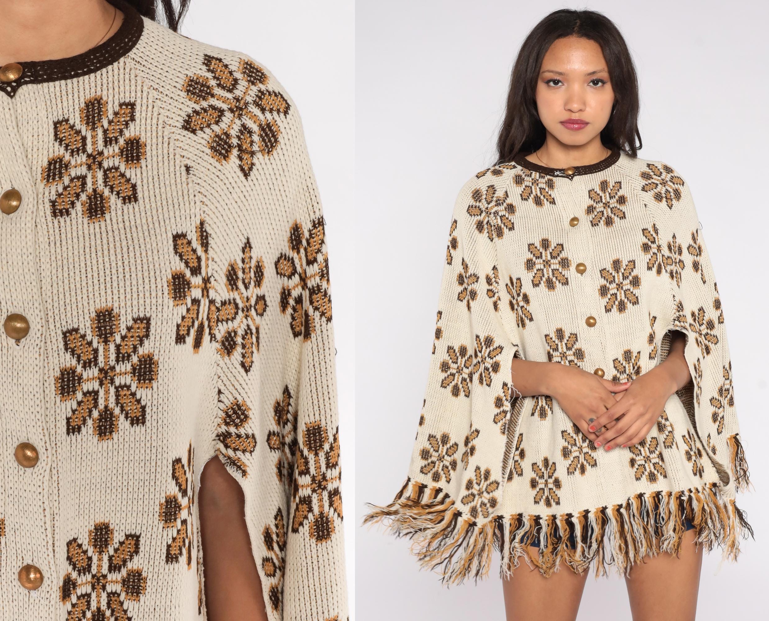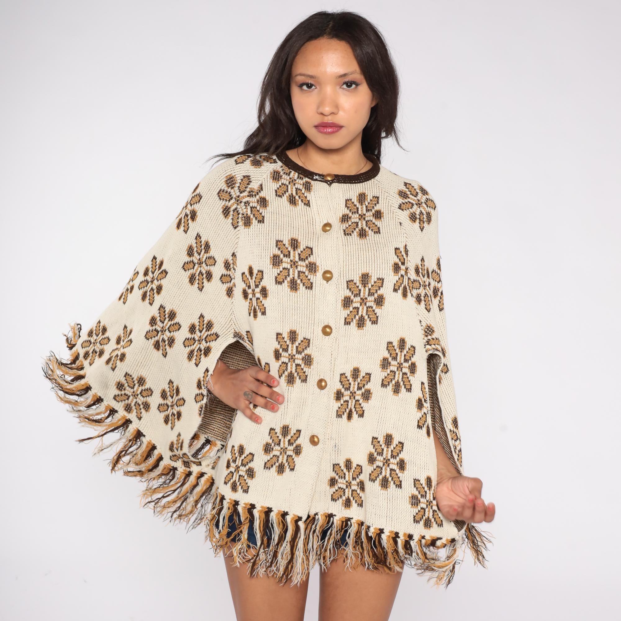 1970s cream knit poncho featuring brown daisy flower pattern throughout. Button-front cape style with brown trim around neckline. Finished with multicolor fringe in cream, brown, and tan tones along bottom hem.
