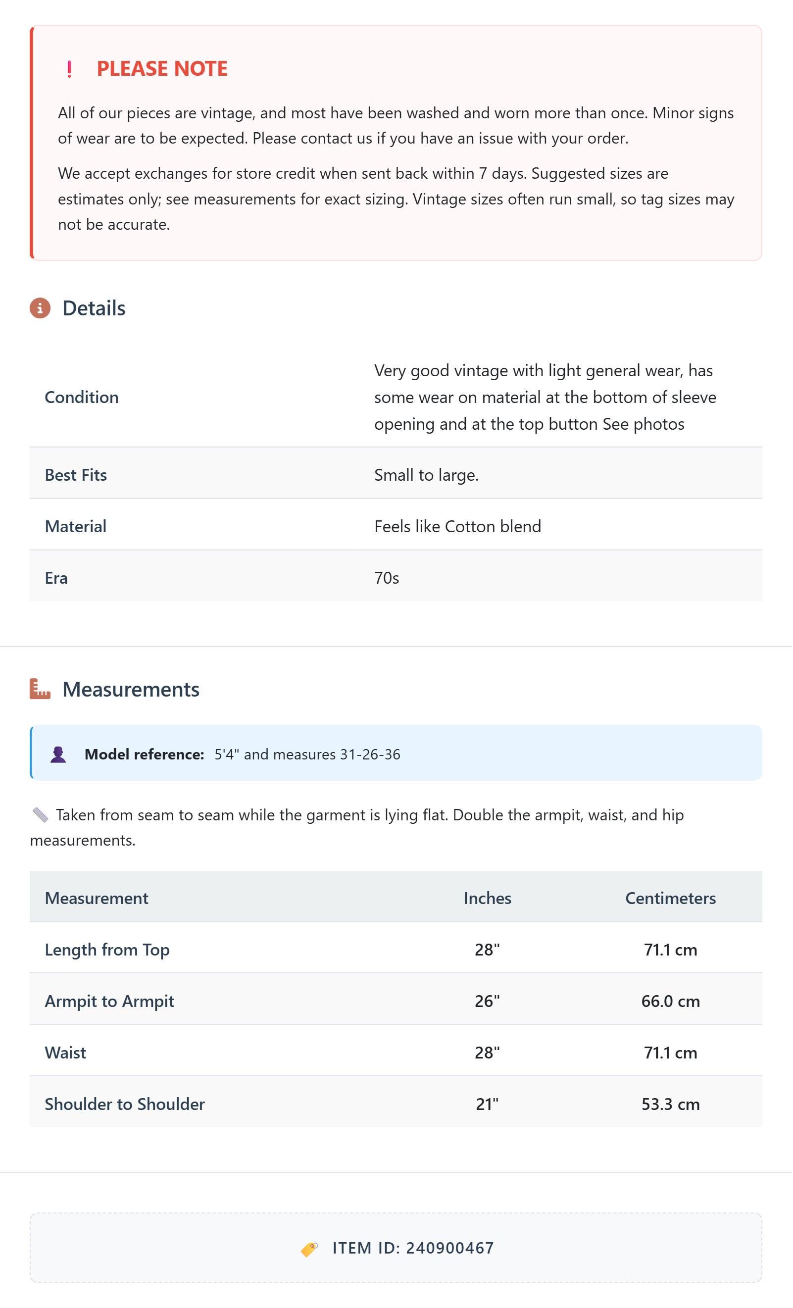 All of our pieces are vintage, and most have been washed and worn more than once. Minor signs of wear are to be expected. Please contact us if you have an issue with your order. We accept exchanges for store credit when sent back within 7 days.