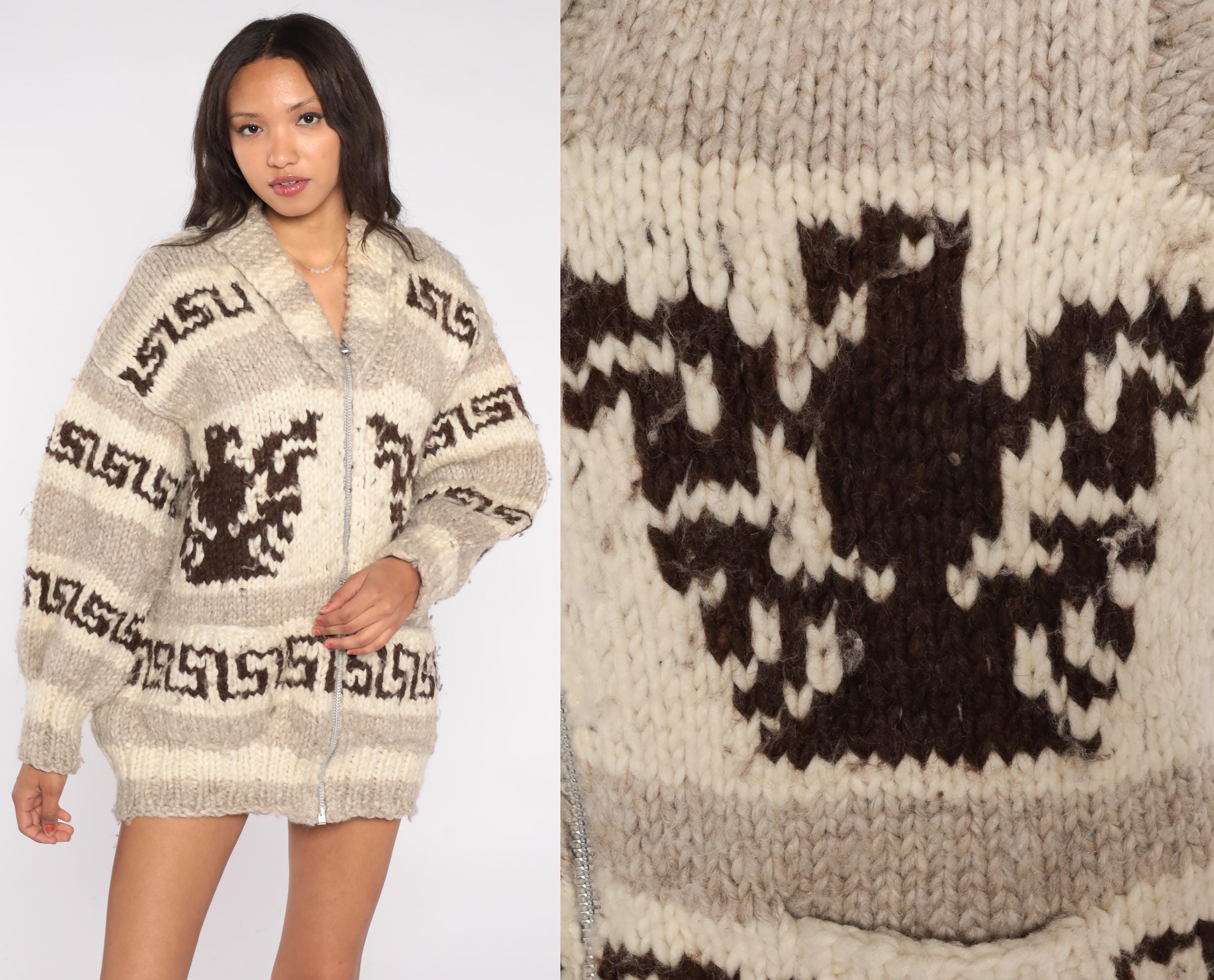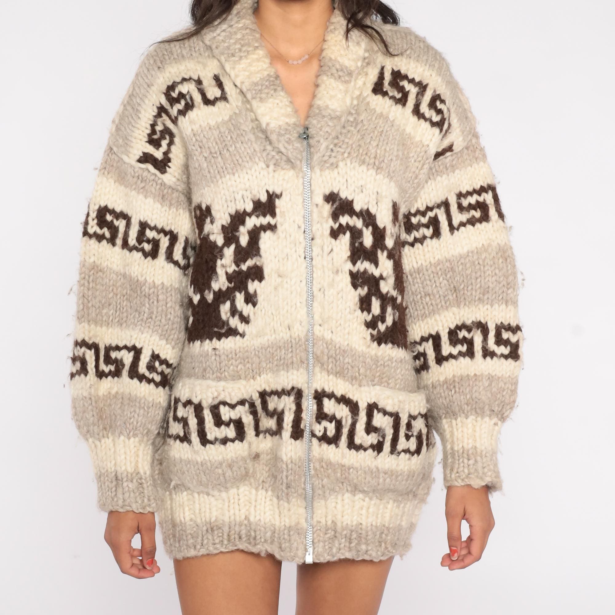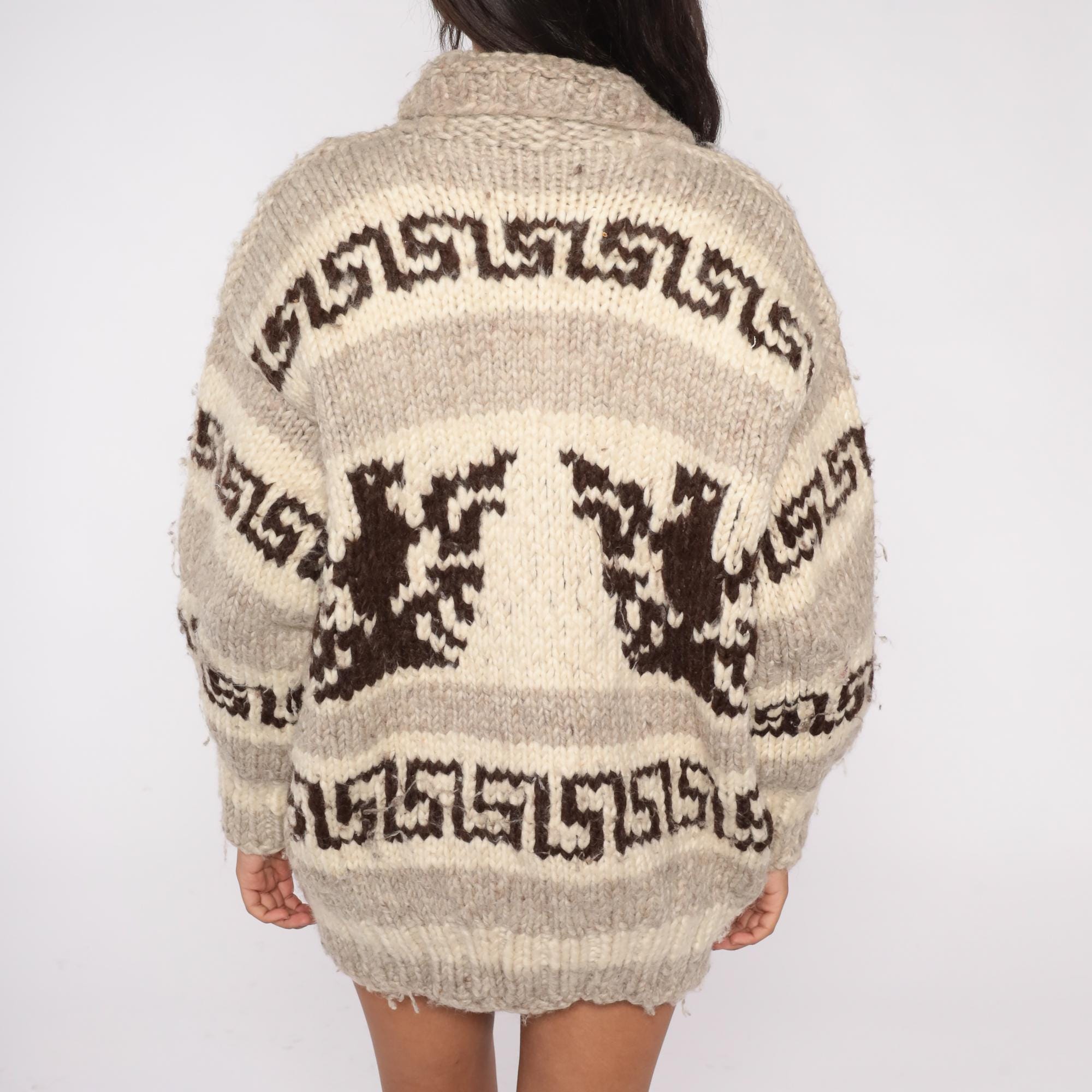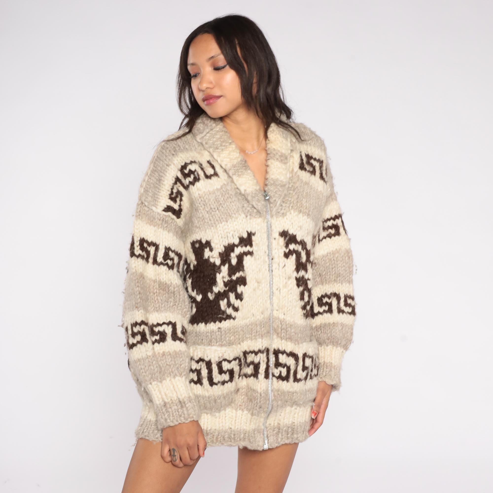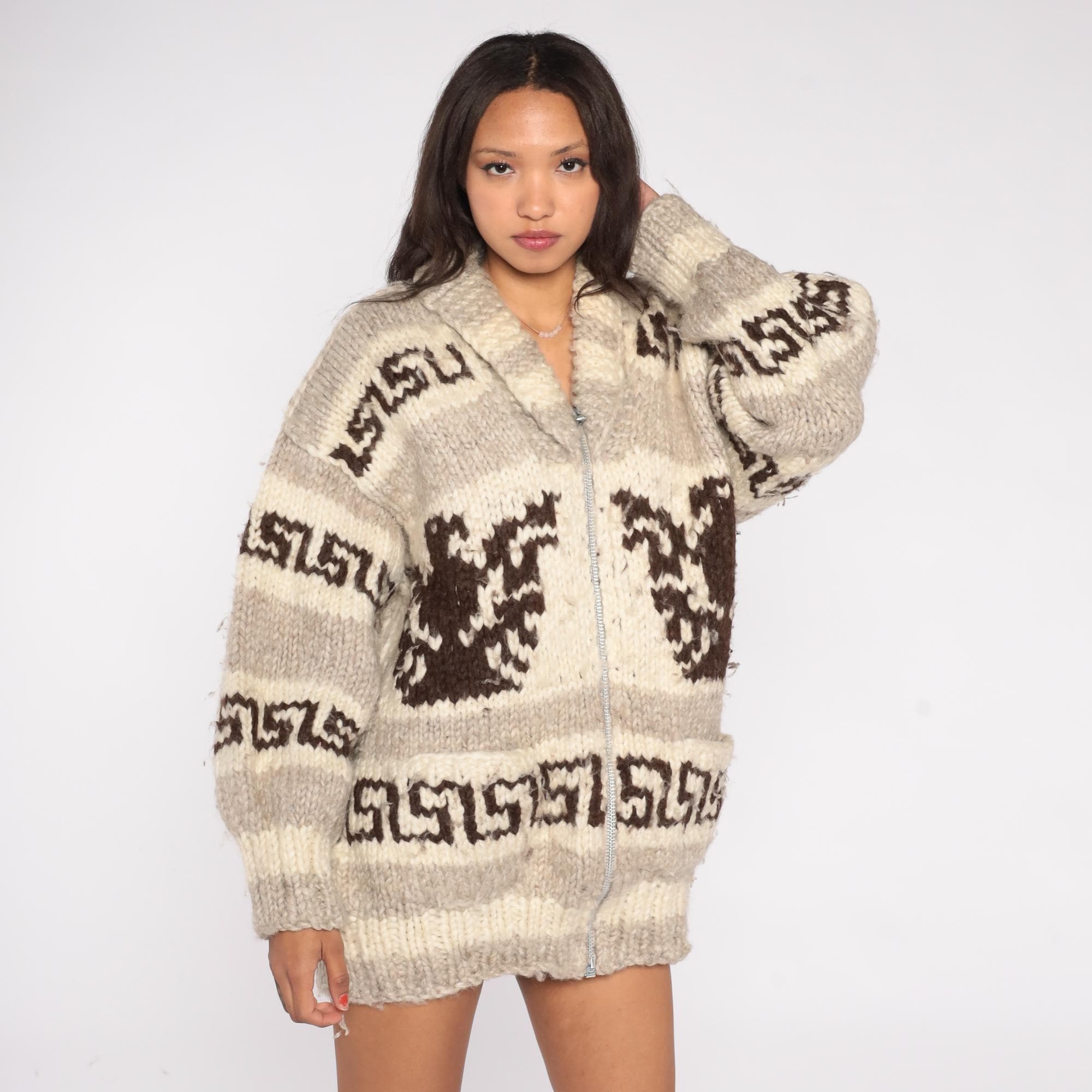 1970s chunky knit cardigan featuring a bold eagle and geometric pattern in brown and cream. Inspired by traditional Cowichan sweaters with distinctive southwestern motifs. Full-length metal zipper front closure with shawl collar. Made from wool blend with a substantial, warm hand feel.