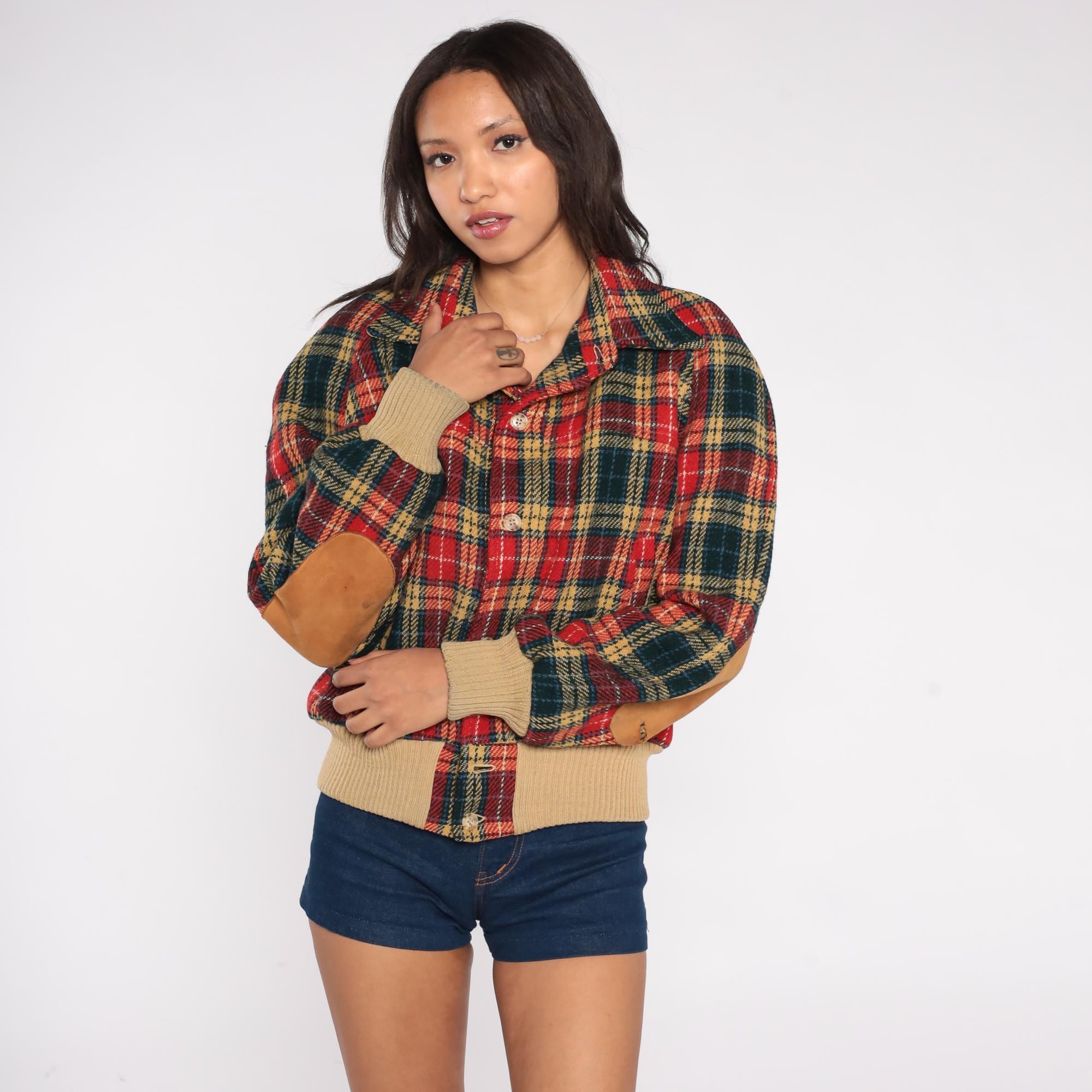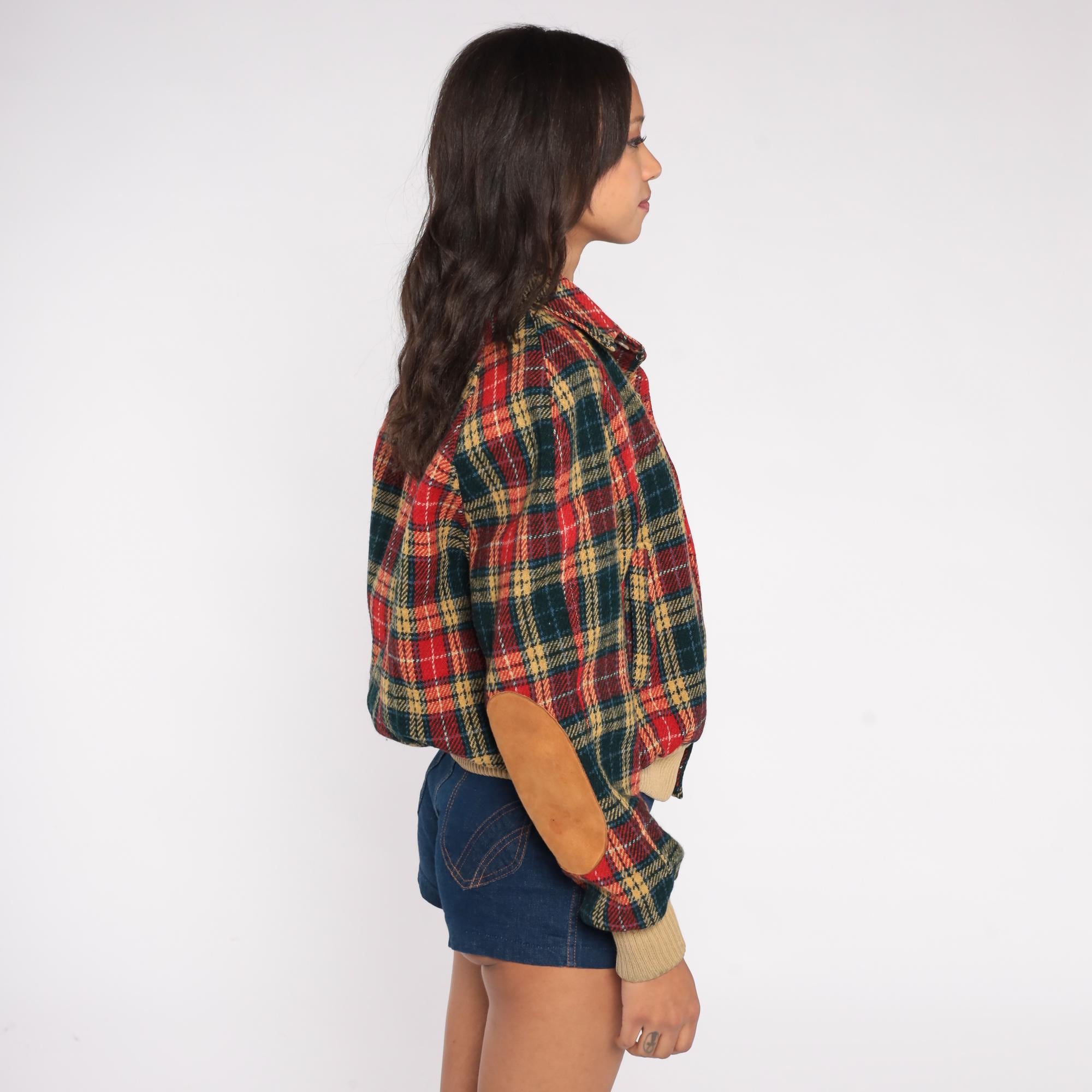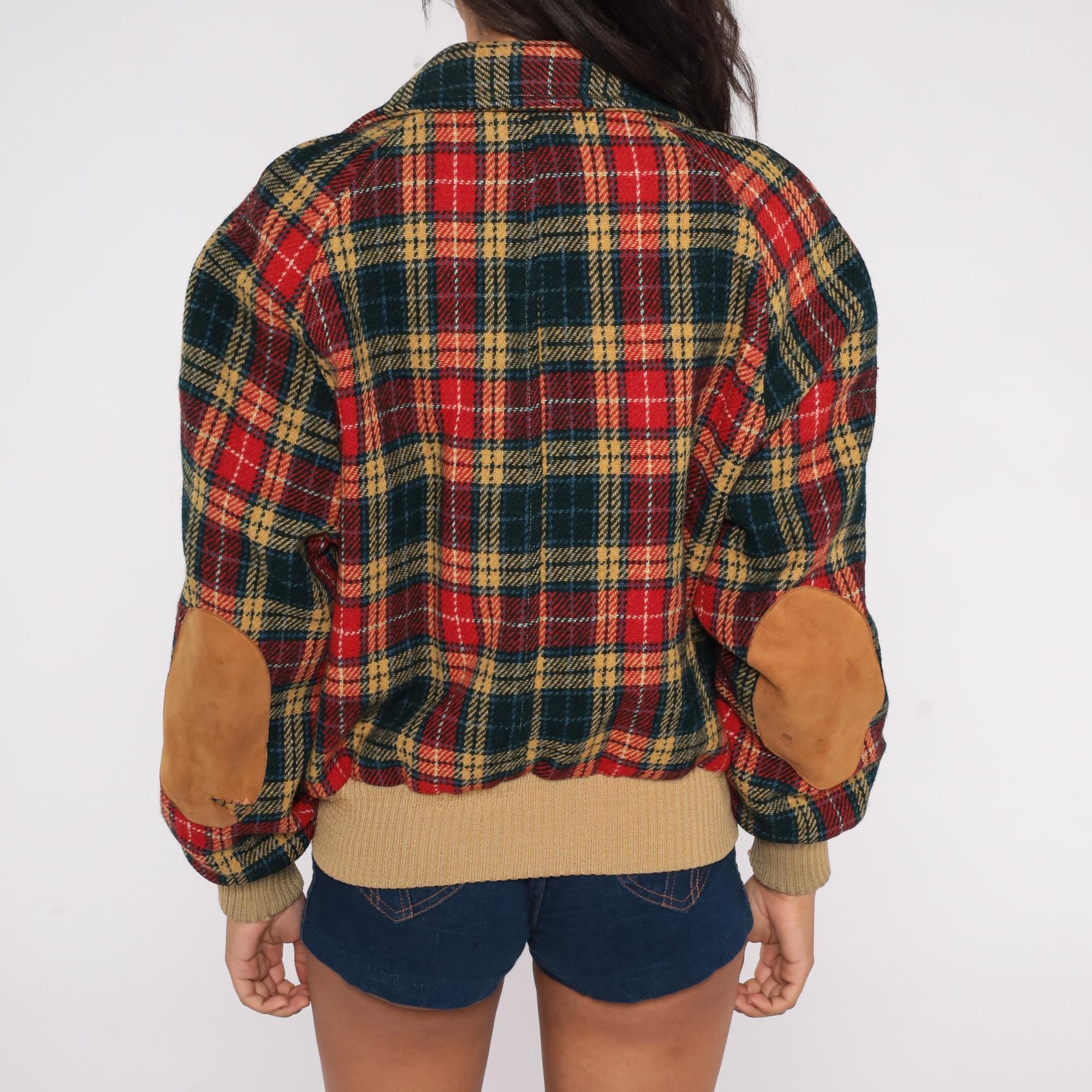 1970s tartan plaid bomber jacket in classic red, green, and tan color scheme. Features traditional button front closure with ribbed tan trim at waist and cuffs. Distinctive suede elbow patches add sophistication to this preppy piece. Missing some suede on one elbow, with some mended areas at sleeve cuffs.