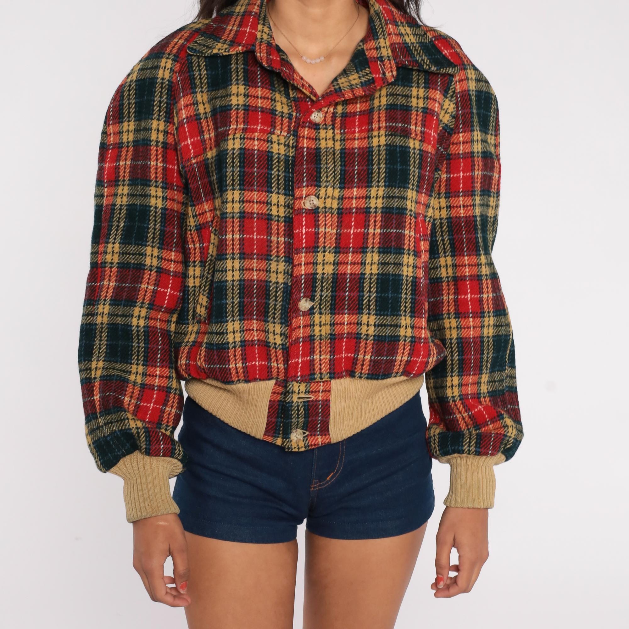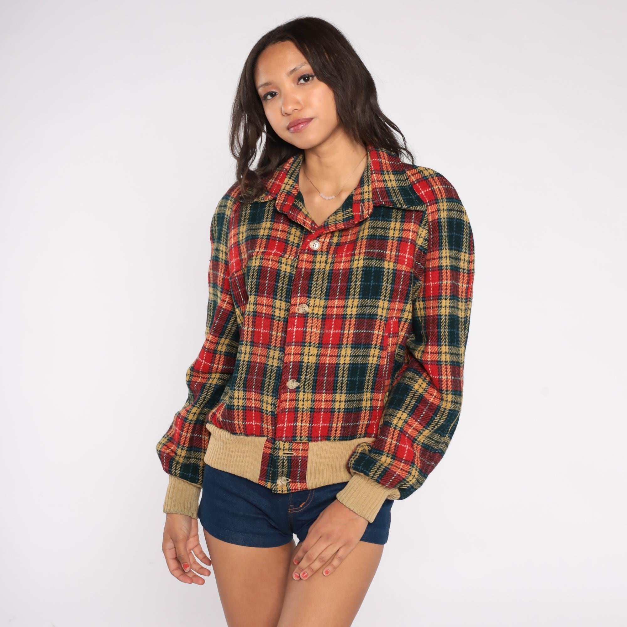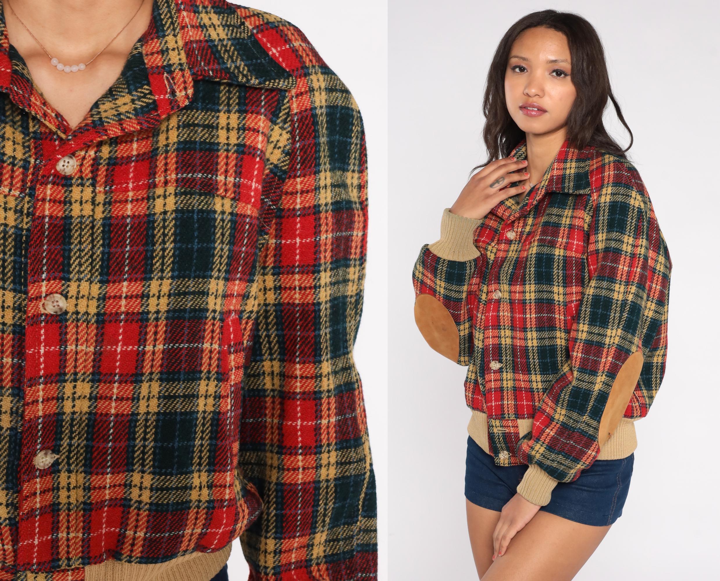 1970s tartan plaid bomber jacket in classic red, green, and tan color scheme. Features traditional button front closure with ribbed tan trim at waist and cuffs. Distinctive suede elbow patches add sophistication to this preppy piece. Missing some suede on one elbow, with some mended areas at sleeve cuffs.