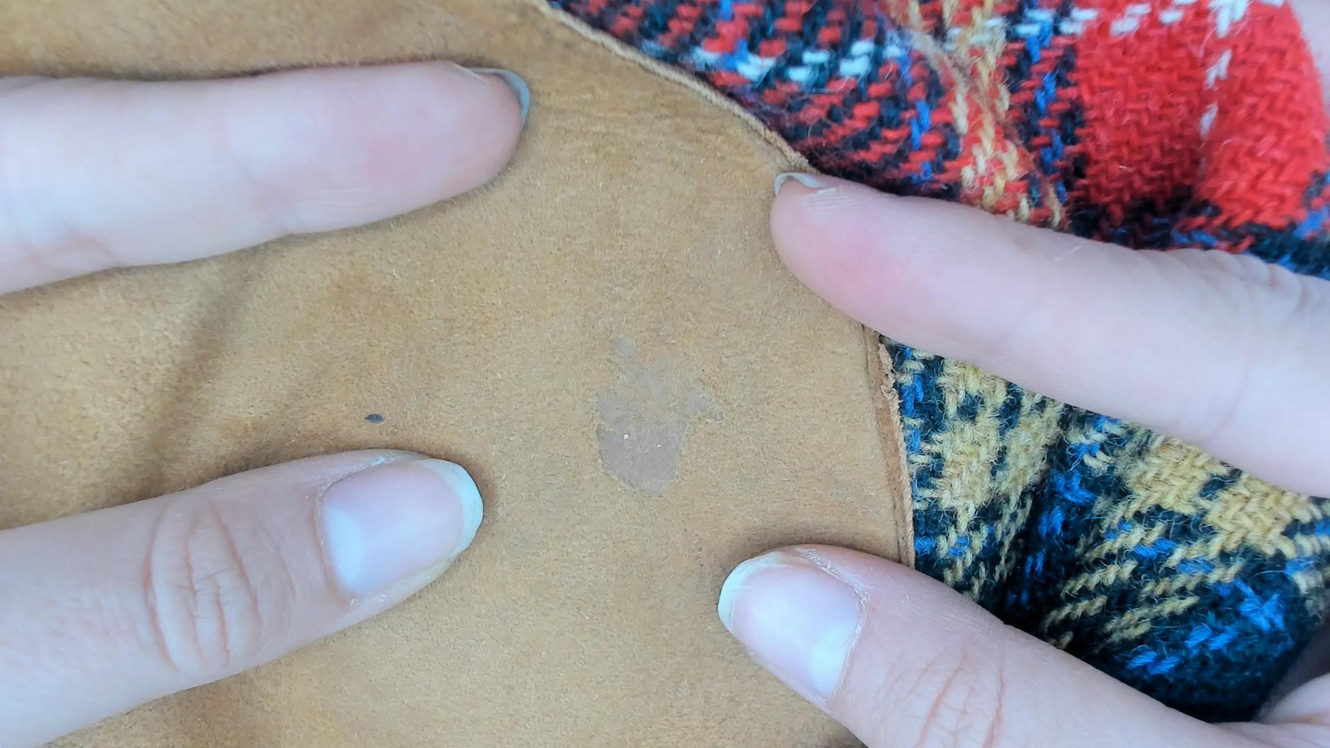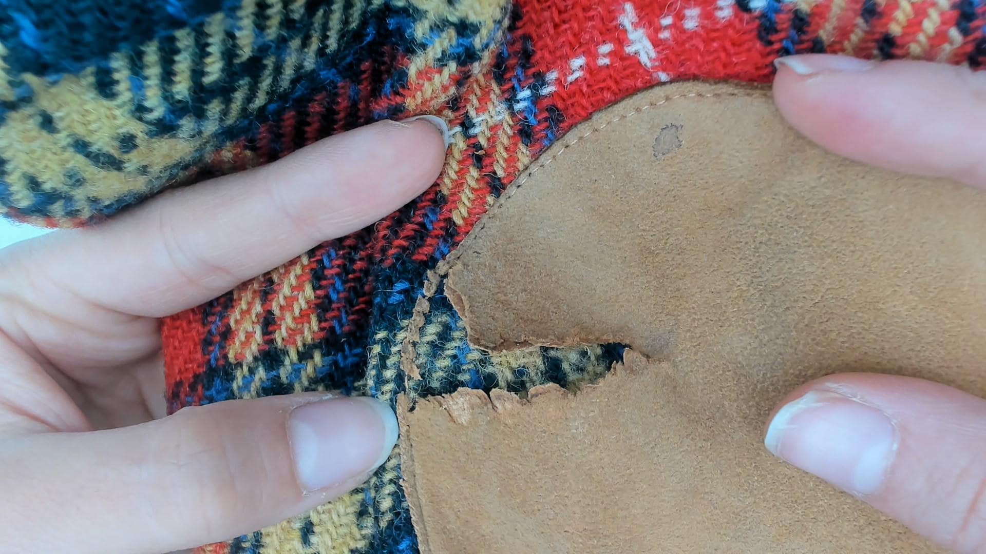Condition: Gently worn in, missing some of the suede material on one of the elbows, looks like lining and sleeve cuffs were mended by previous owner See photos