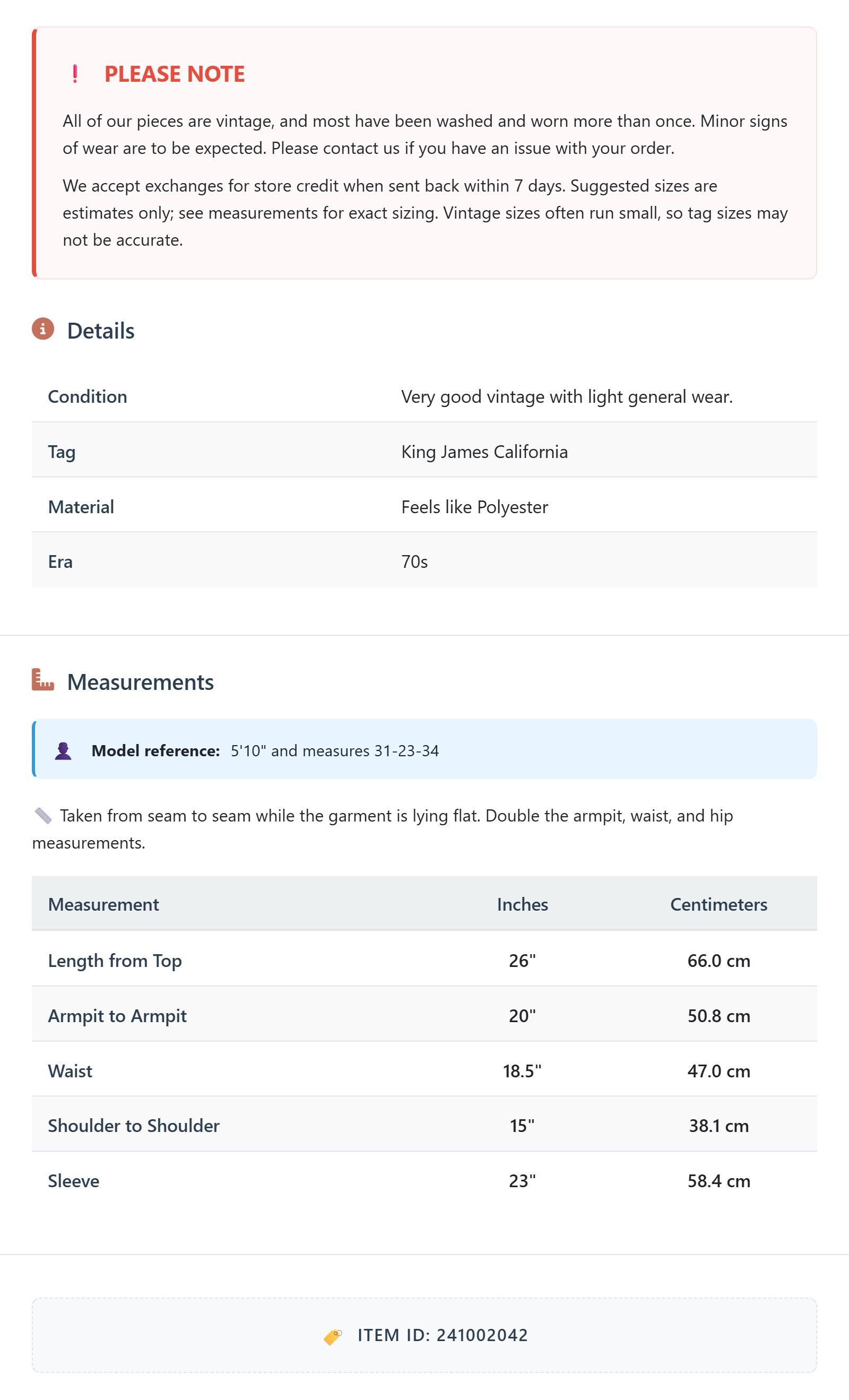 All of our pieces are vintage, and most have been washed and worn more than once. Minor signs of wear are to be expected. Please contact us if you have an issue with your order. We accept exchanges for store credit when sent back within 7 days.