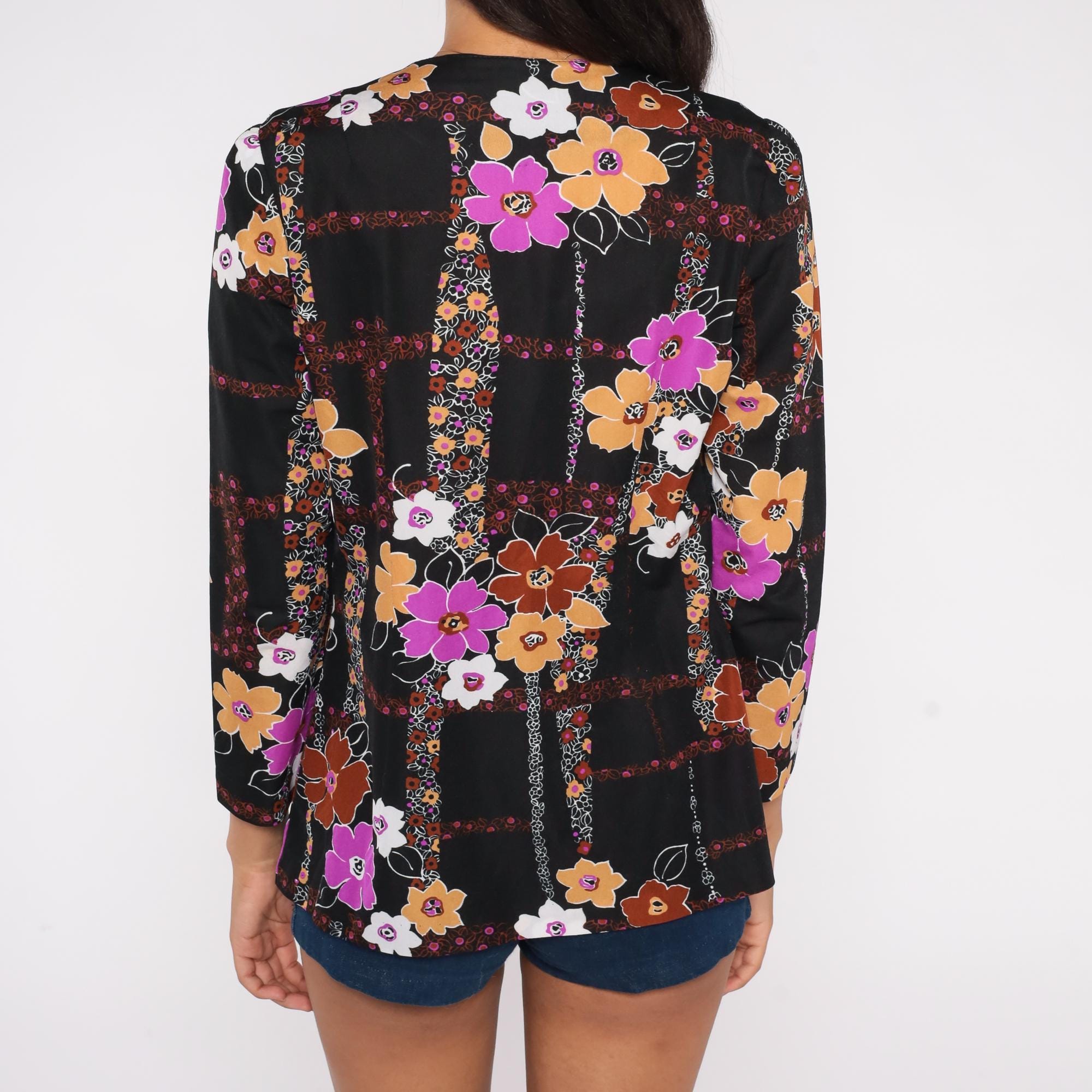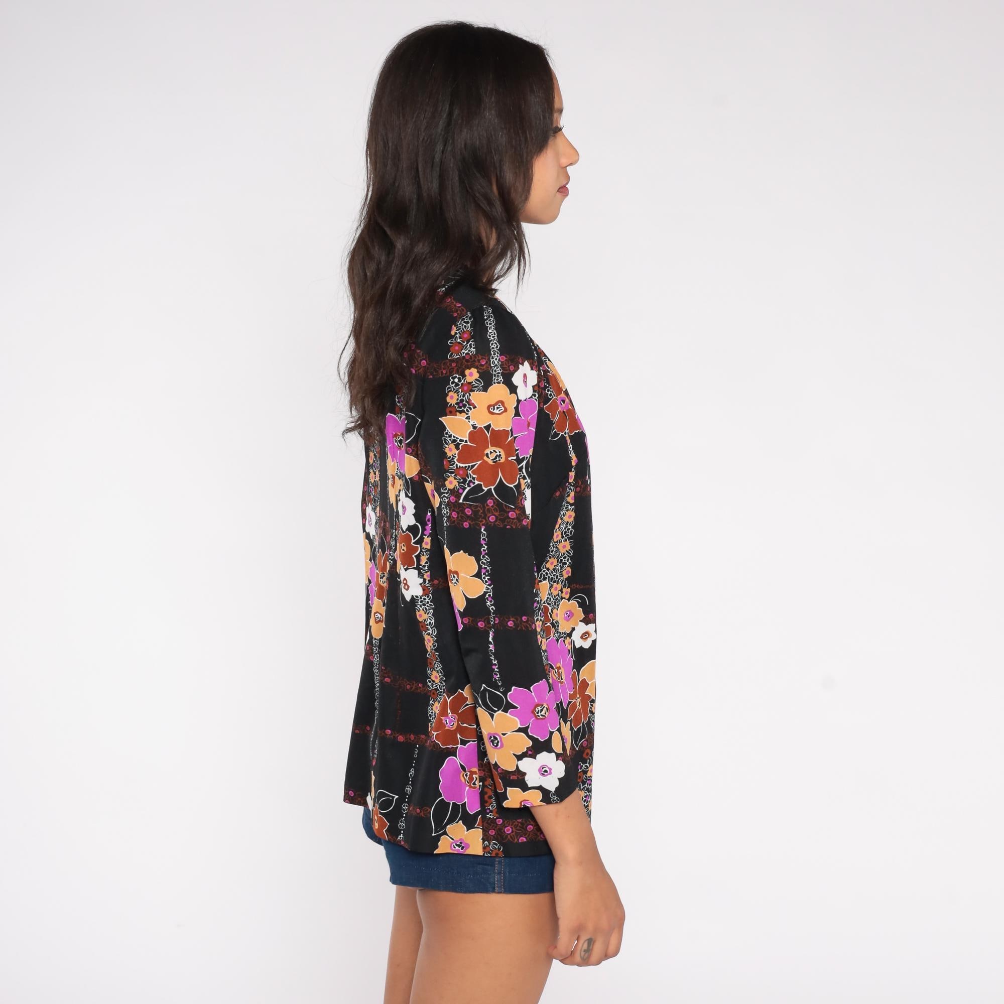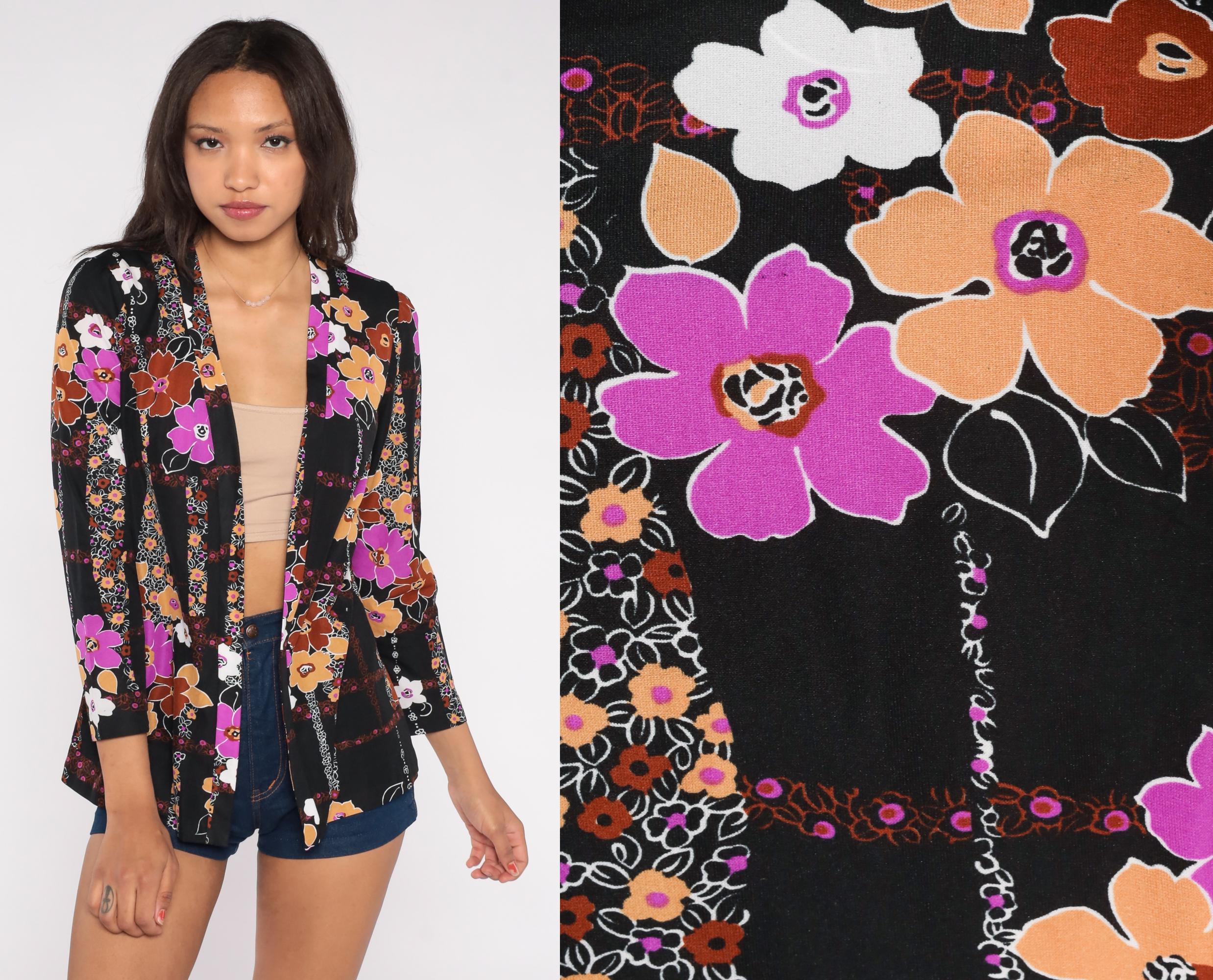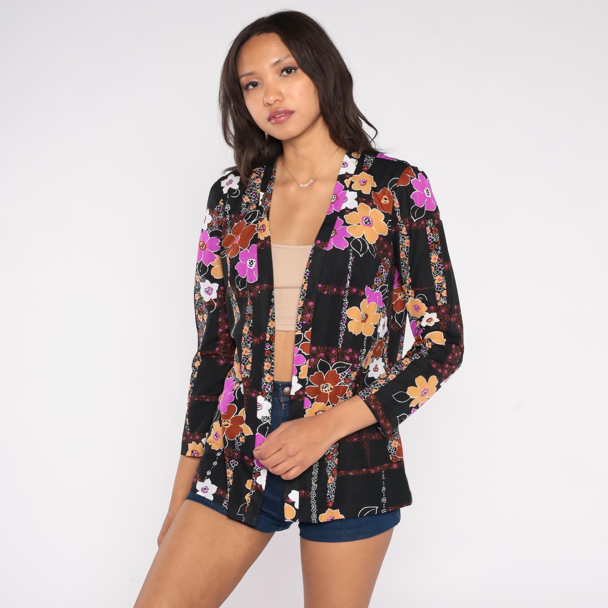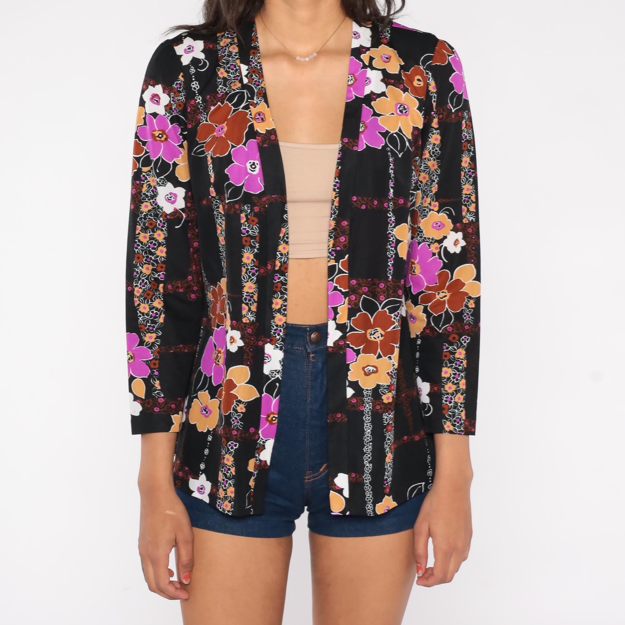 Vintage 70s floral blazer featuring a bold black background with bright pink, orange, brown, and white flower print. Designed with a long sleeve and open front silhouette.