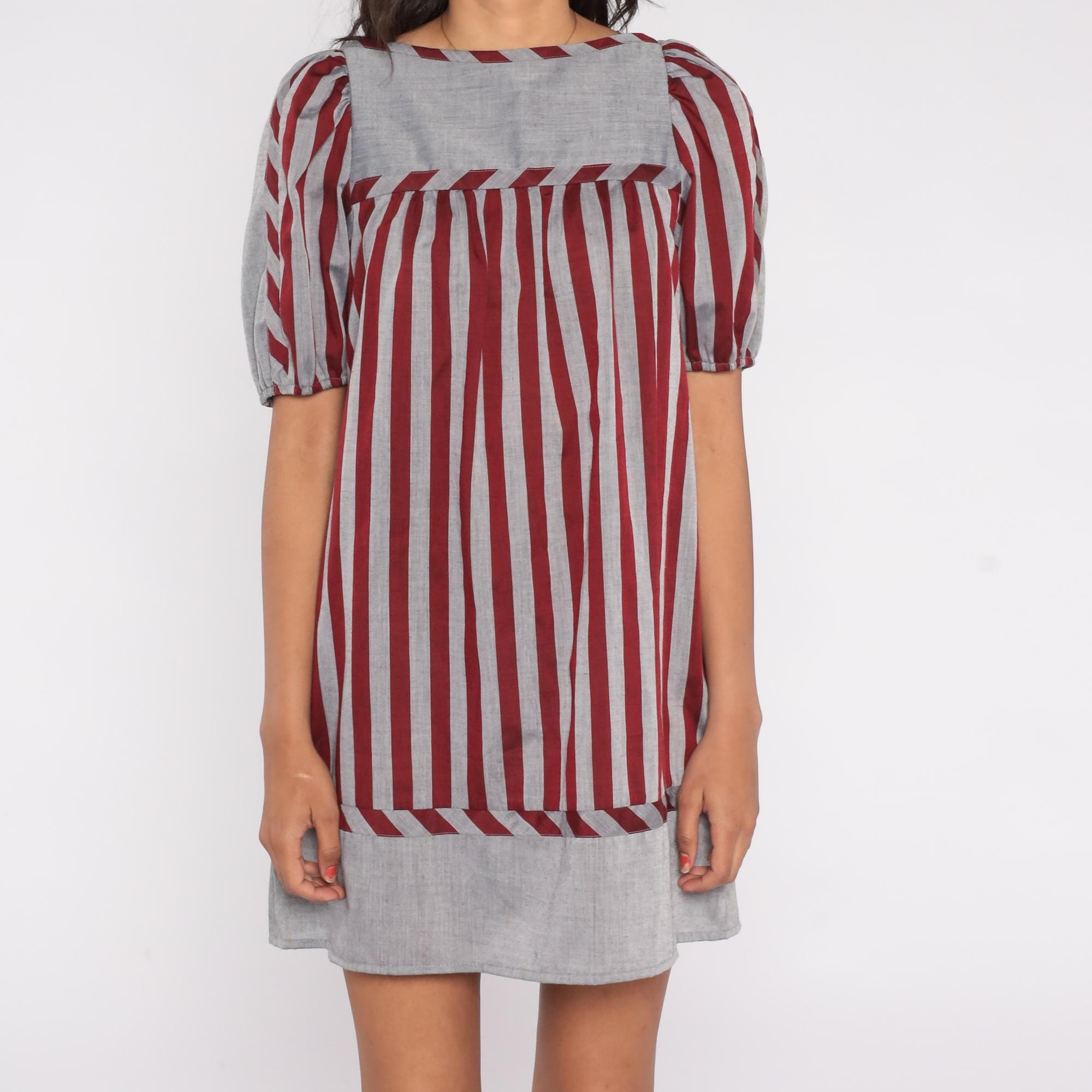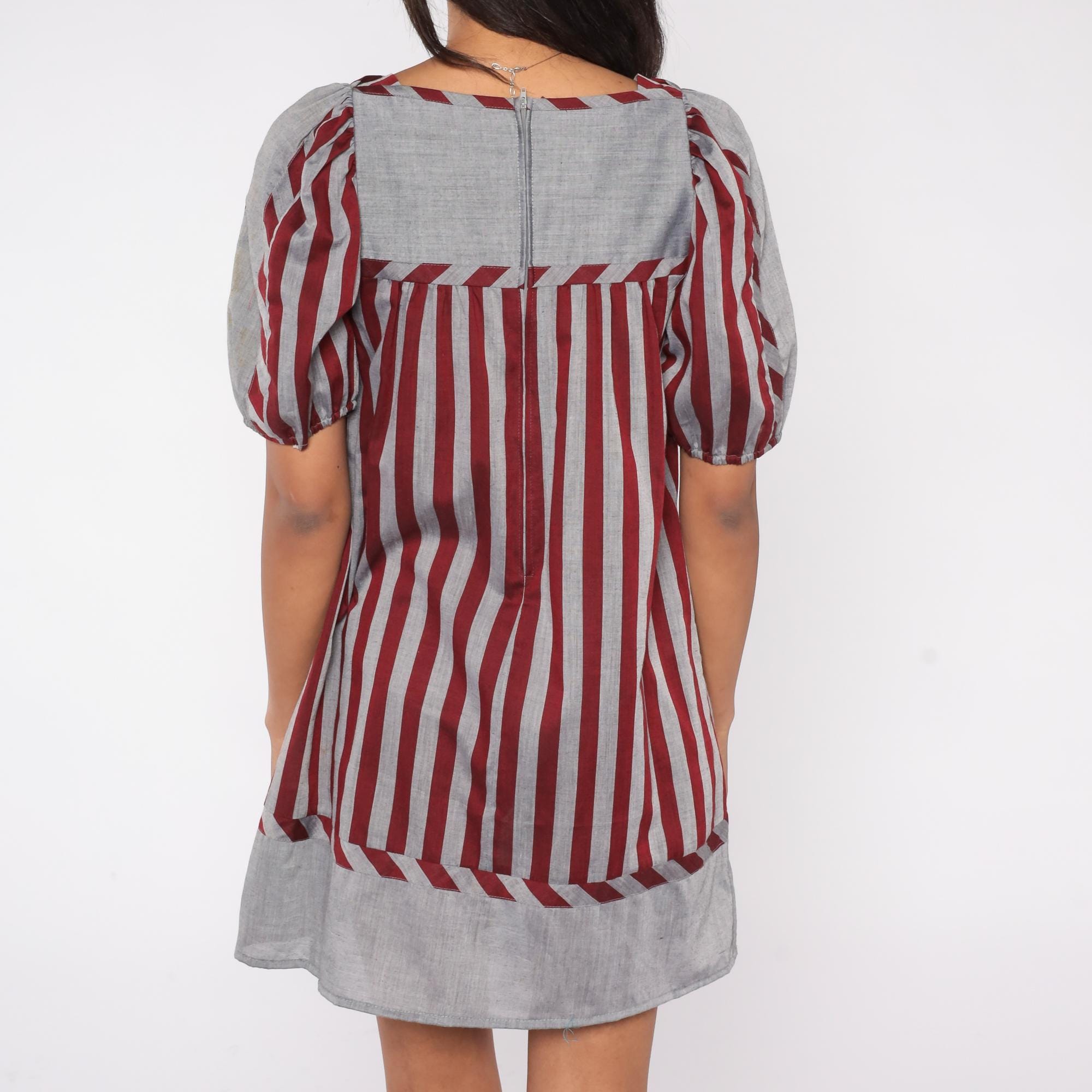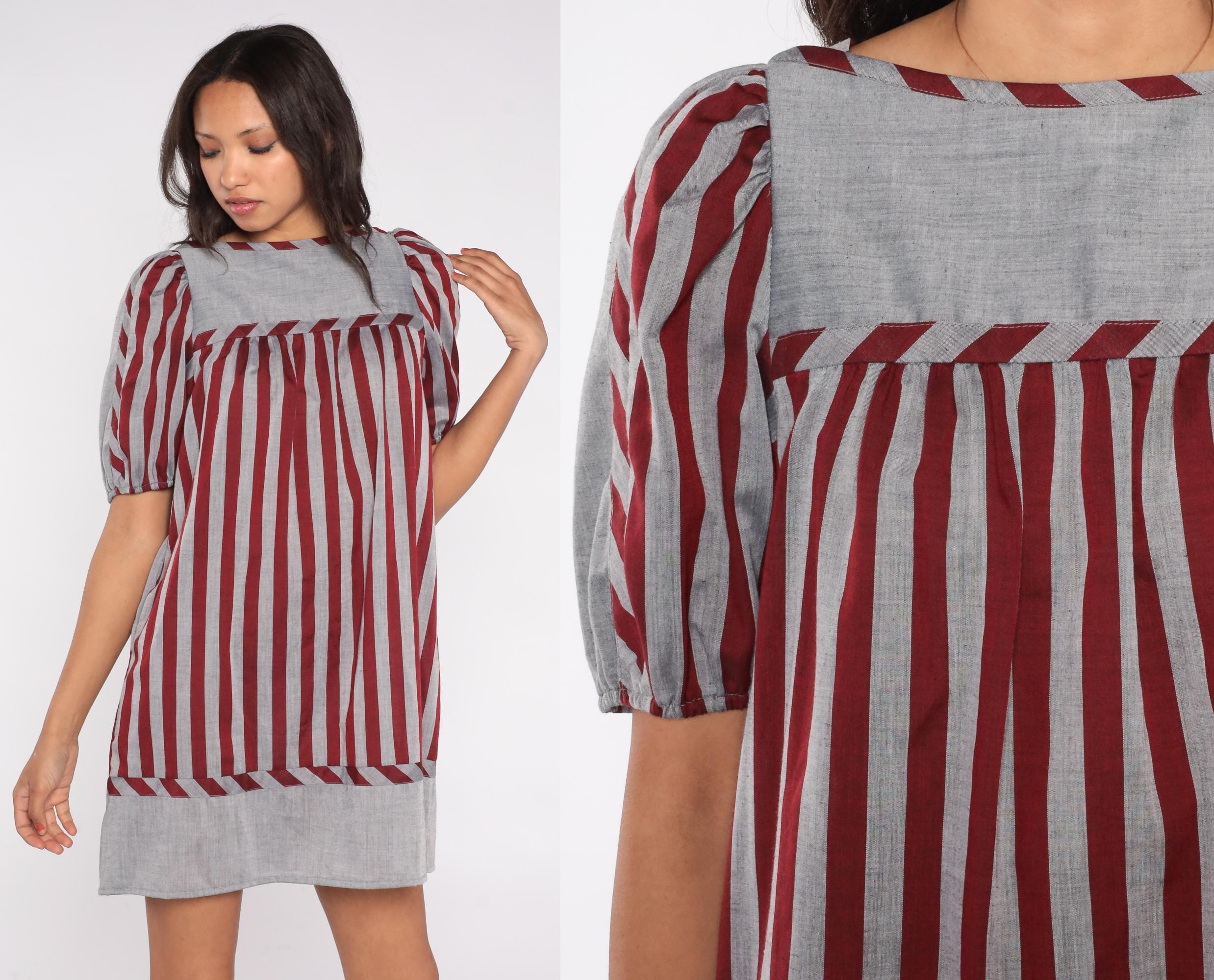 Vintage 80s striped dress by Mako Hawaii featuring red and gray vertical stripes with a contrast panel at the neckline and hem. Designed with short puff sleeves, a square neckline, and a shift-style silhouette with a back zipper closure.