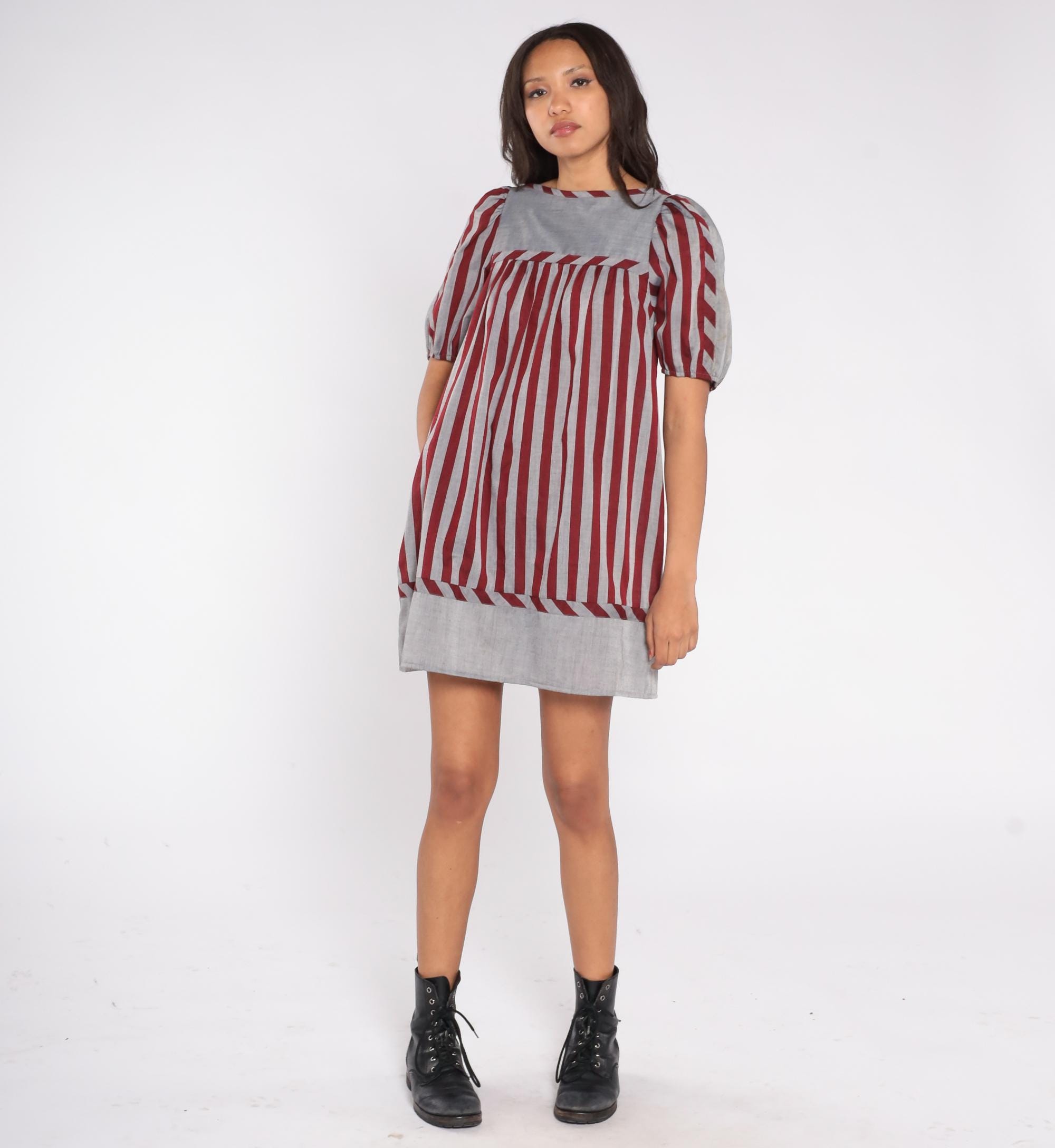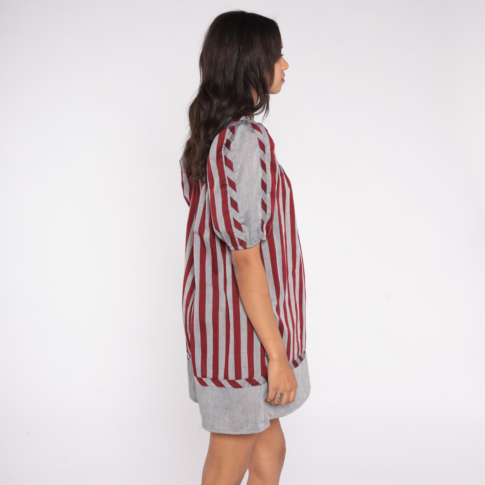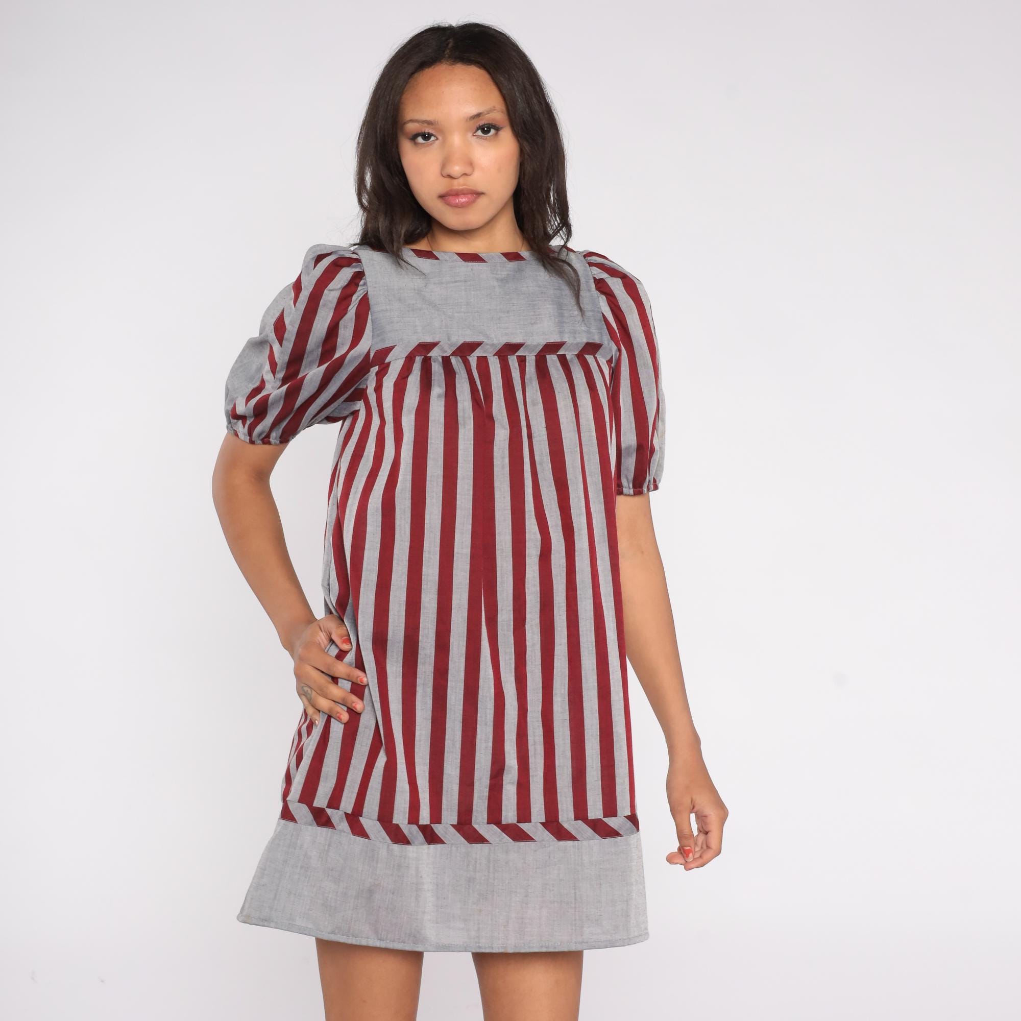 Vintage 80s striped dress by Mako Hawaii featuring red and gray vertical stripes with a contrast panel at the neckline and hem. Designed with short puff sleeves, a square neckline, and a shift-style silhouette with a back zipper closure.