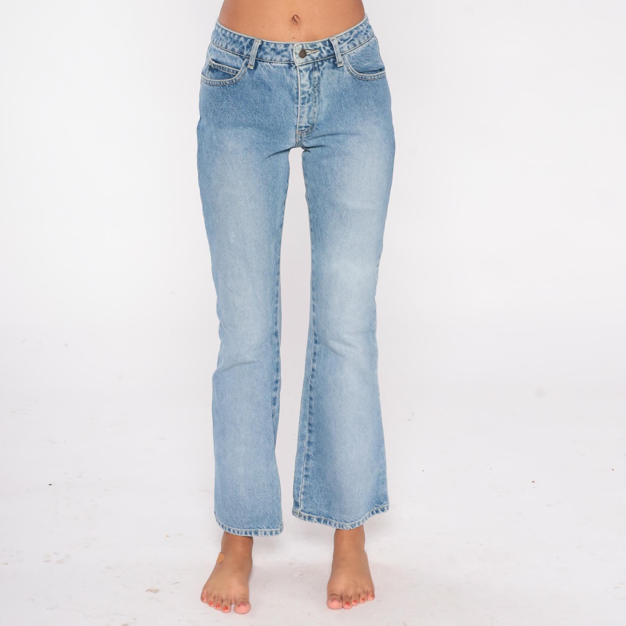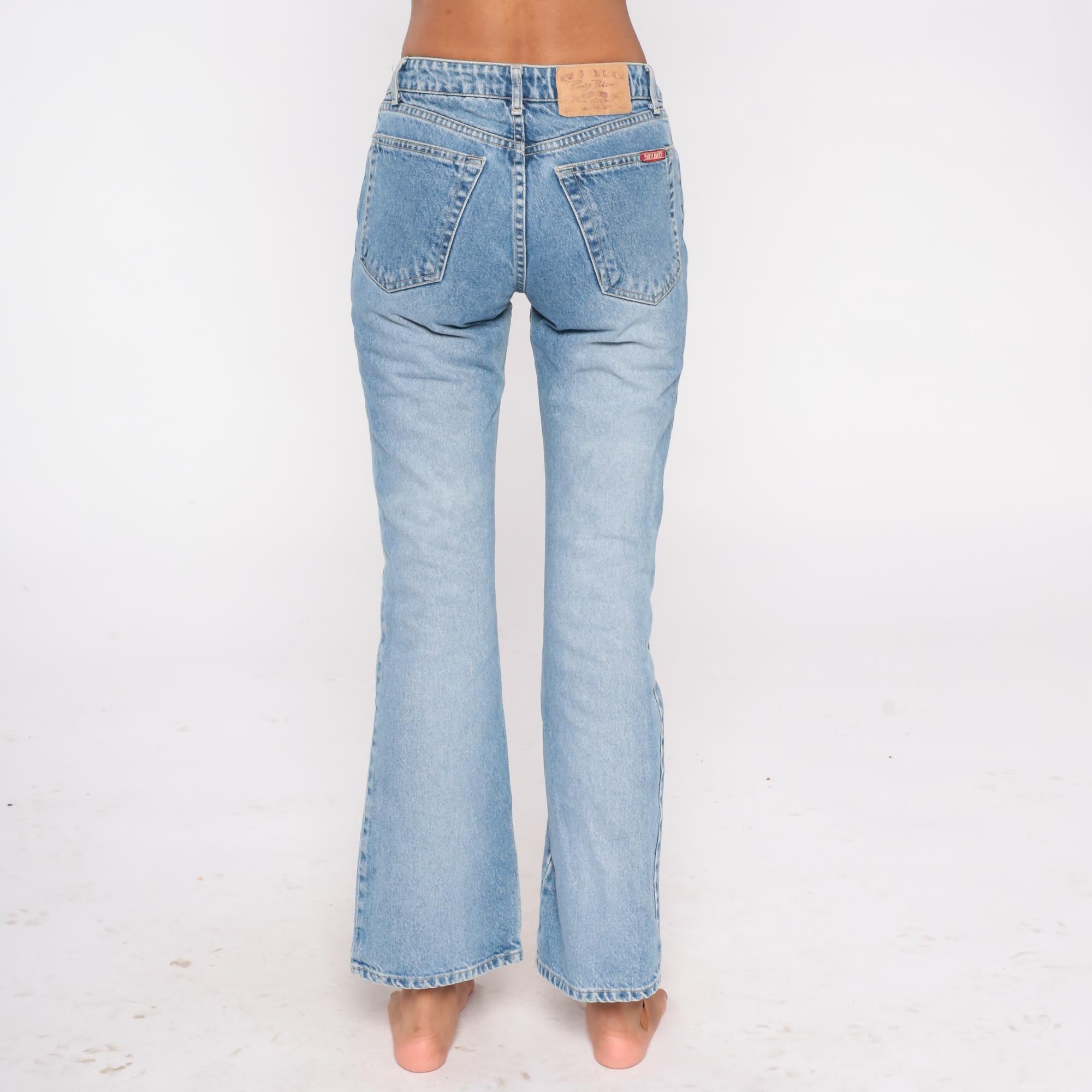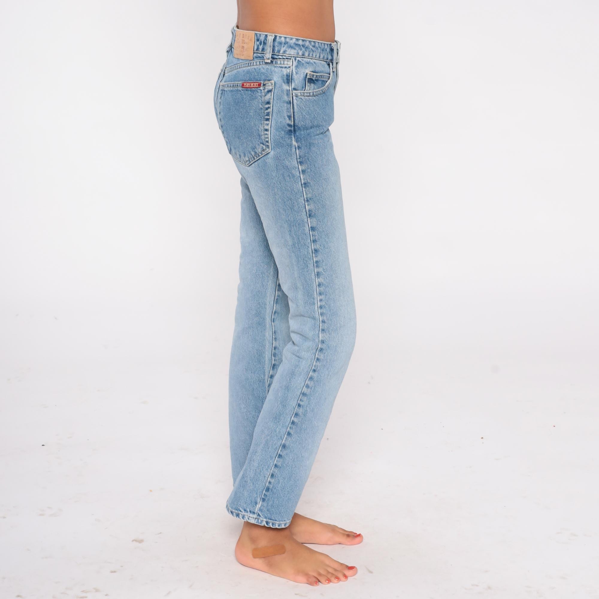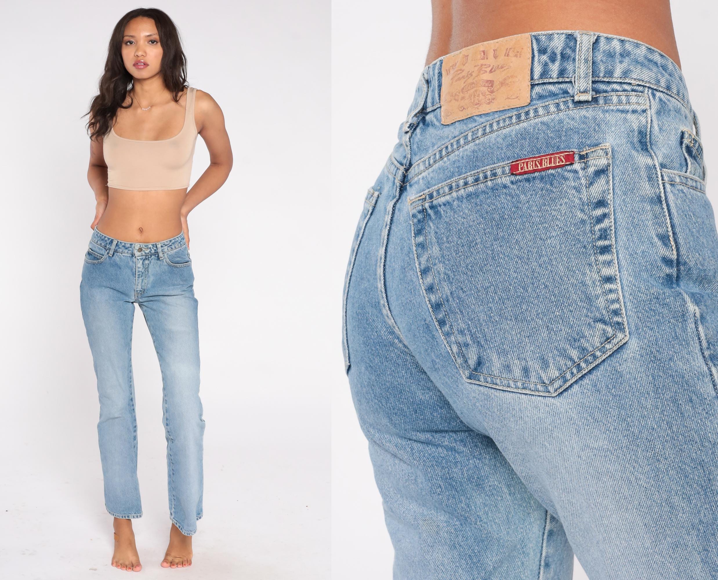 90s light wash jeans from Paris Blues. Classic straight leg silhouette with subtle flare at hem. Traditional 5-pocket design with button fly closure. Features signature Paris Blues label on back waistband and colorful inside tag. Light blue denim with minimal fading. Low rise fit sits below natural waist.