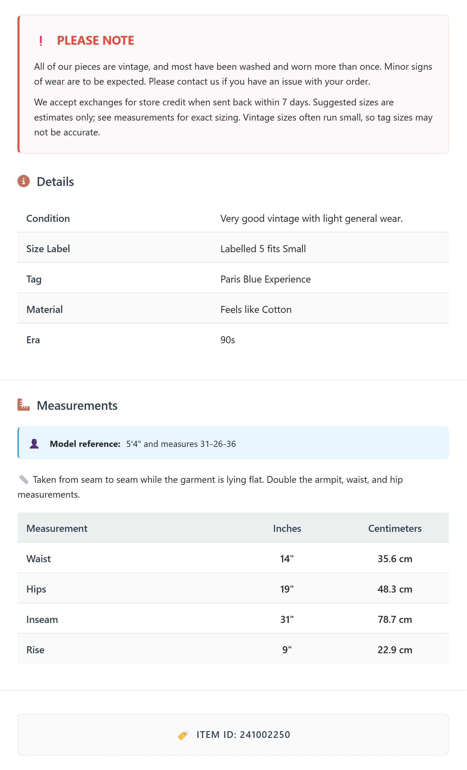 All of our pieces are vintage, and most have been washed and worn more than once. Minor signs of wear are to be expected. Please contact us if you have an issue with your order. We accept exchanges for store credit when sent back within 7 days.