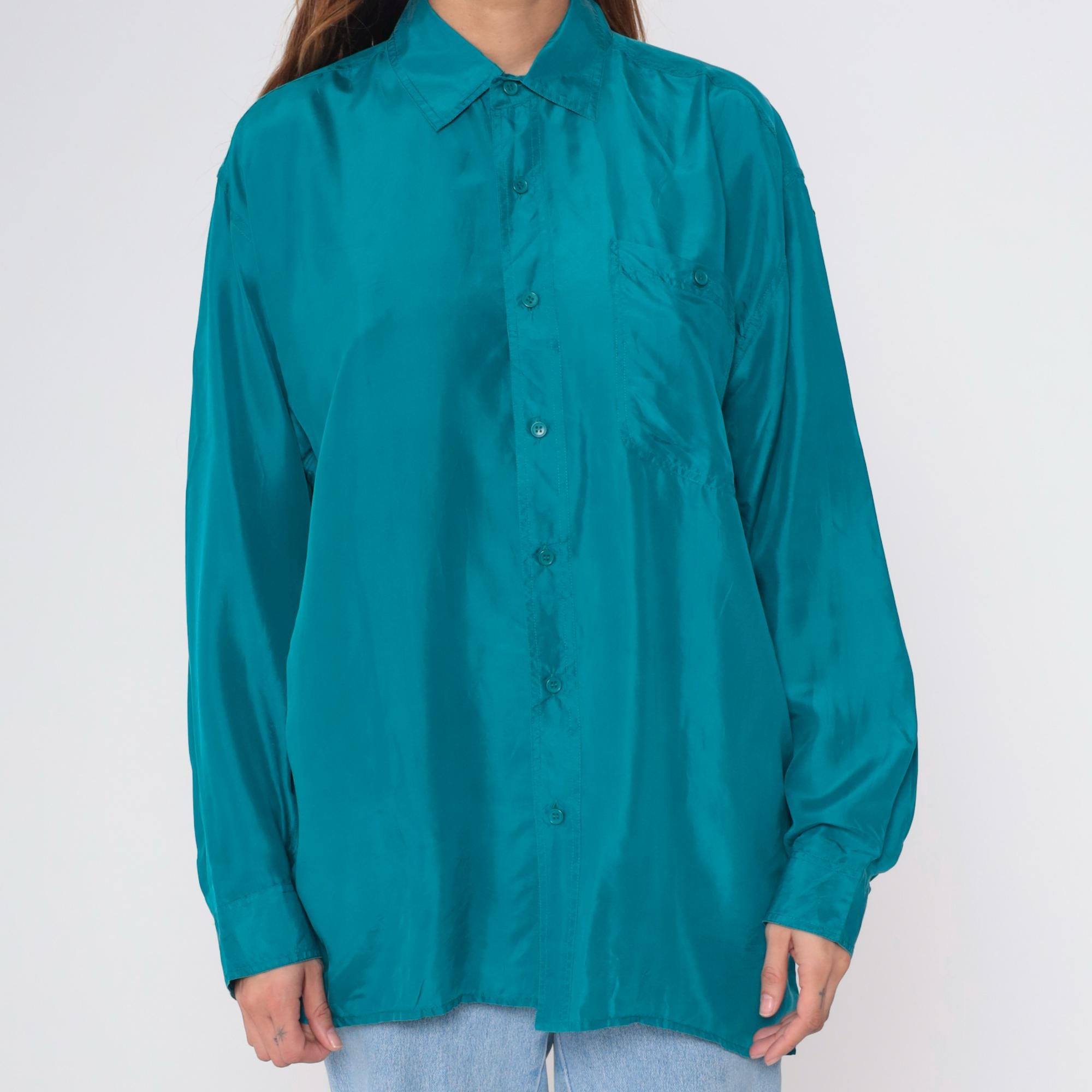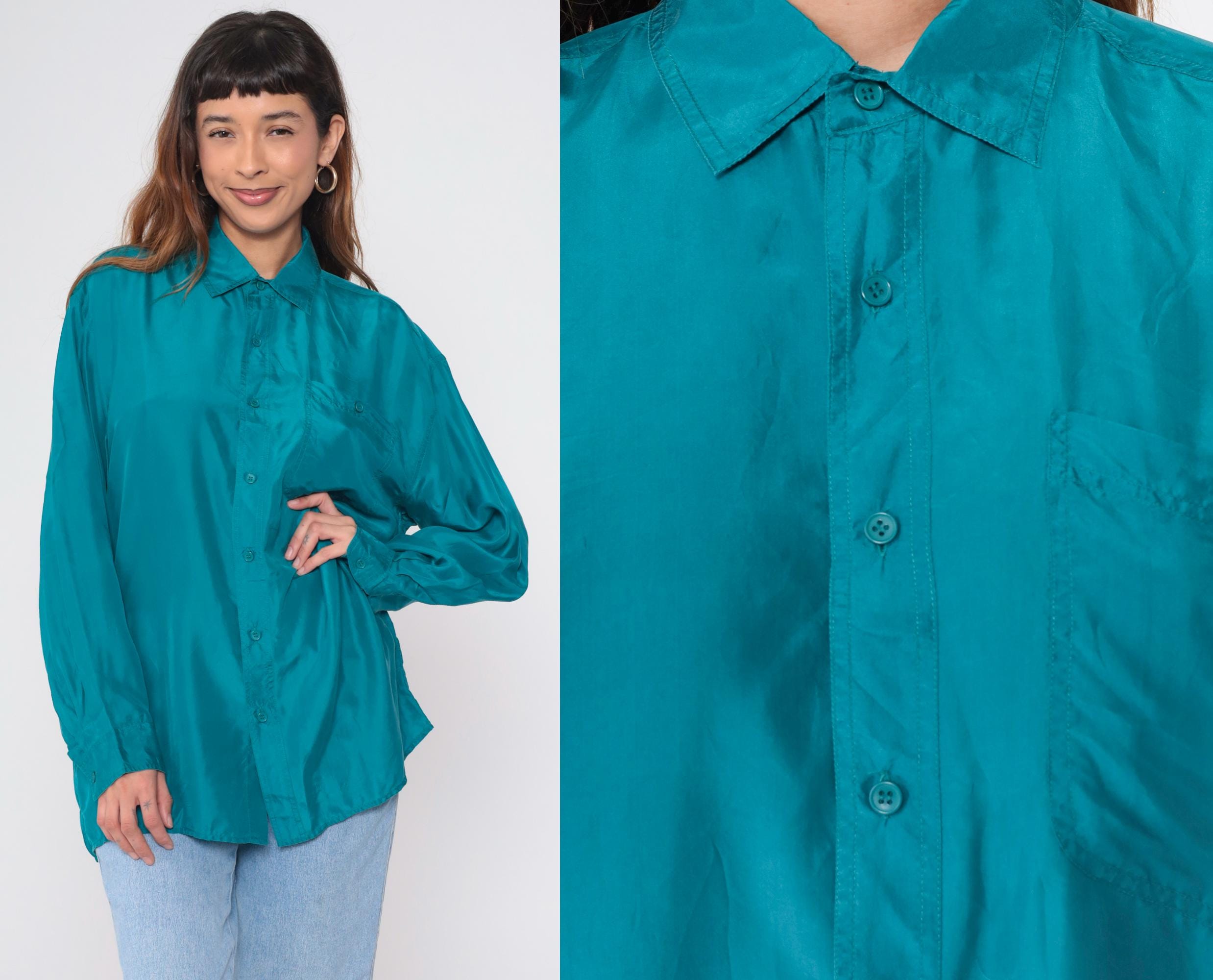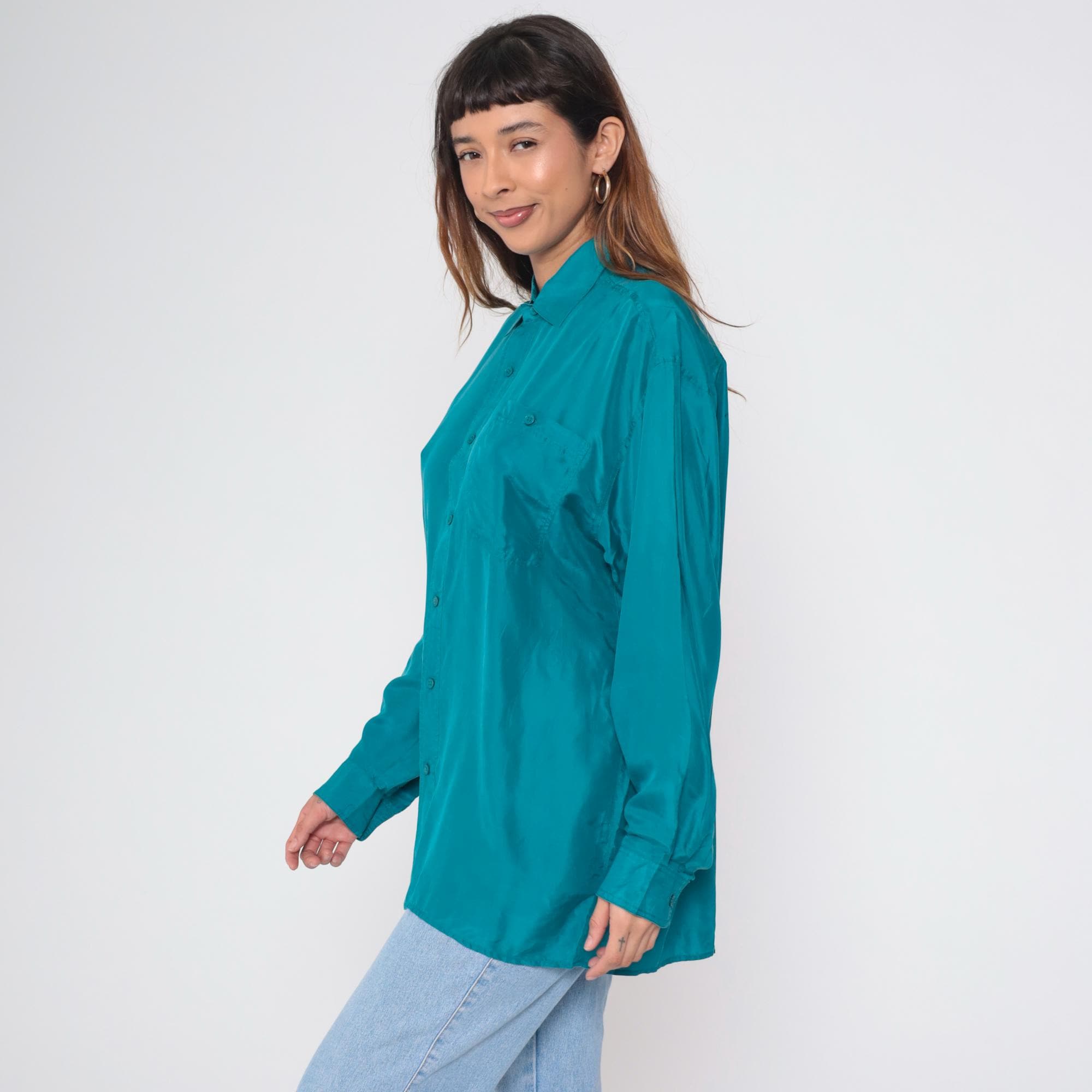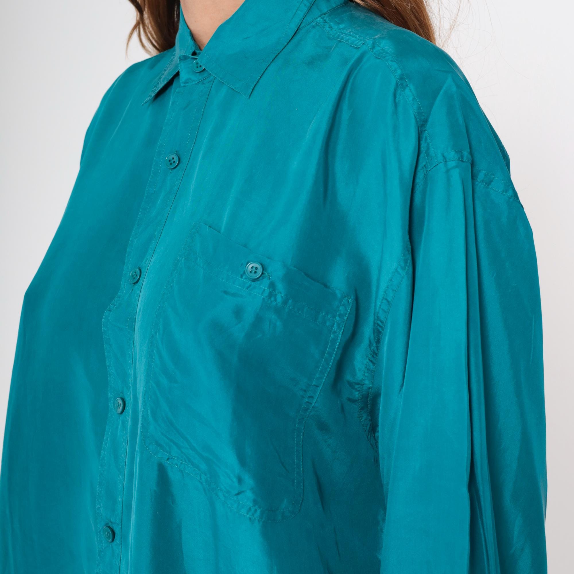 Vintage 90s blouse in olive green silk with chest pockets, long sleeves, and buttons up the front.