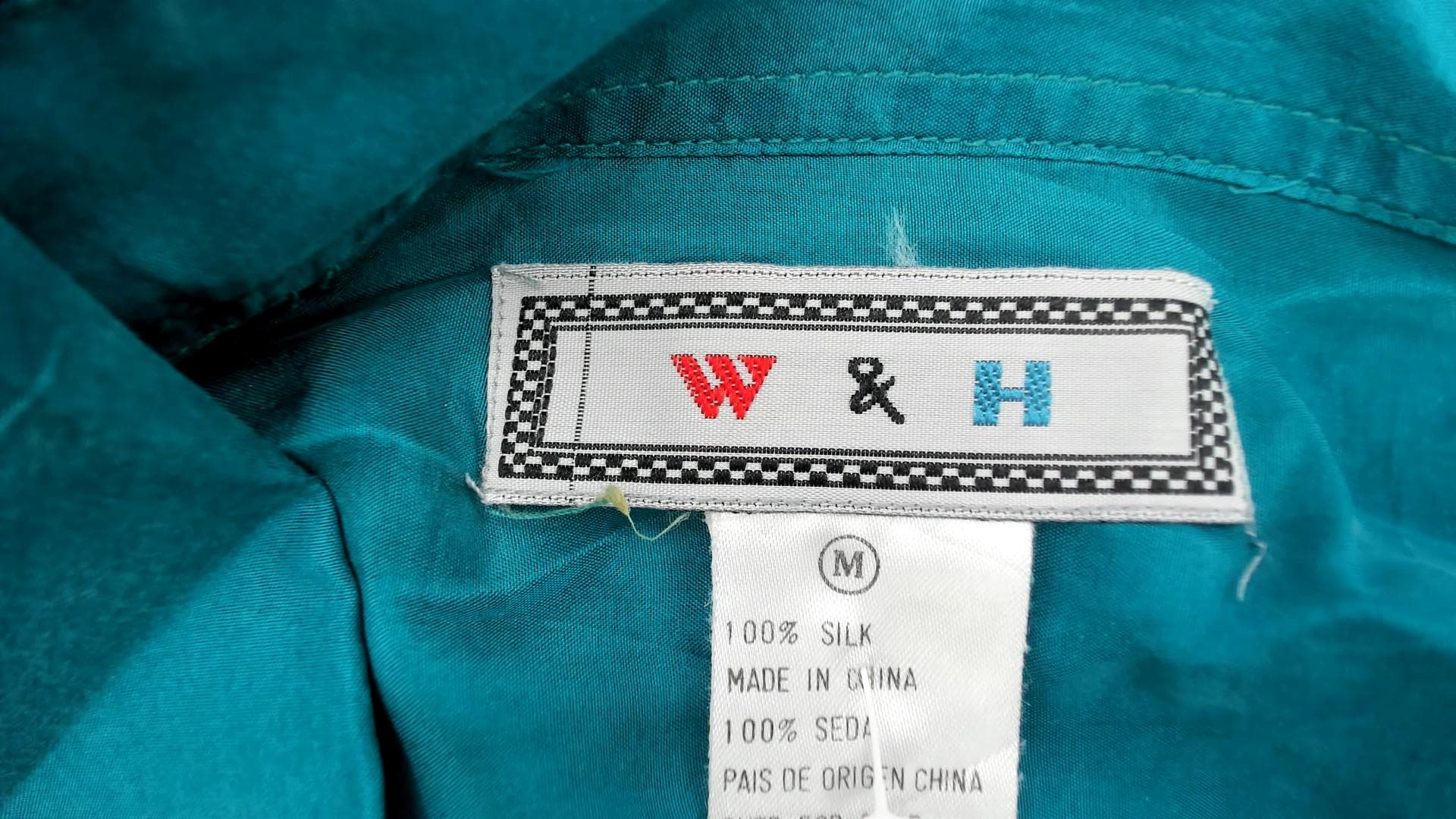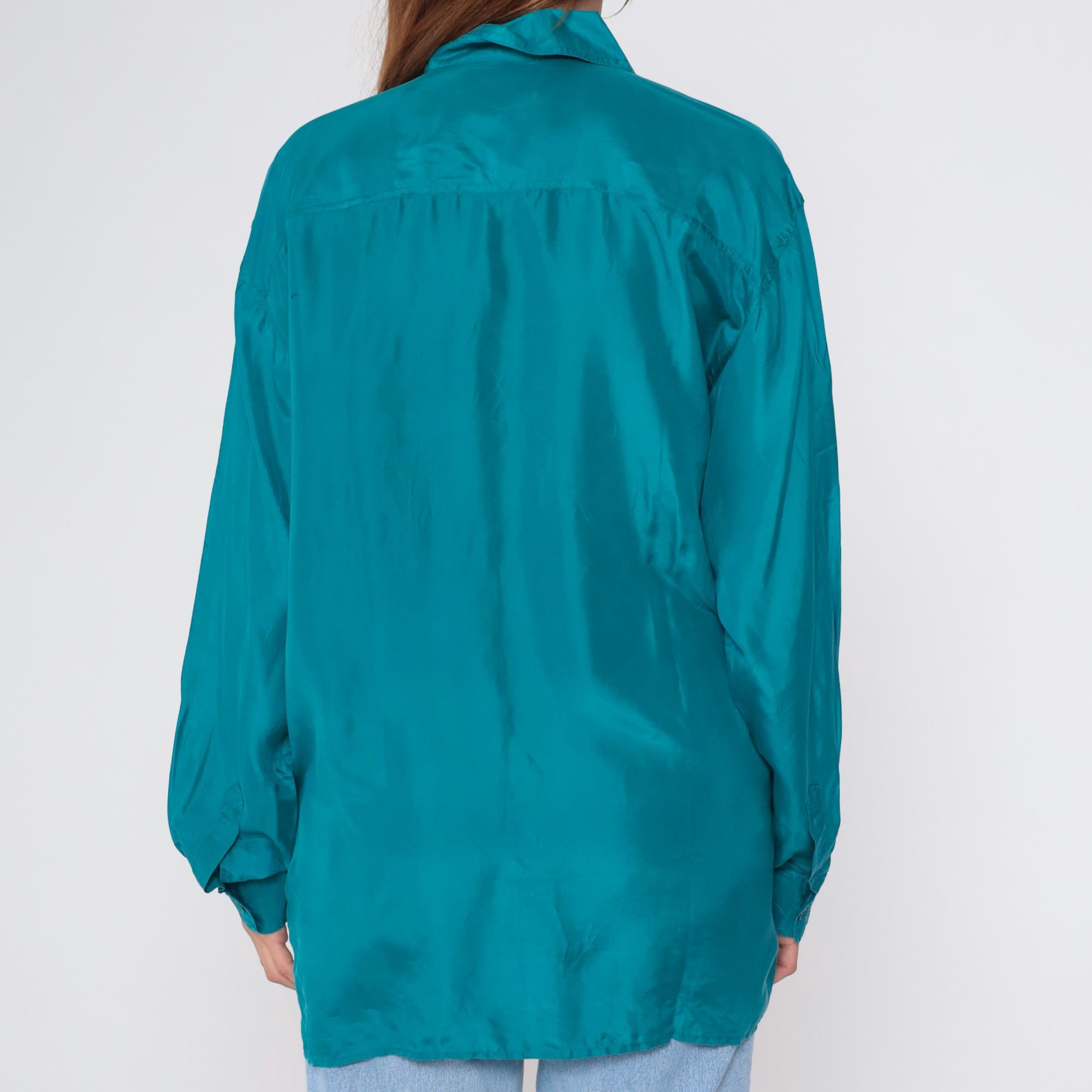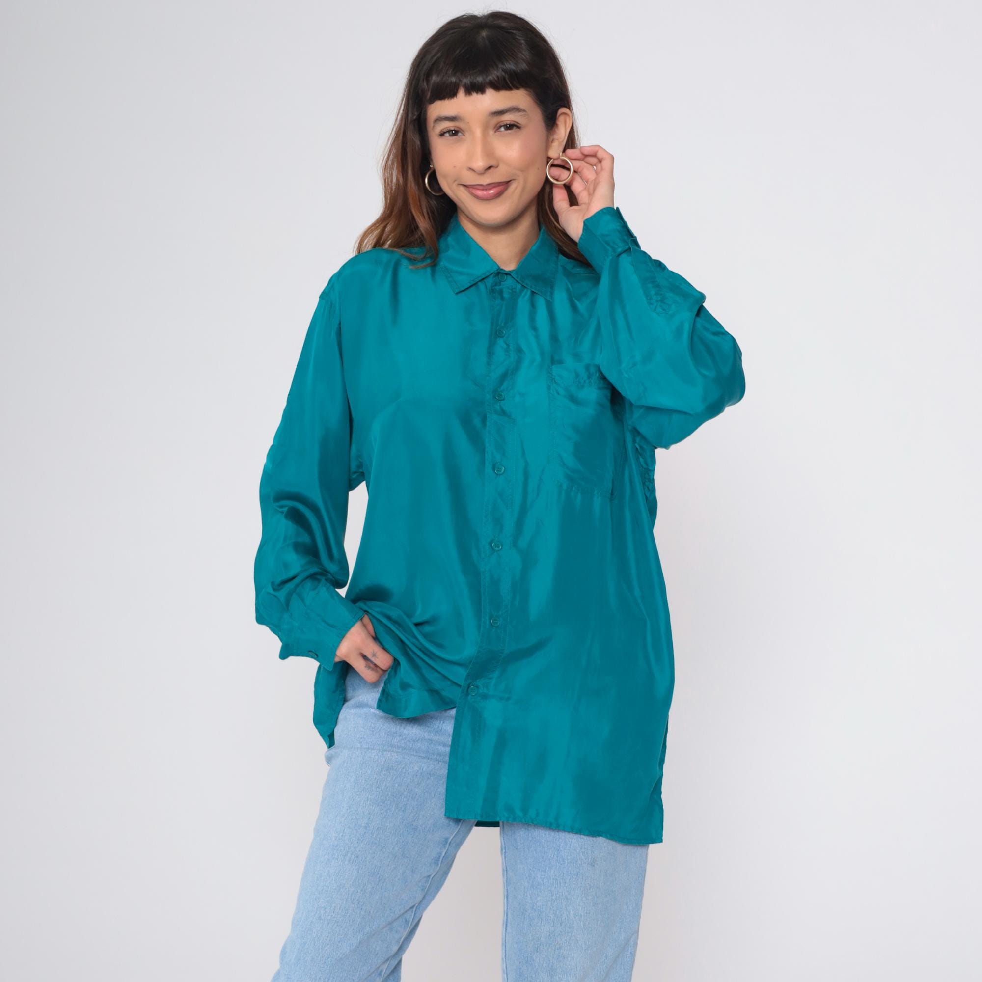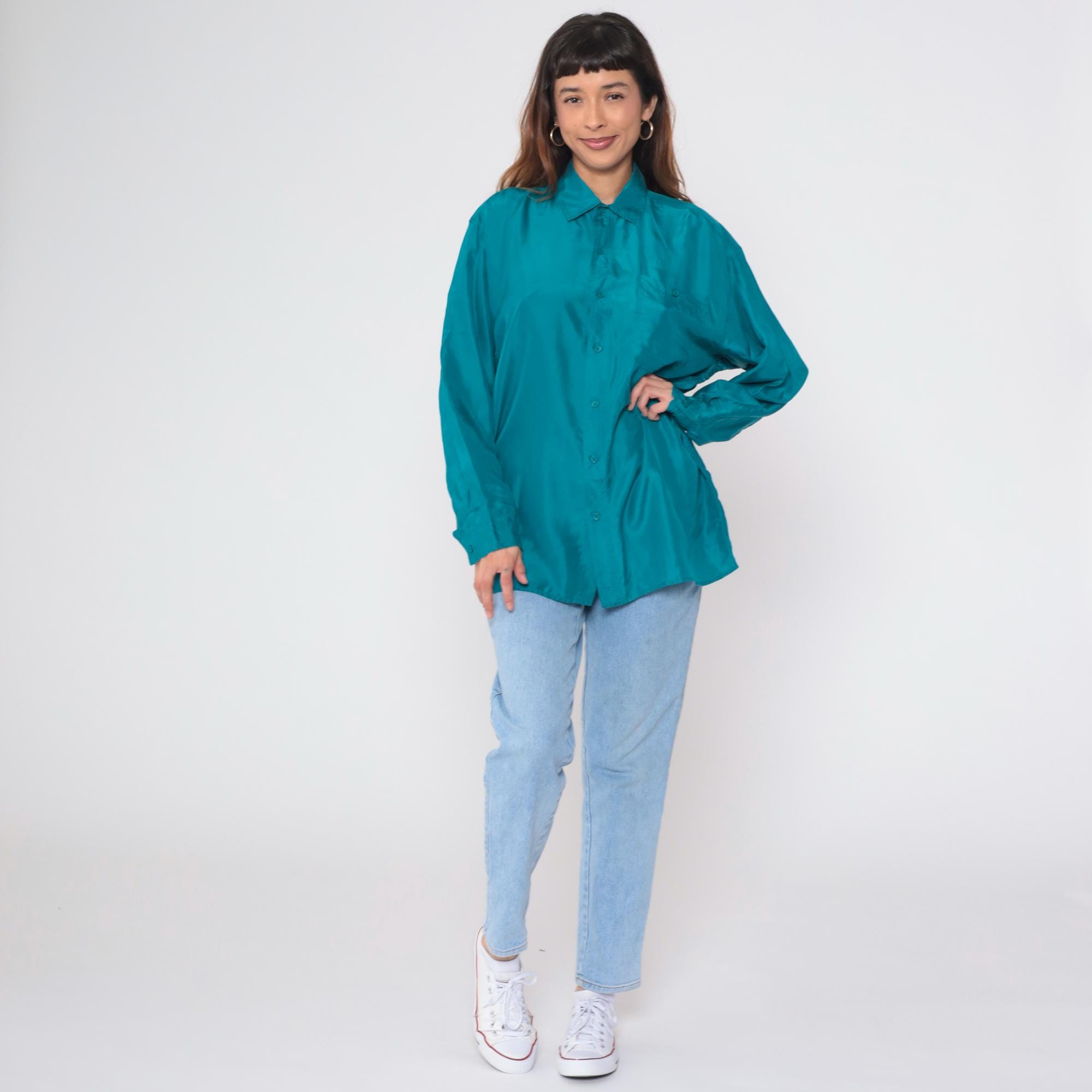 Vintage 90s blouse in olive green silk with chest pockets, long sleeves, and buttons up the front.