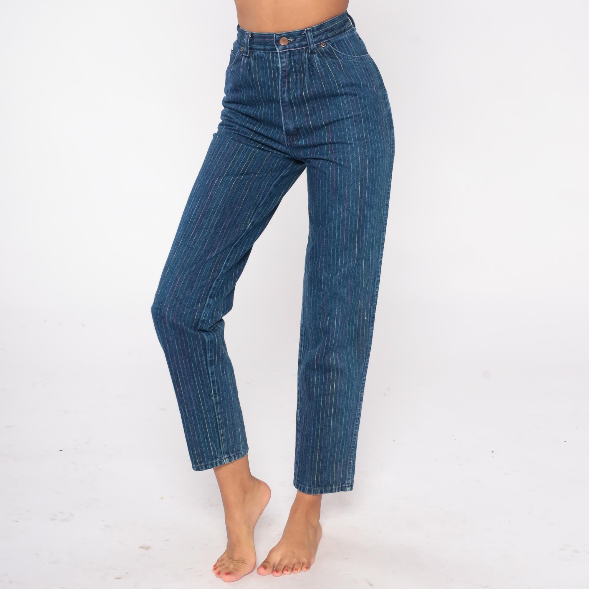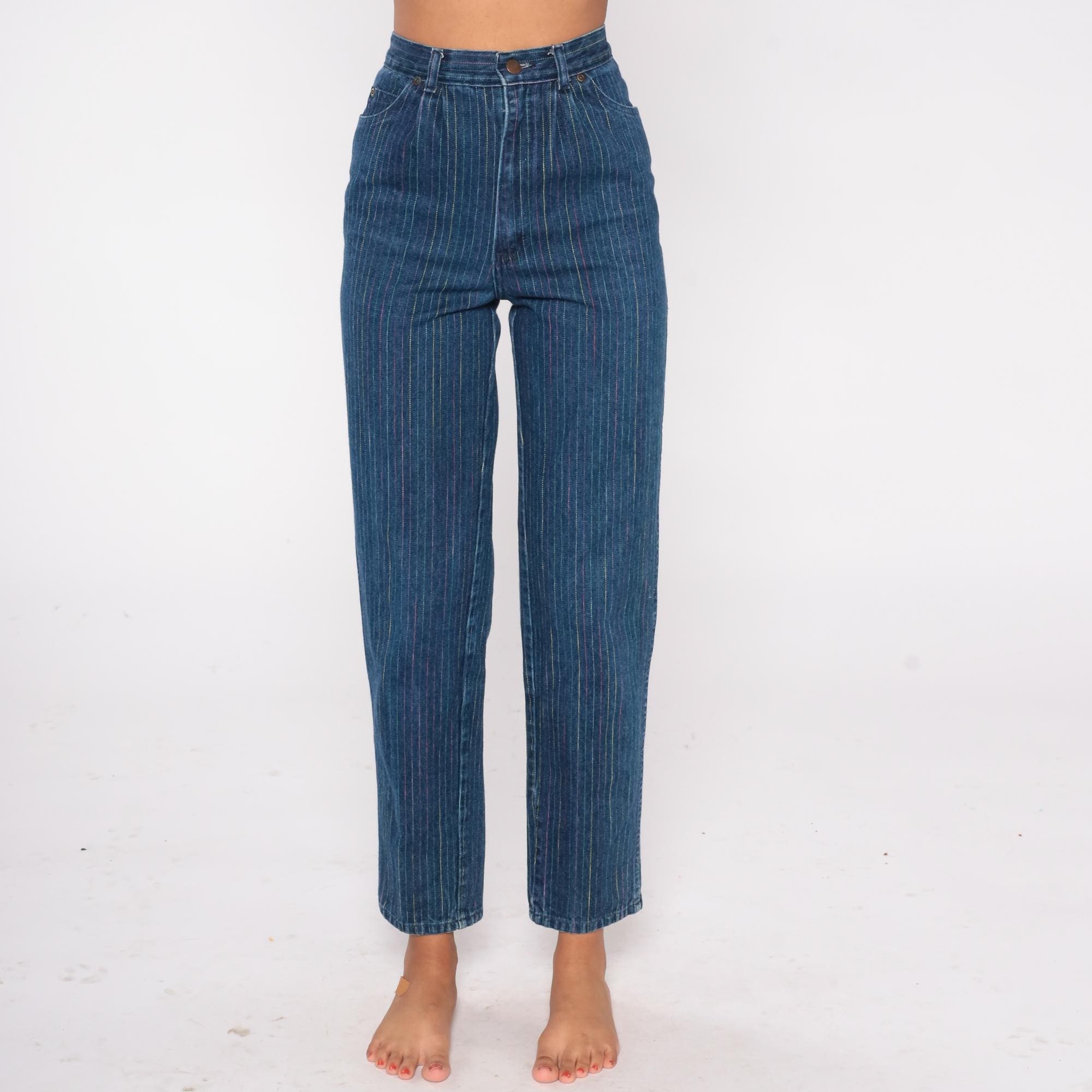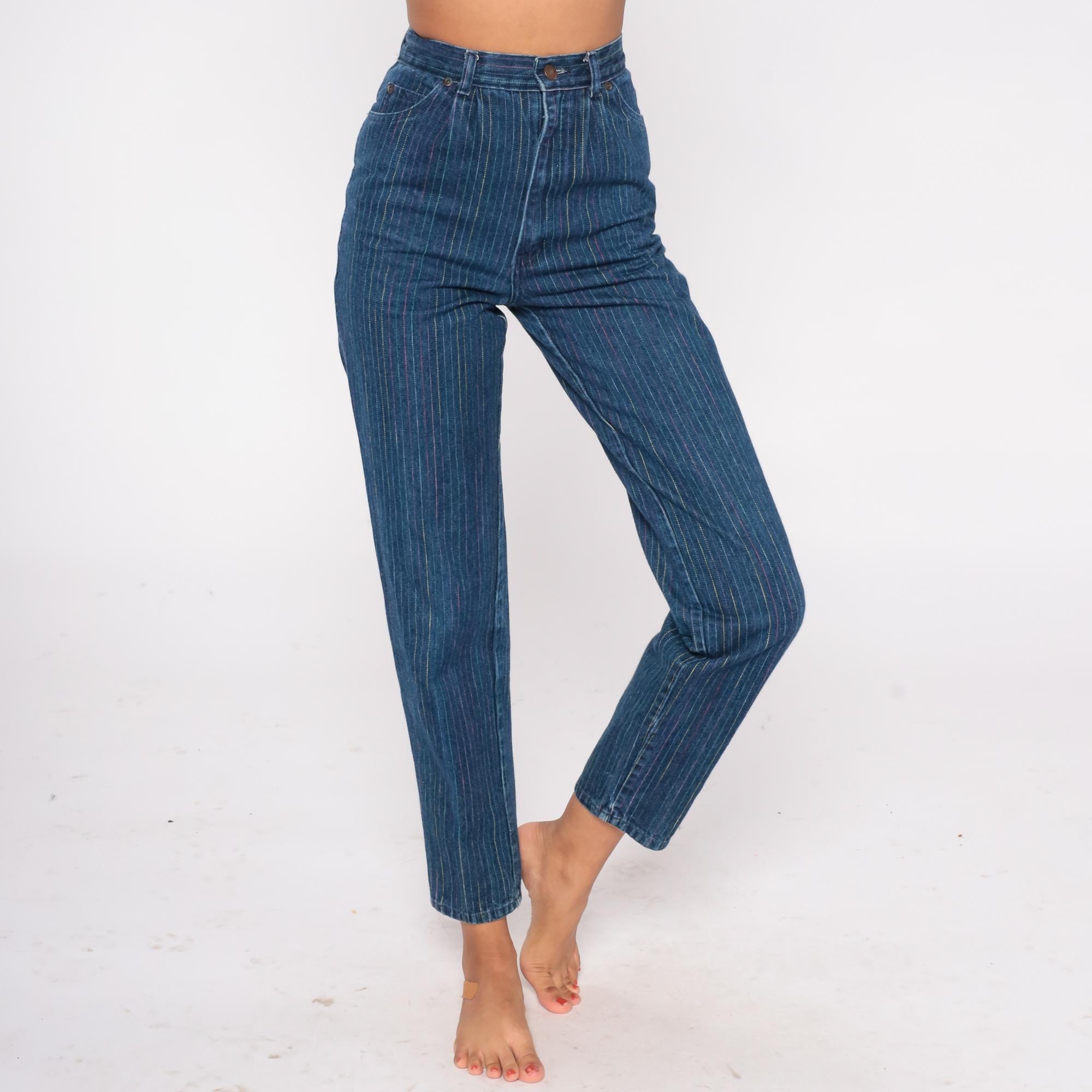 90s high waist jeans featuring unique multicolor pinstripes on medium blue denim. Vertical rainbow stripes in pink, yellow, green, and blue threads create distinctive pattern throughout. Classic mom jean silhouette with straight leg cut. High rise sits at natural waist. Traditional 5-pocket styling with distinctive curved back pockets. Front button and zip closure.