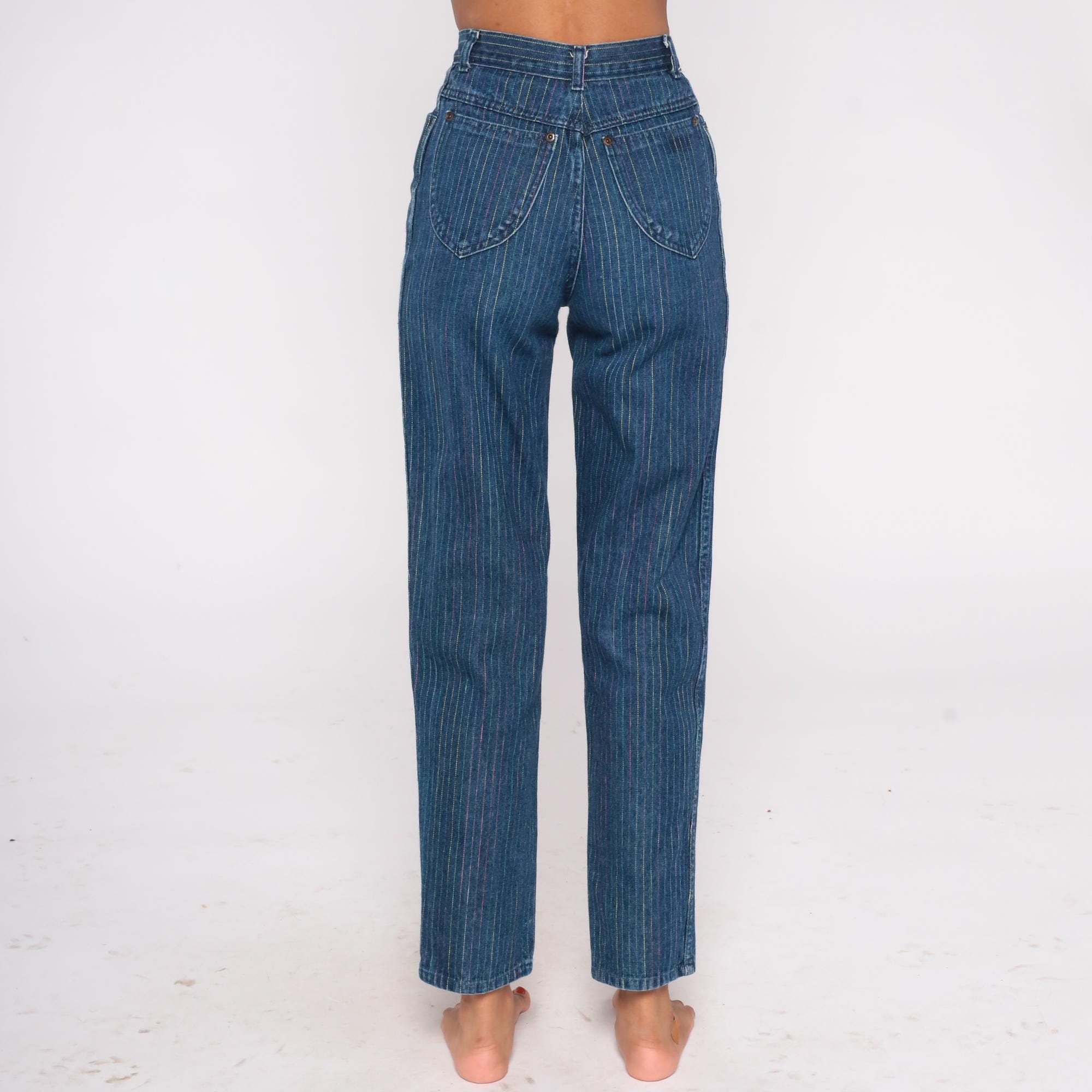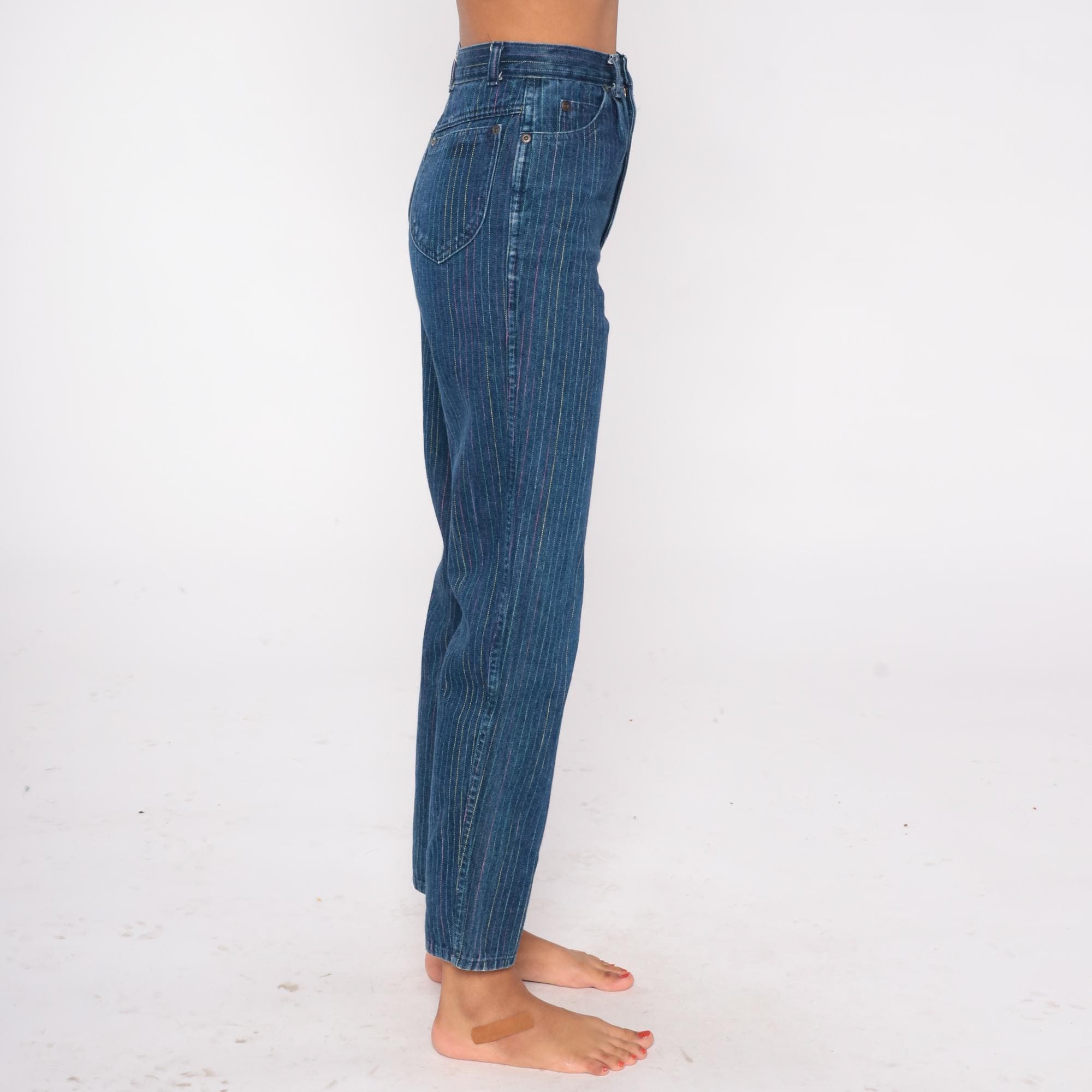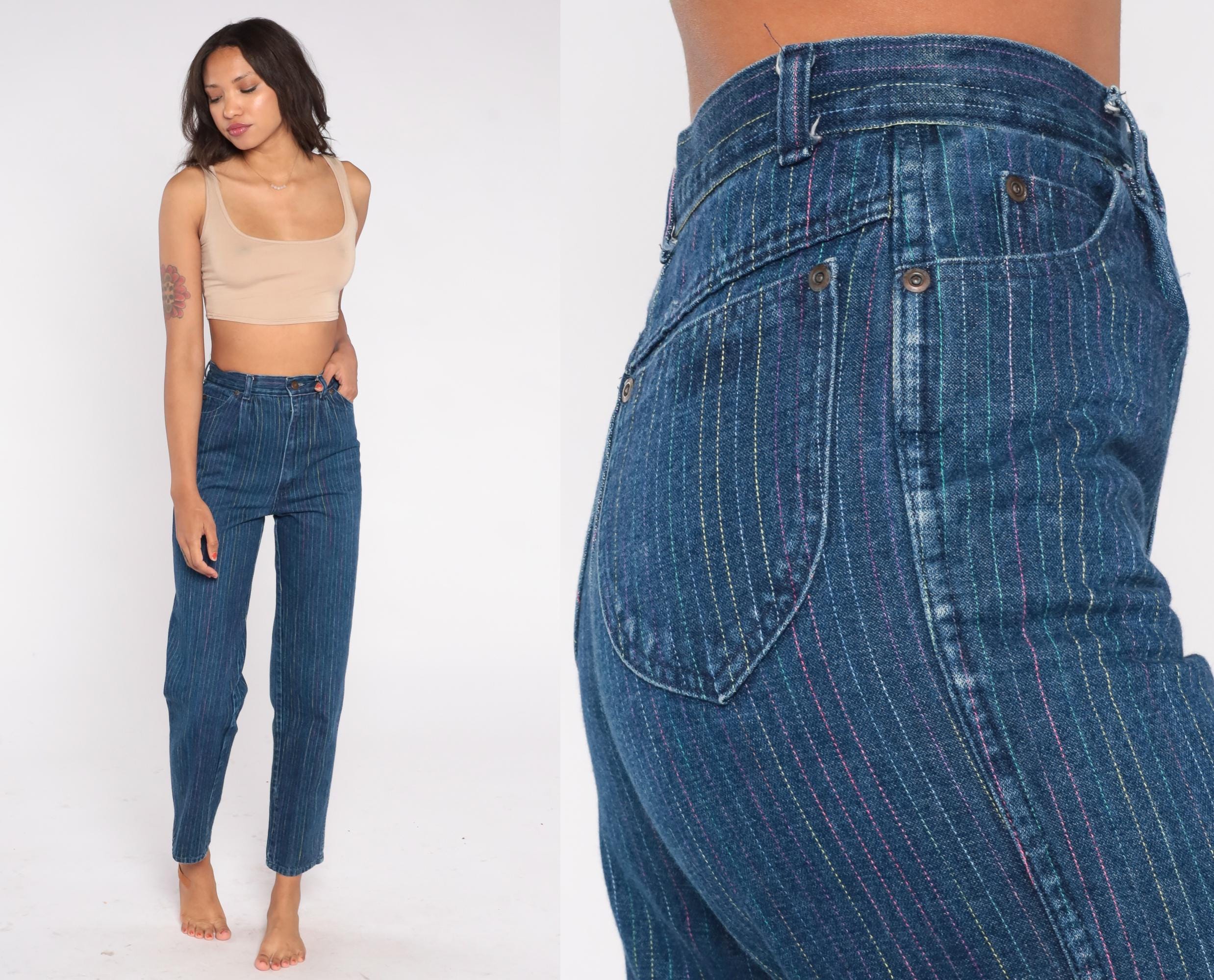 90s high waist jeans featuring unique multicolor pinstripes on medium blue denim. Vertical rainbow stripes in pink, yellow, green, and blue threads create distinctive pattern throughout. Classic mom jean silhouette with straight leg cut. High rise sits at natural waist. Traditional 5-pocket styling with distinctive curved back pockets. Front button and zip closure.