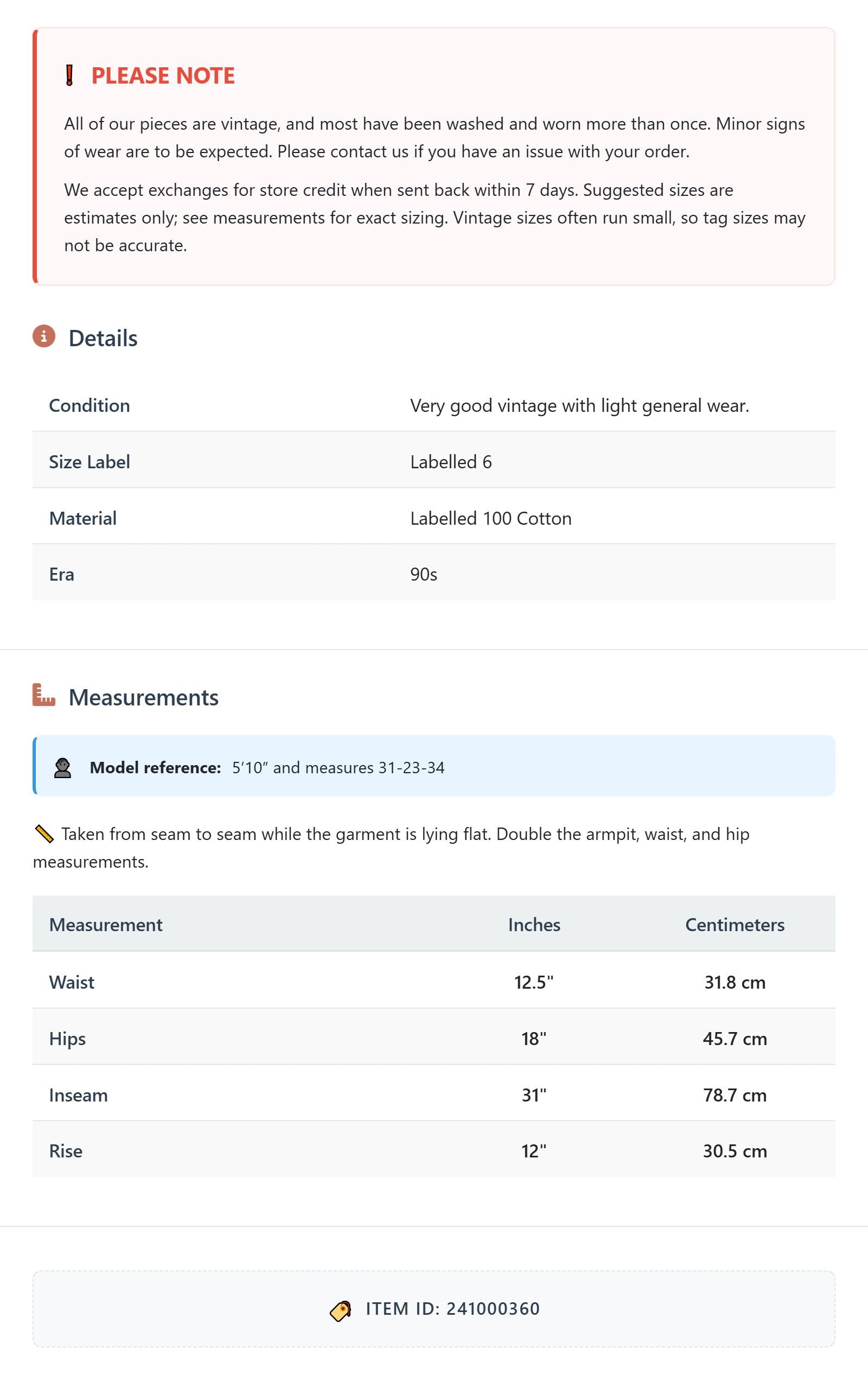 Vintage denim was usually made without any stretch, unlike modern jeans. Check the measurements to ensure proper fit, and remember to give yourself a little wiggle room in the waist and hips, depending on your preferred fit.