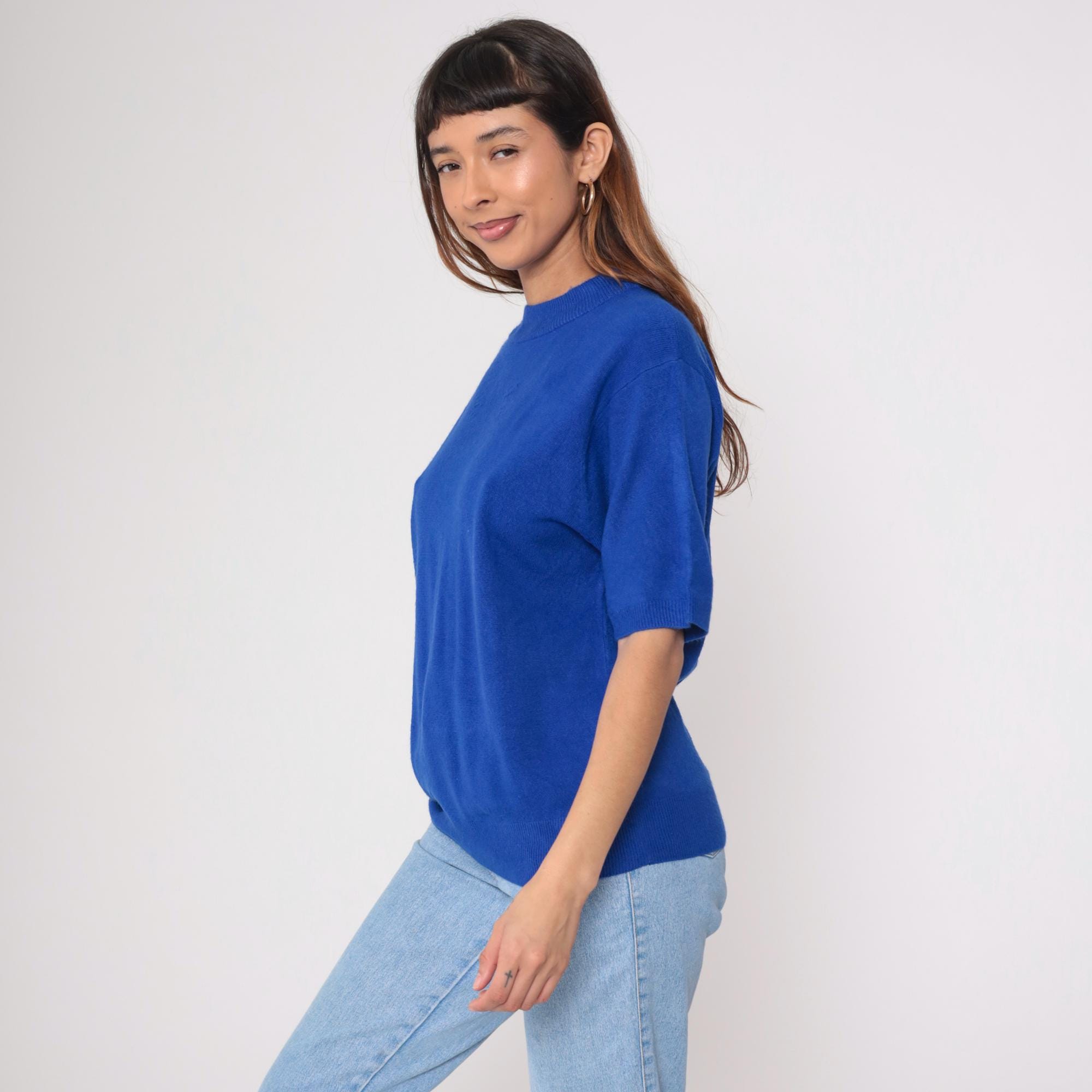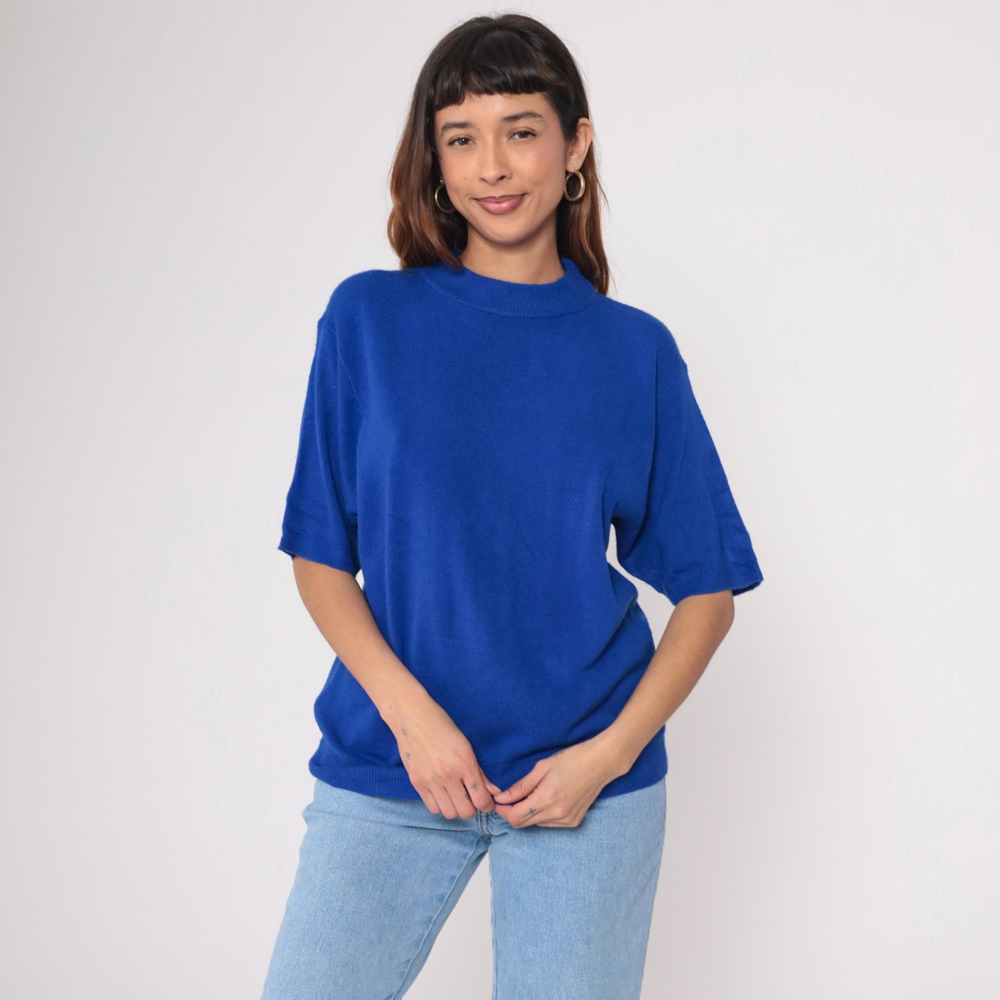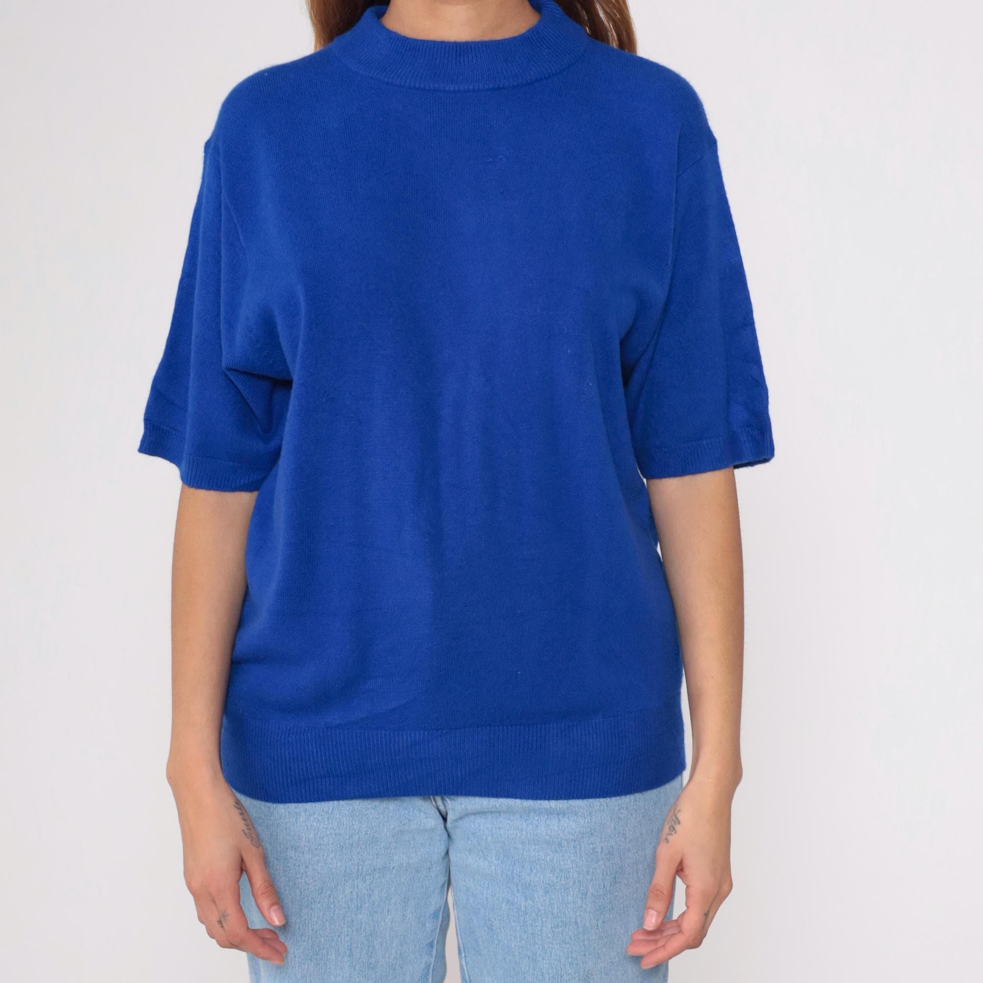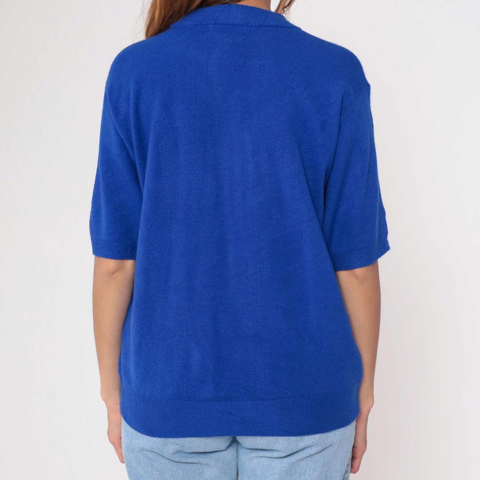 Vintage 90s short sleeve sweater in vibrant royal blue. Features a classic crew neck with ribbed collar, cuffs, and hem. Relaxed, slightly boxy fit with clean lines.
