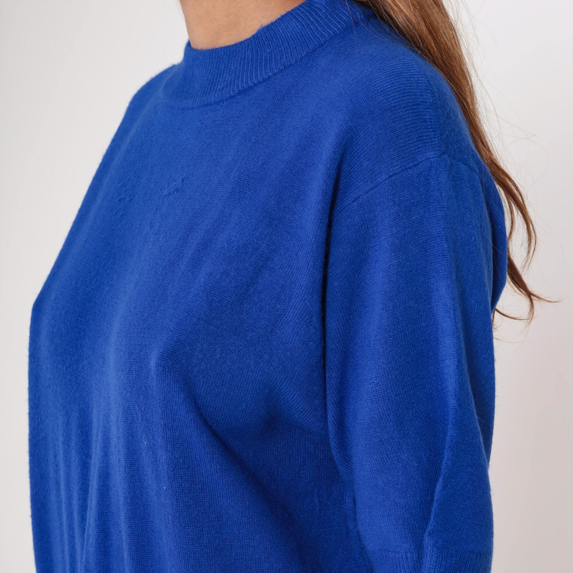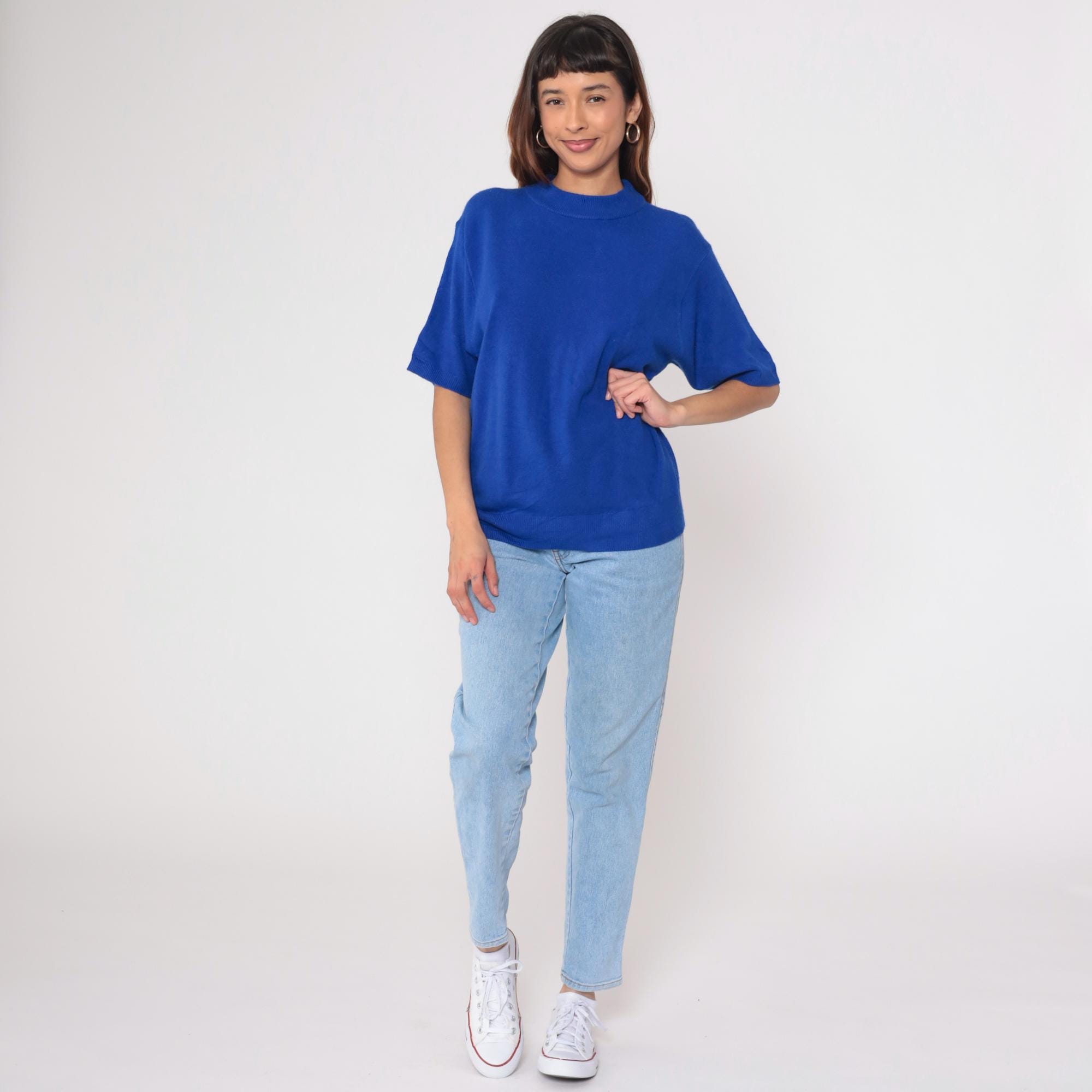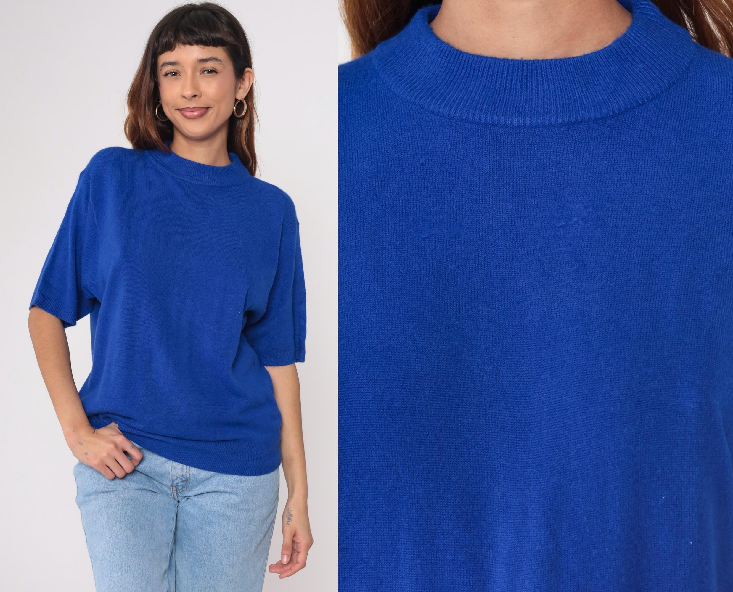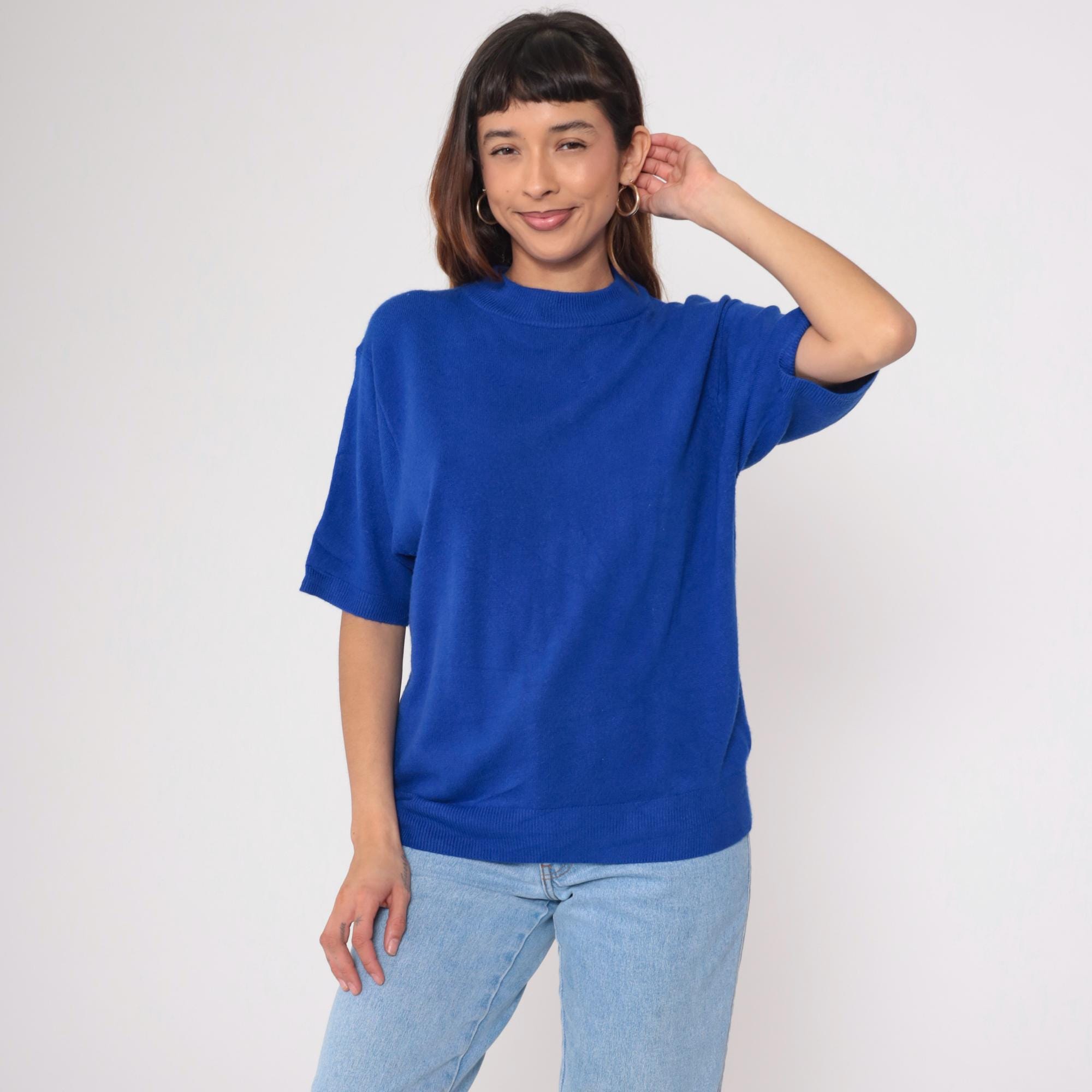 Vintage 90s short sleeve sweater in vibrant royal blue. Features a classic crew neck with ribbed collar, cuffs, and hem. Relaxed, slightly boxy fit with clean lines.