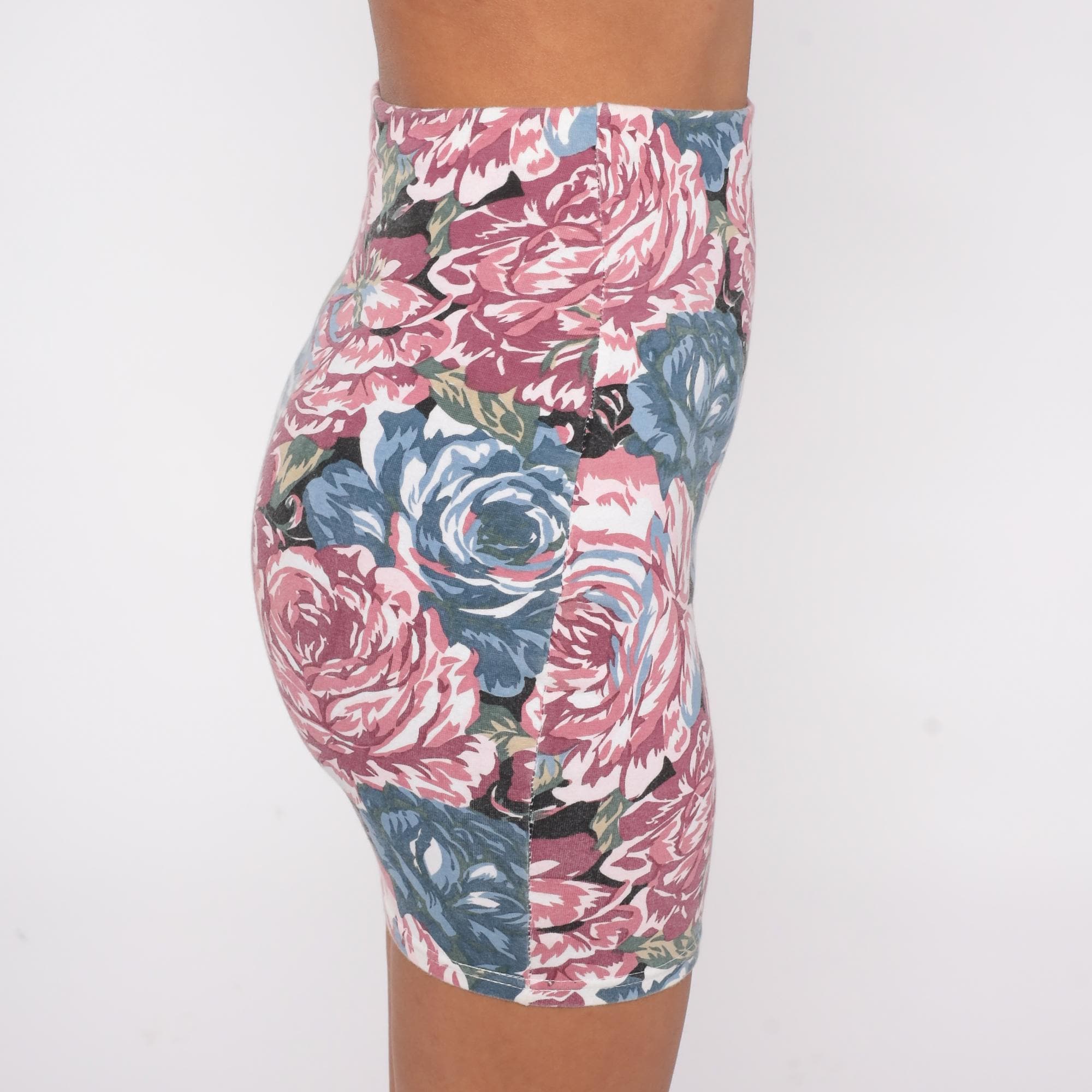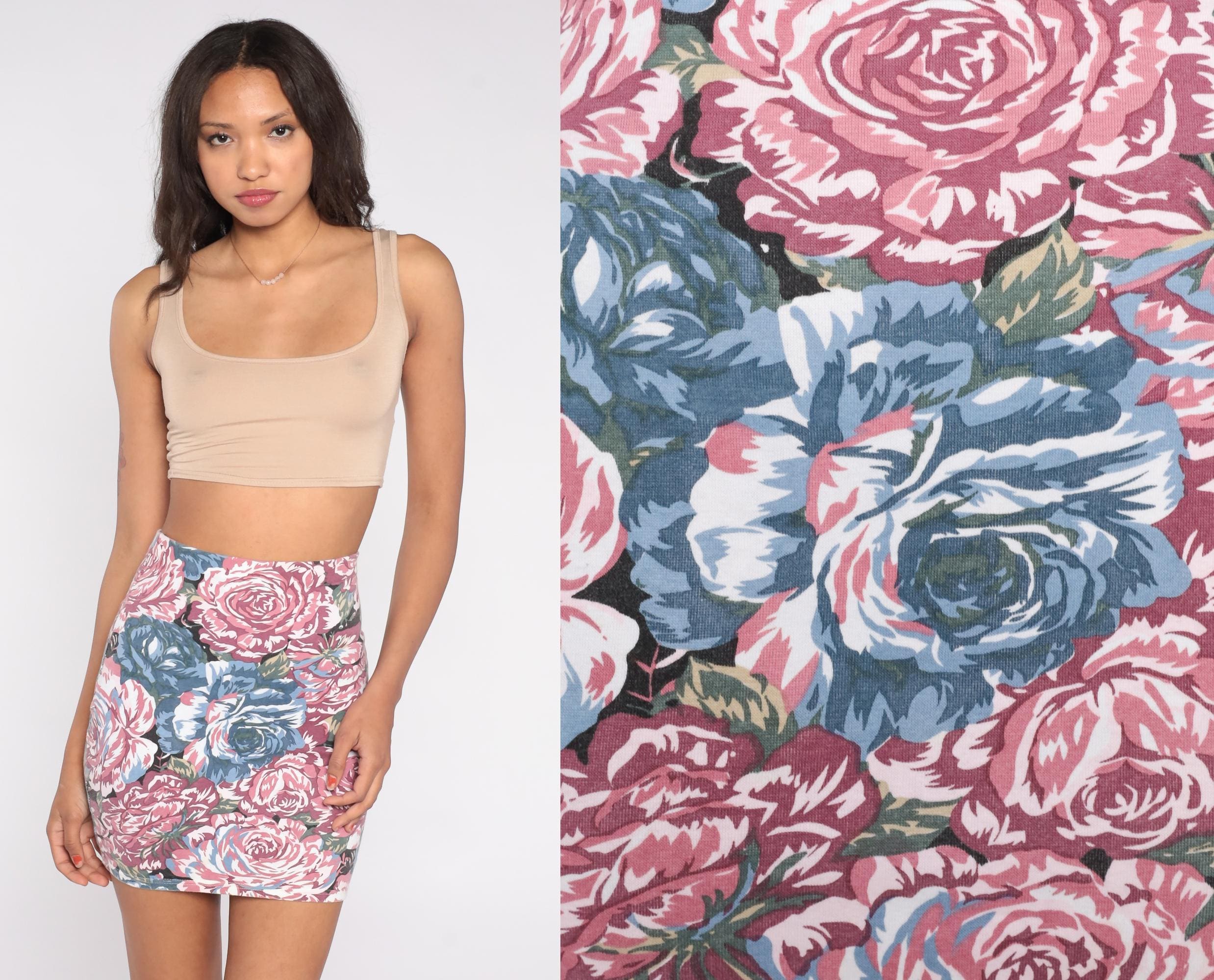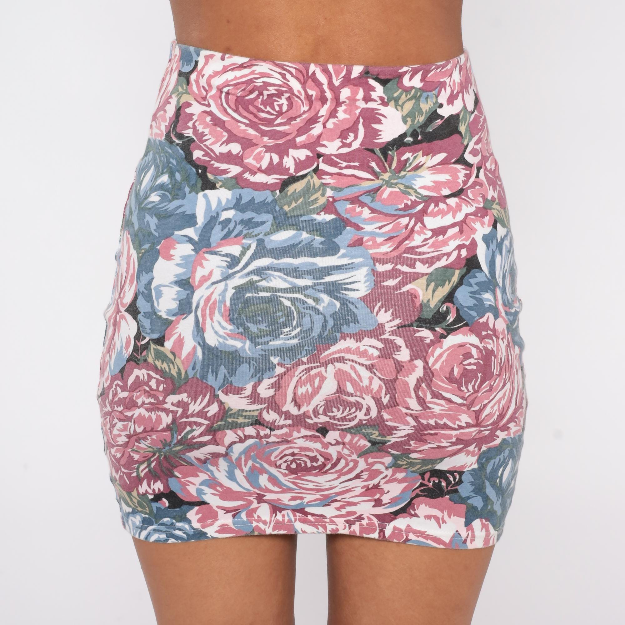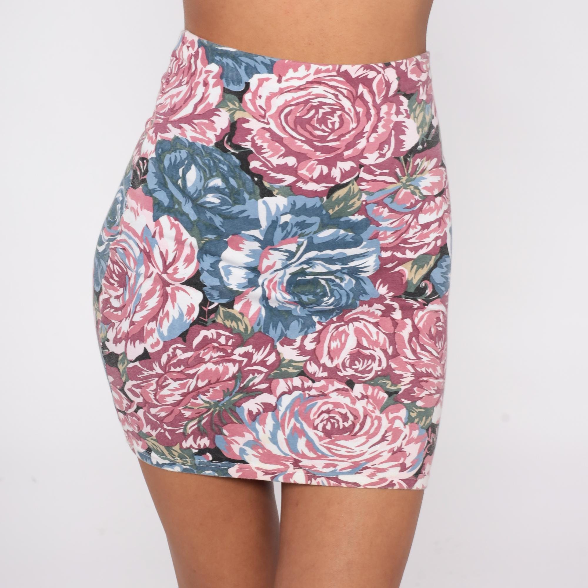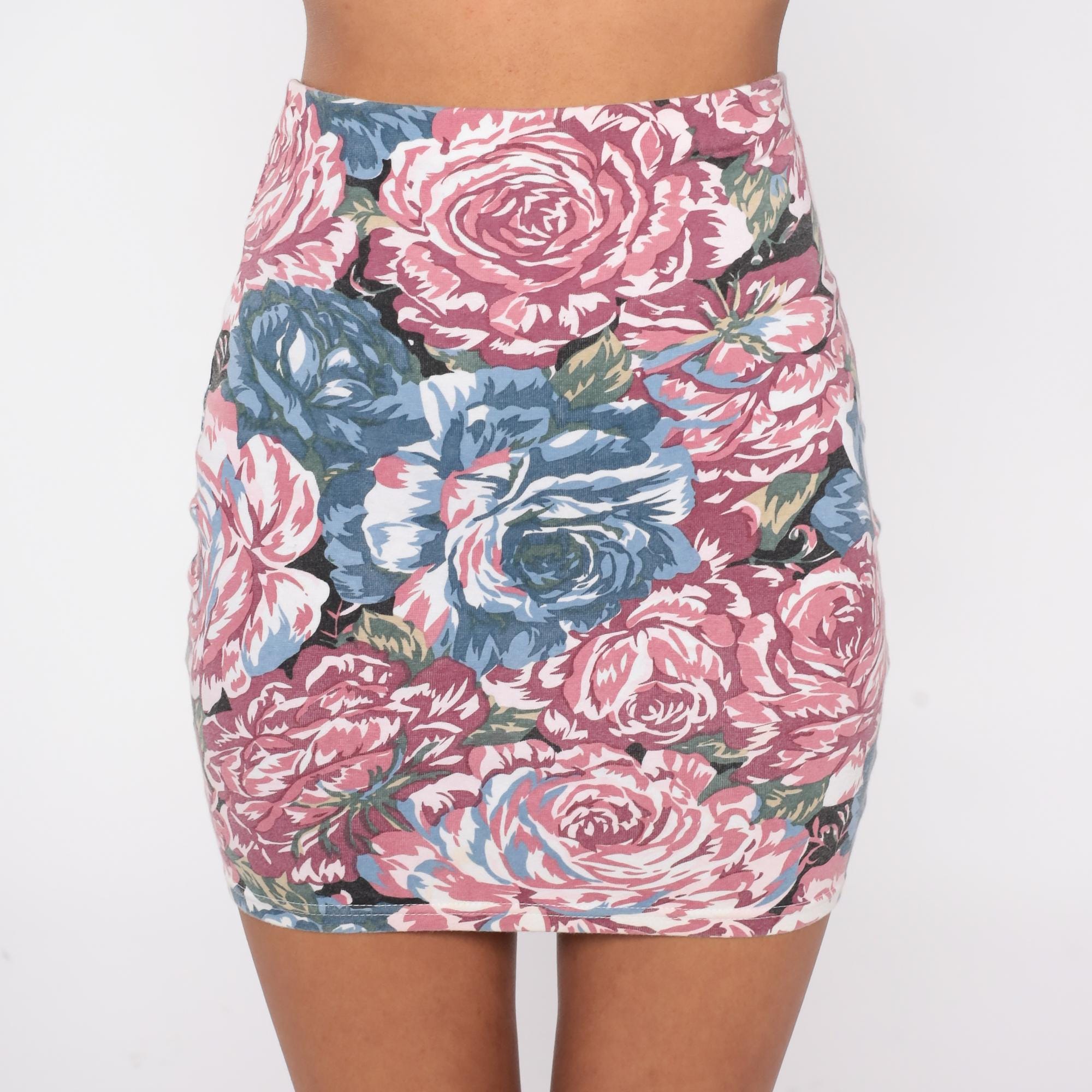 90s floral mini skirt by Express featuring bold rose print in pink and blue tones. Form-fitting bodycon silhouette with high waist design. Vibrant large-scale rose pattern throughout with pink and dusty blue blooms against black background. No closure - pulls on with elastic waistband.