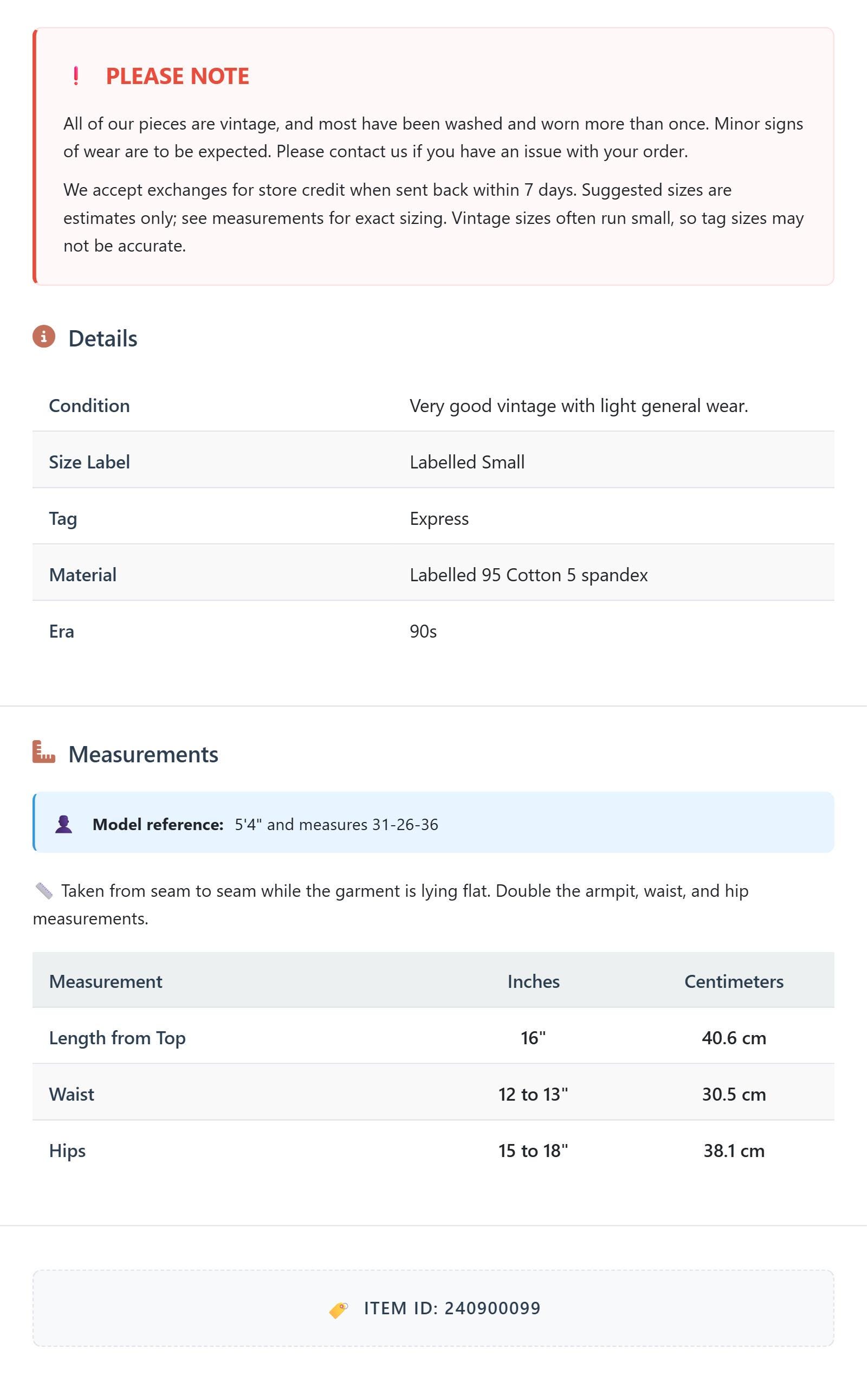All of our pieces are vintage, and most have been washed and worn more than once. Minor signs of wear are to be expected. Please contact us if you have an issue with your order. We accept exchanges for store credit when sent back within 7 days.